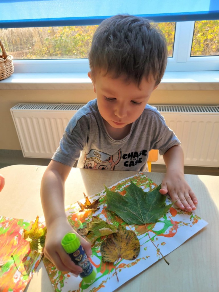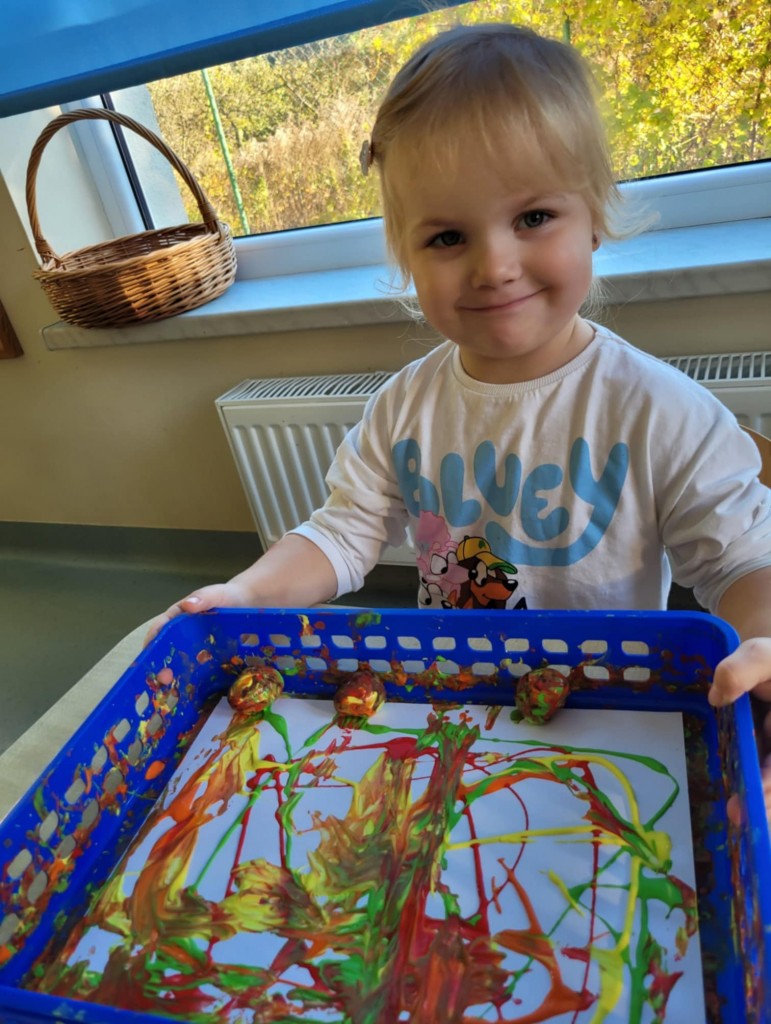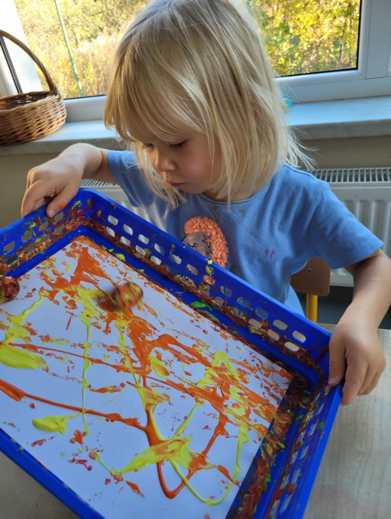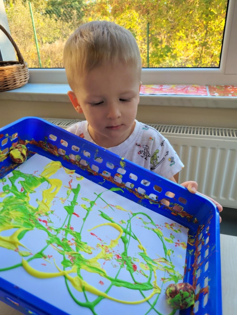 Najpierw dzieci doświadczyły techniki malowania kasztanami, następnie po zebraniu liści przyklejały je komponując piękne prace - na wcześniej przygotowanej kartce.
