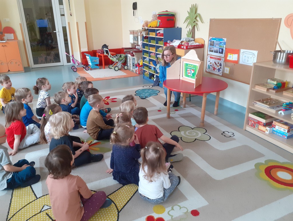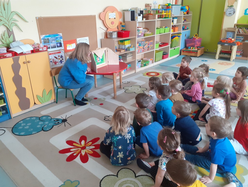 W marcu, po raz kolejny już w tym roku szkolnym, odwiedziła nas pani z Biblioteki Pedagogicznej. Tym razem obejrzeliśmy teatrzyk zatytułowany „Kamyczek w bibliotece”, który nawiązywał do bloku tematycznego poświęconego książkom.