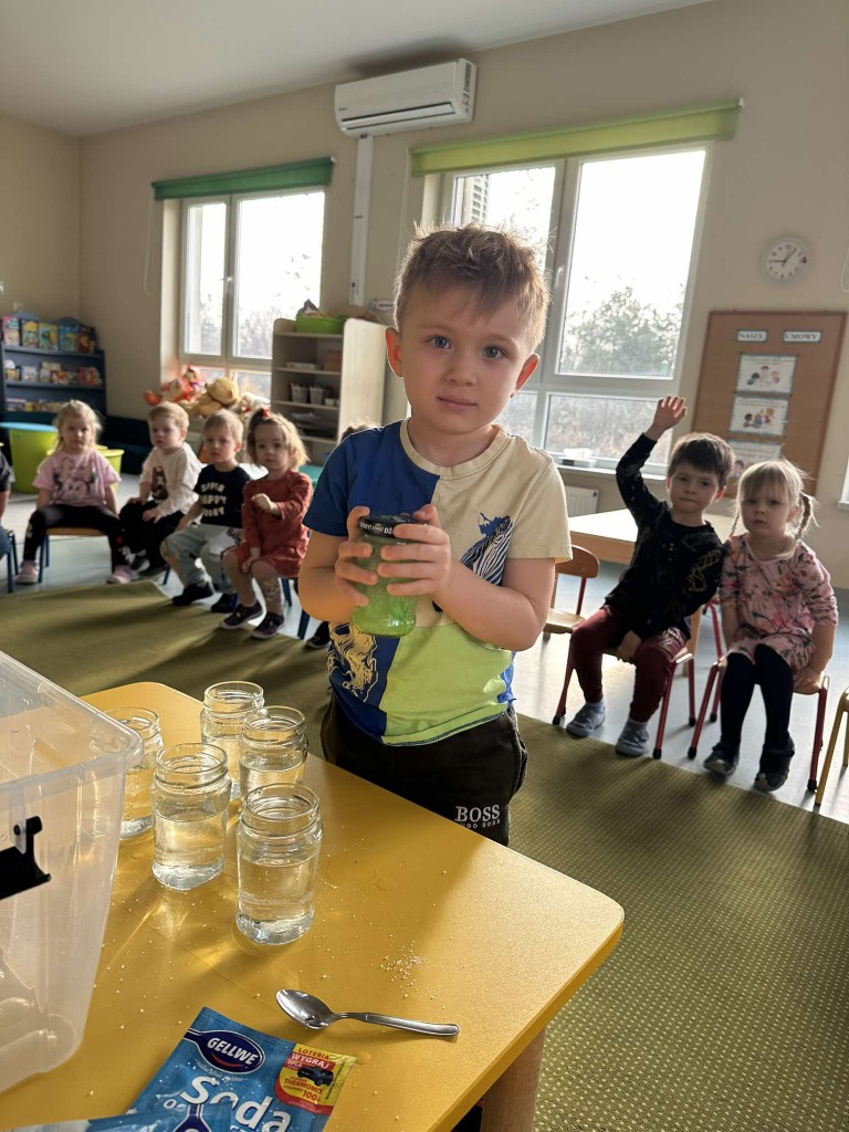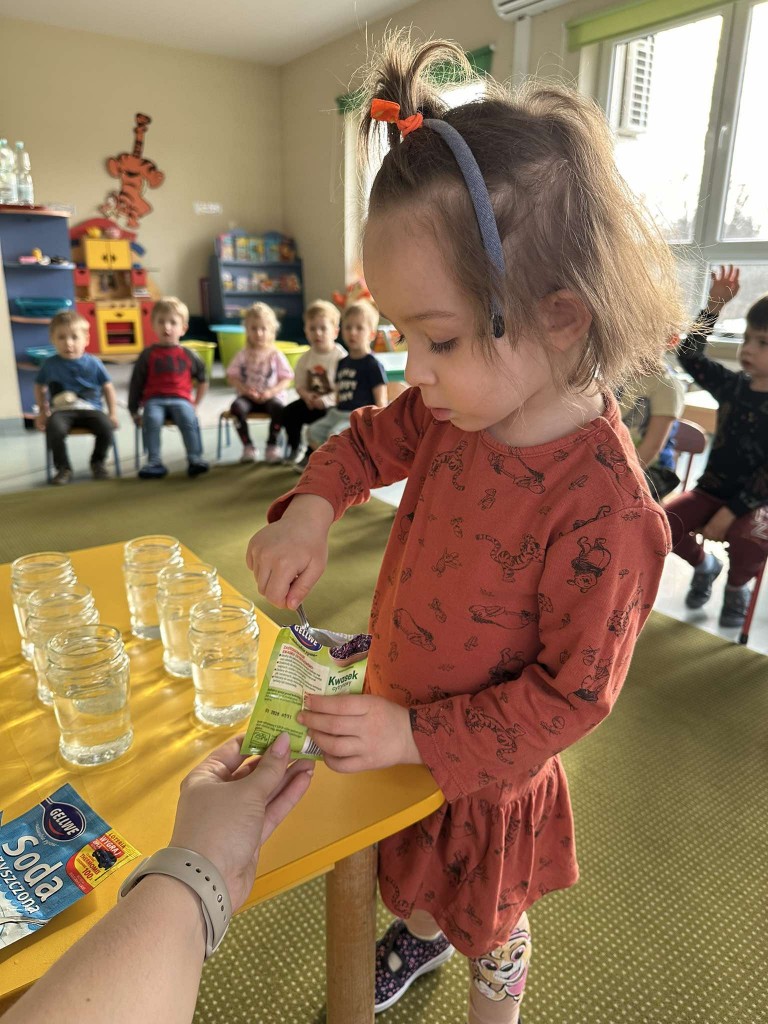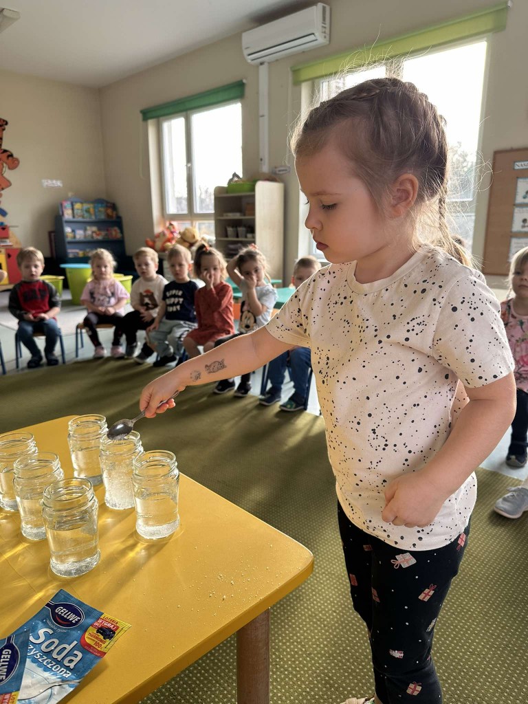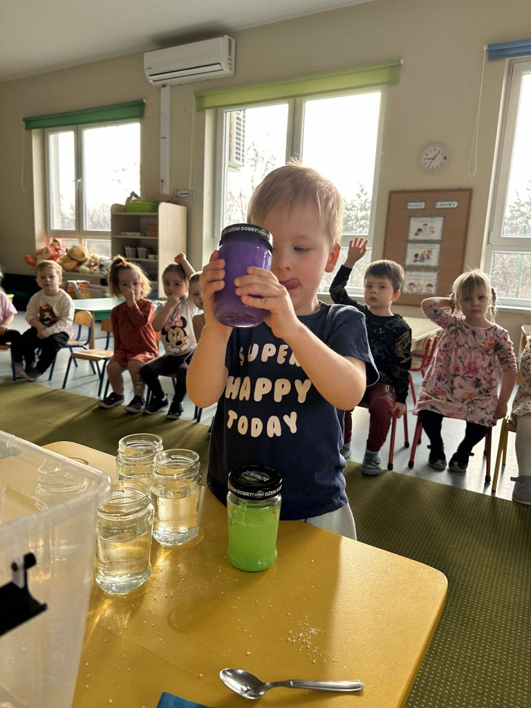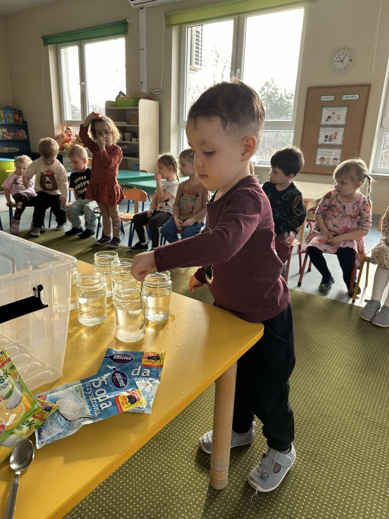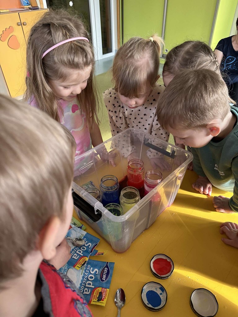 Bardzo lubimy doświadczenia, dlatego podczas ostatniego z nich zostaliśmy pomocnikami Pani i wspólnie eksperymentowaliśmy. Najpierw wsypywaliśmy kwasek cytrynowy do wody. Następnie jak prawdziwi czarodzieje zabarwiliśmy wodę w słoiczkach na różne kolory - wystarczyło tylko potrząsnąć i woda stawała się kolorowa! Na koniec wsypywaliśmy sodę oczyszczoną do naszych słoiczków i obserwowaliśmy prawdziwe kolorowe wulkany! Ależ nam się to podobało!
