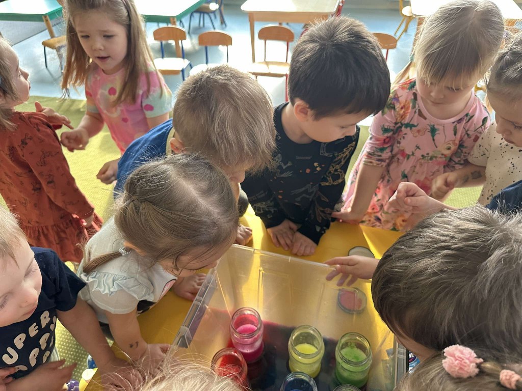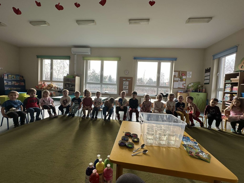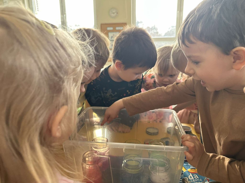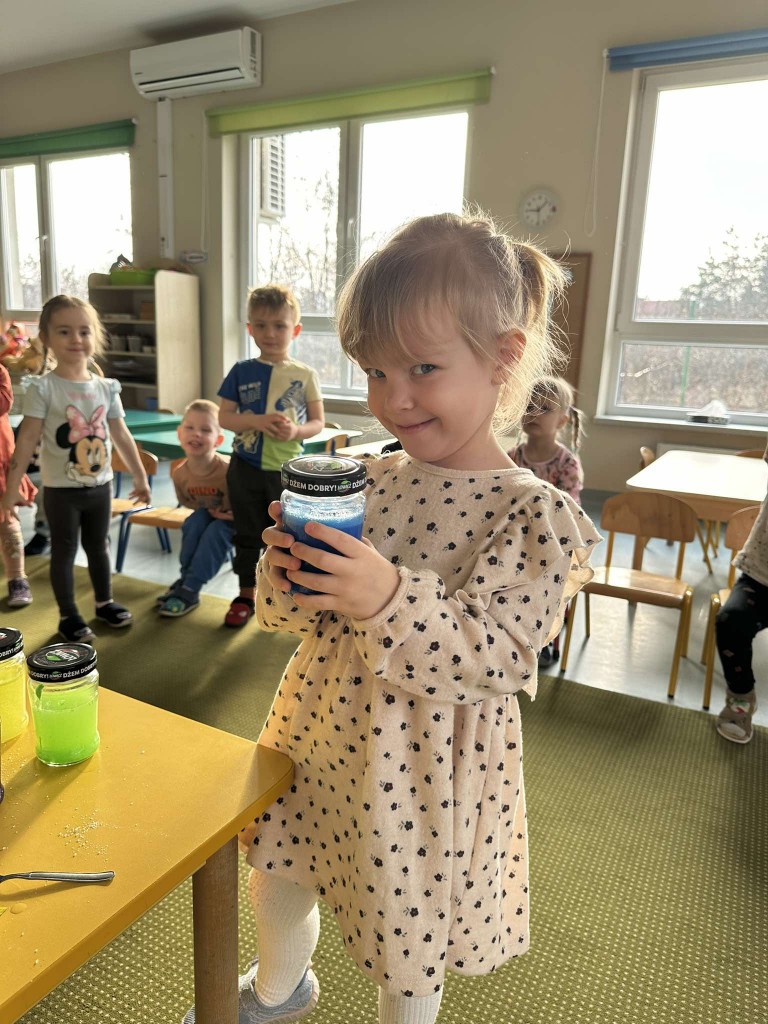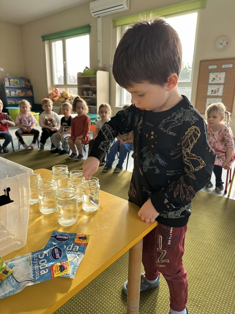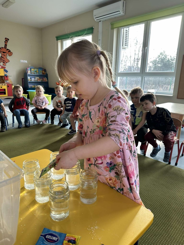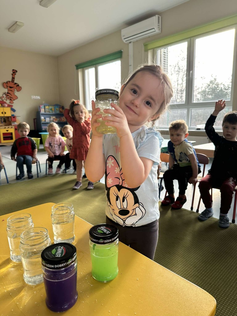 Bardzo lubimy doświadczenia, dlatego podczas ostatniego z nich zostaliśmy pomocnikami Pani i wspólnie eksperymentowaliśmy. Najpierw wsypywaliśmy kwasek cytrynowy do wody. Następnie jak prawdziwi czarodzieje zabarwiliśmy wodę w słoiczkach na różne kolory - wystarczyło tylko potrząsnąć i woda stawała się kolorowa! Na koniec wsypywaliśmy sodę oczyszczoną do naszych słoiczków i obserwowaliśmy prawdziwe kolorowe wulkany! Ależ nam się to podobało!