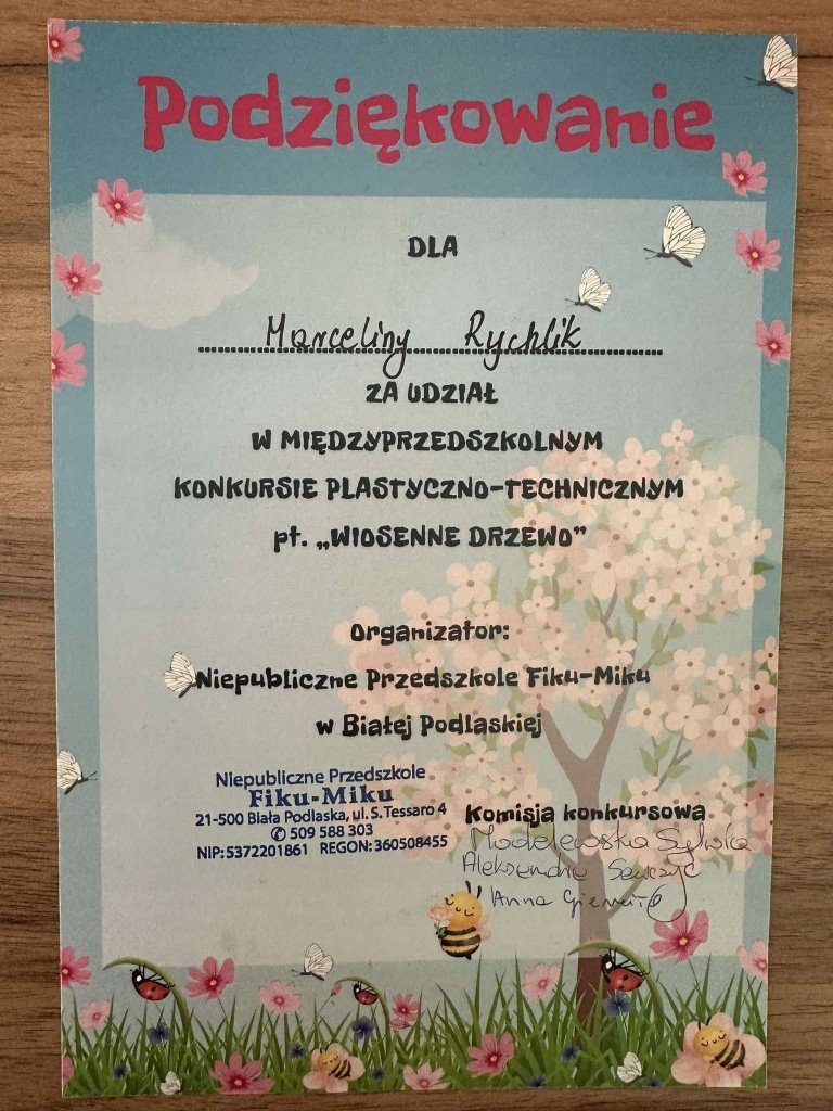 Mila i Marcelinka wzięły udział w konkursie międzyprzedszkolnym organizowanym przez Przedszkole Fiku Miku w Białej Podlaskiej. Wspólnie z Paniami stworzyły wiosenne drzewo w technice 3D. Konkursowe prace pięknie reprezentowały naszą grupę przedszkolną. Mila została wyróżniona w konkursie, a Marcelinka dostała pamiątkowe podziękowanie. Gratulujemy!