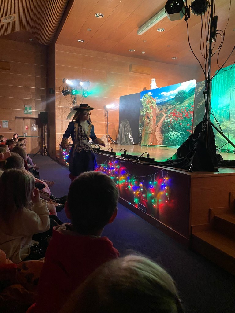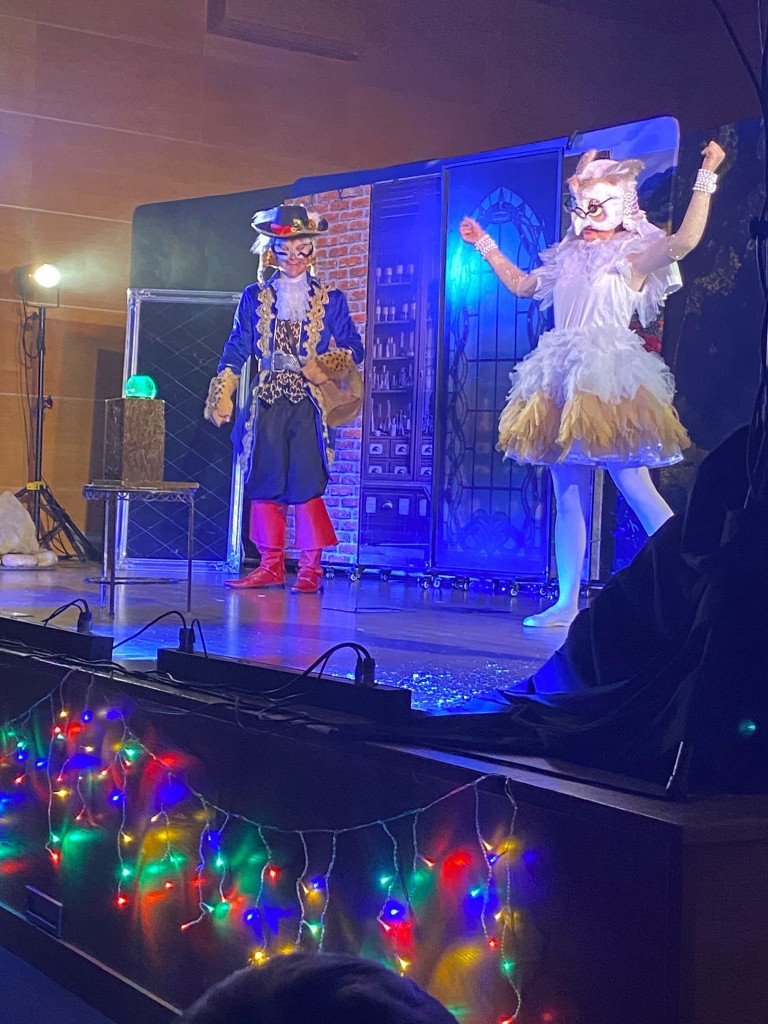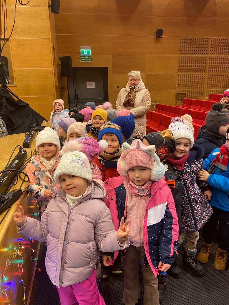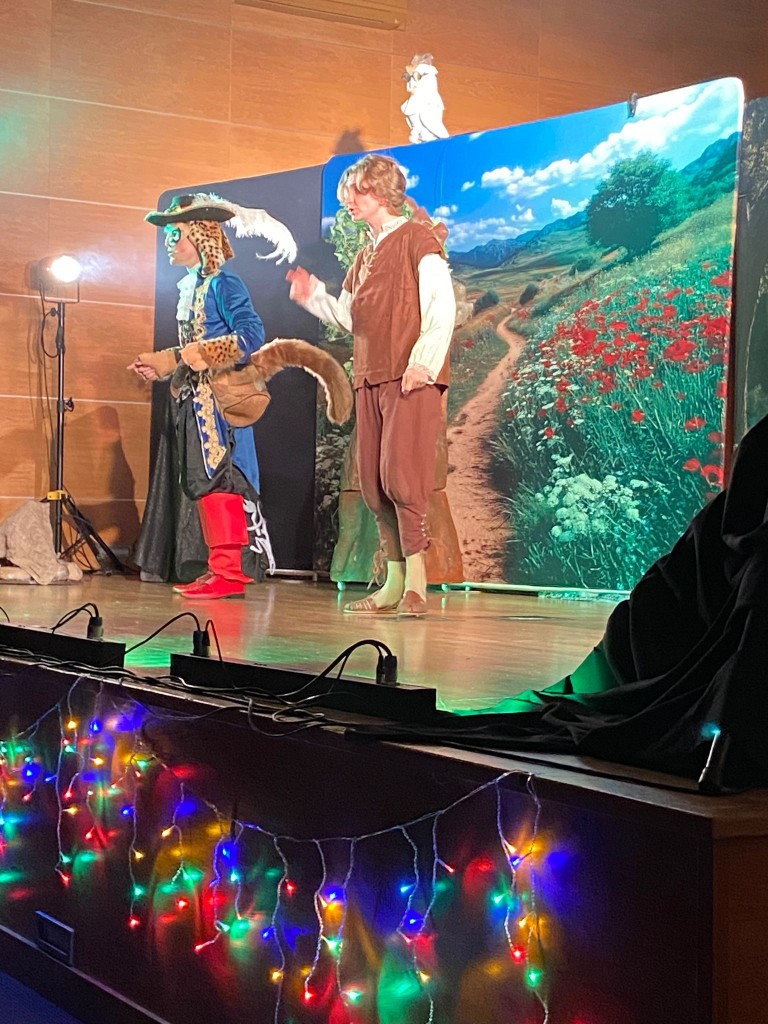 W drugim dniu grudnia wybraliśmy się do Akademii Bialskiej na spektakl „Kot w butach” w wykonaniu Teatru Nowoczesnego scalającego aktorów scen krakowskich. To nasz drugi spektakl na podstawie tej znanej bajki, pierwszy oglądaliśmy w Lublinie, w teatrze Muzycznym. Tutaj w auli Bialskiej Akademii mieliśmy bardzo dobry widok, bo zajmowaliśmy pierwsze rzędy. Teatrzyk nam się podobał i choć nie był tak bardzo rozbudowany wzbudził wiele emocji