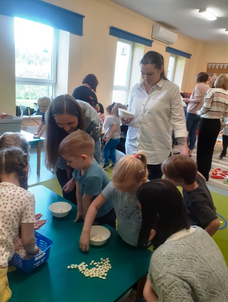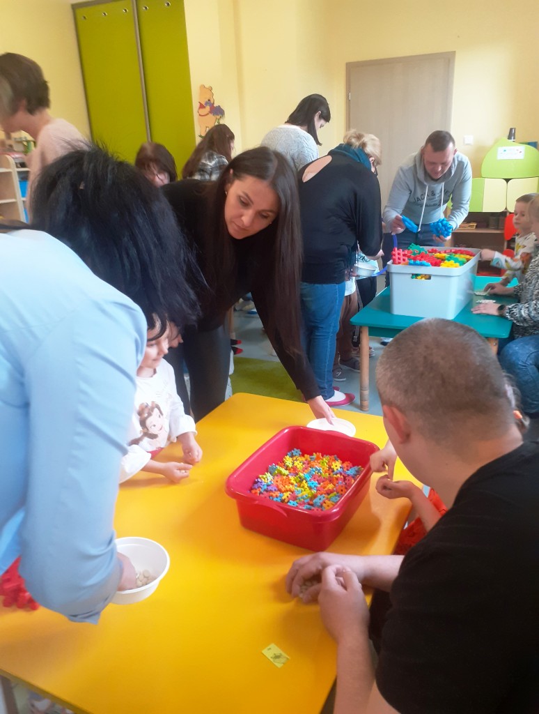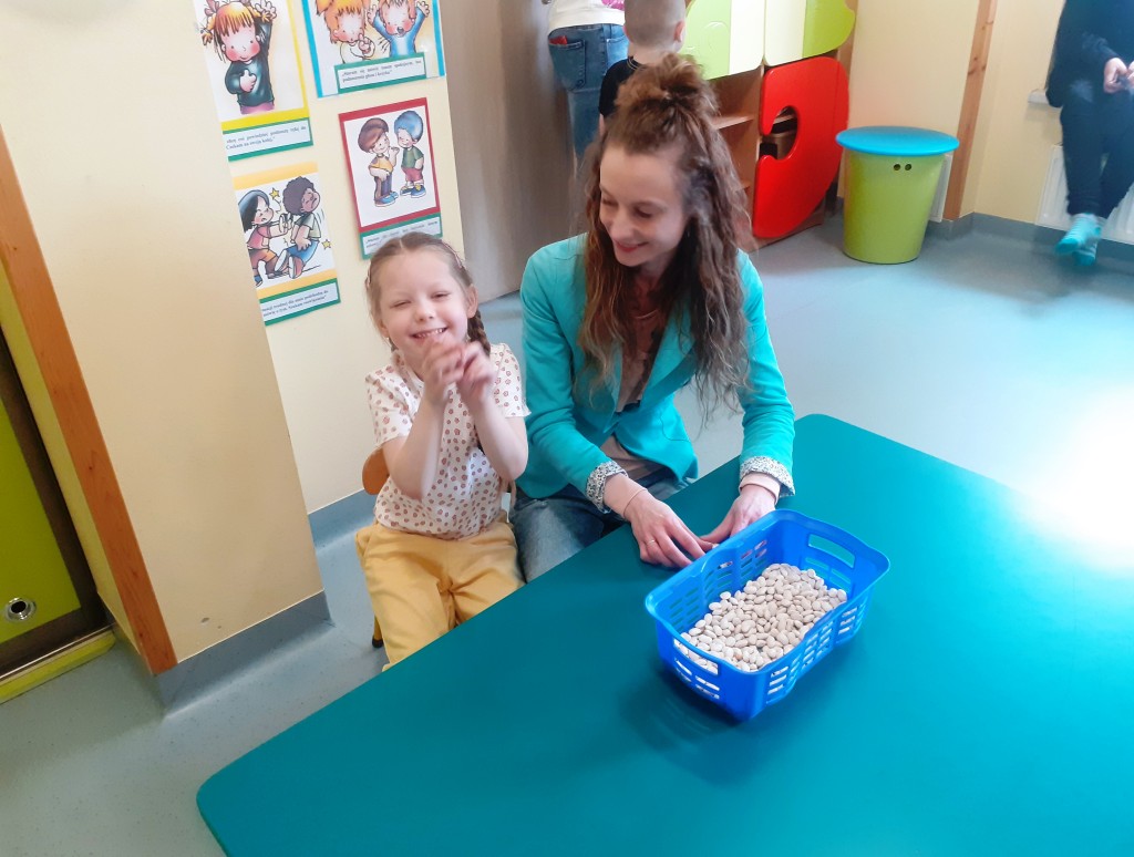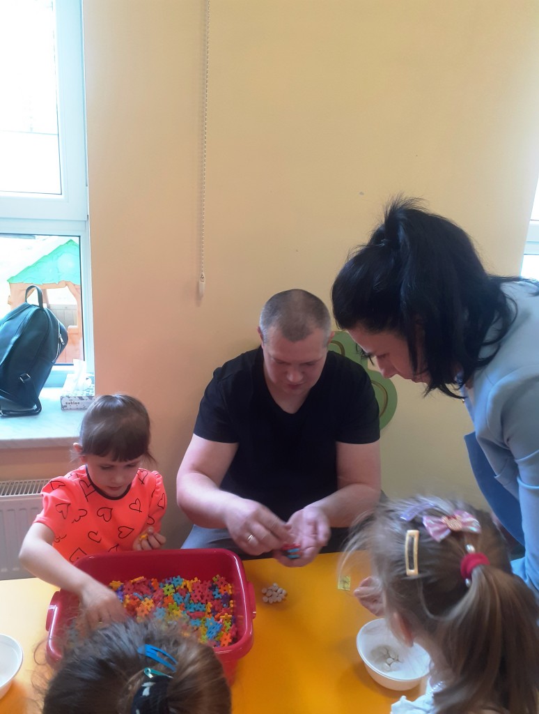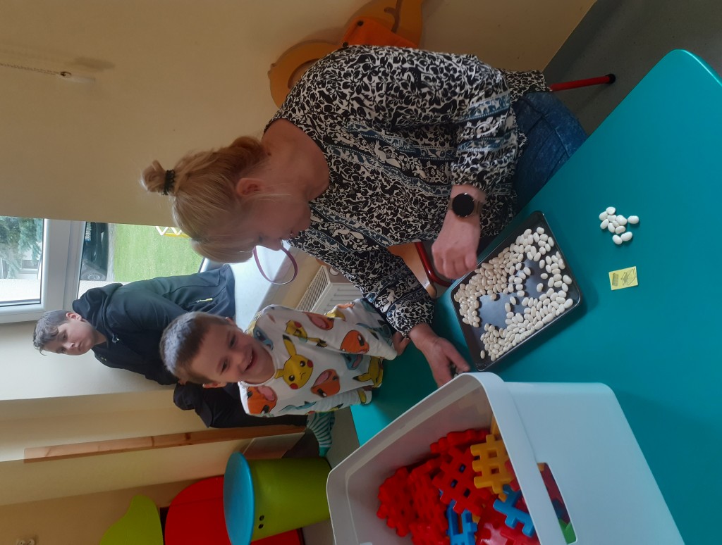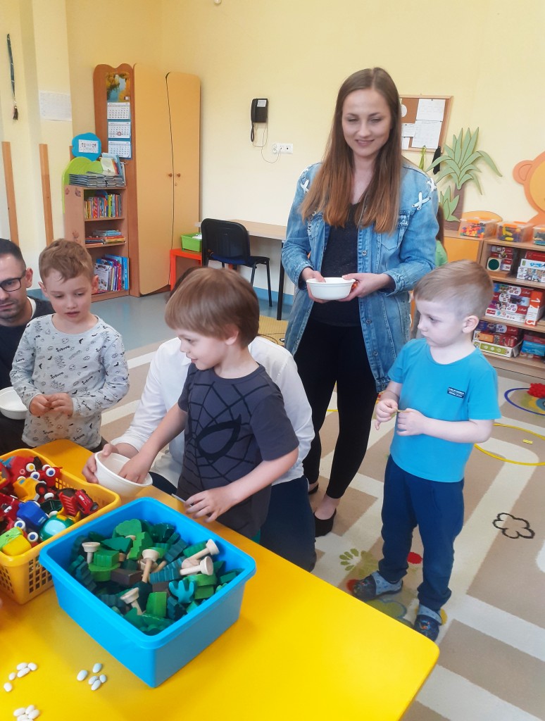 W kwietniu zaprosiliśmy rodziców na zajęcia otwarte z zakresu „Dziecięcej matematyki”, których celem było wdrażanie dzieci do respektowania umów dotyczących wymiany: jeden do jednego, jeden do dwóch oraz jeden do pięciu.