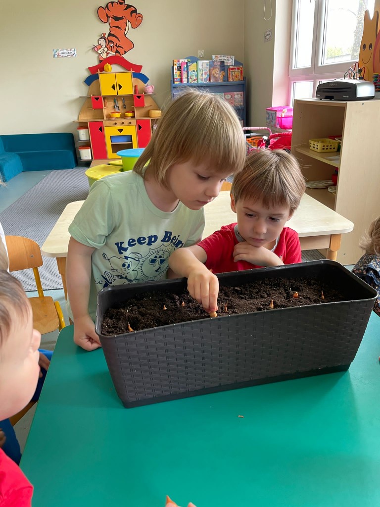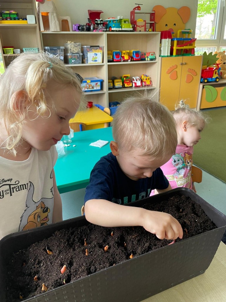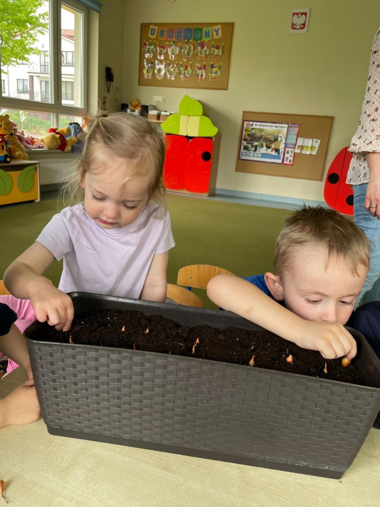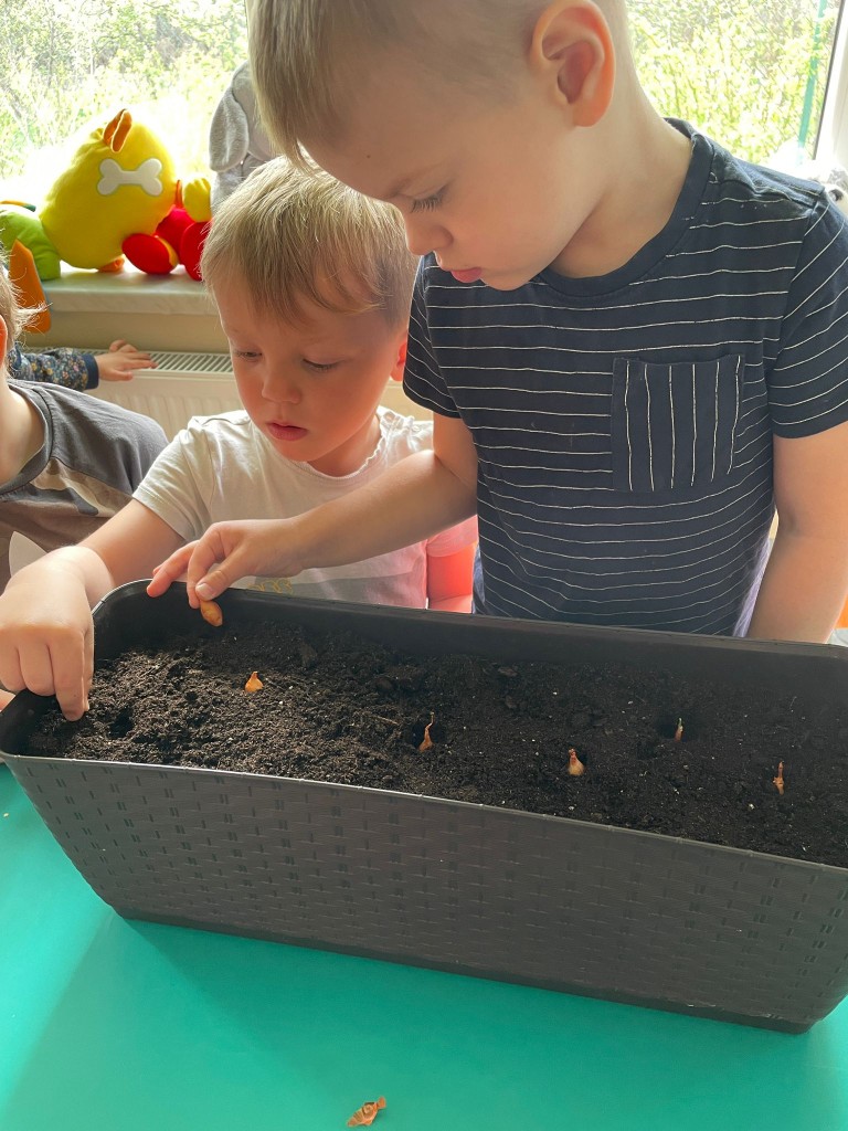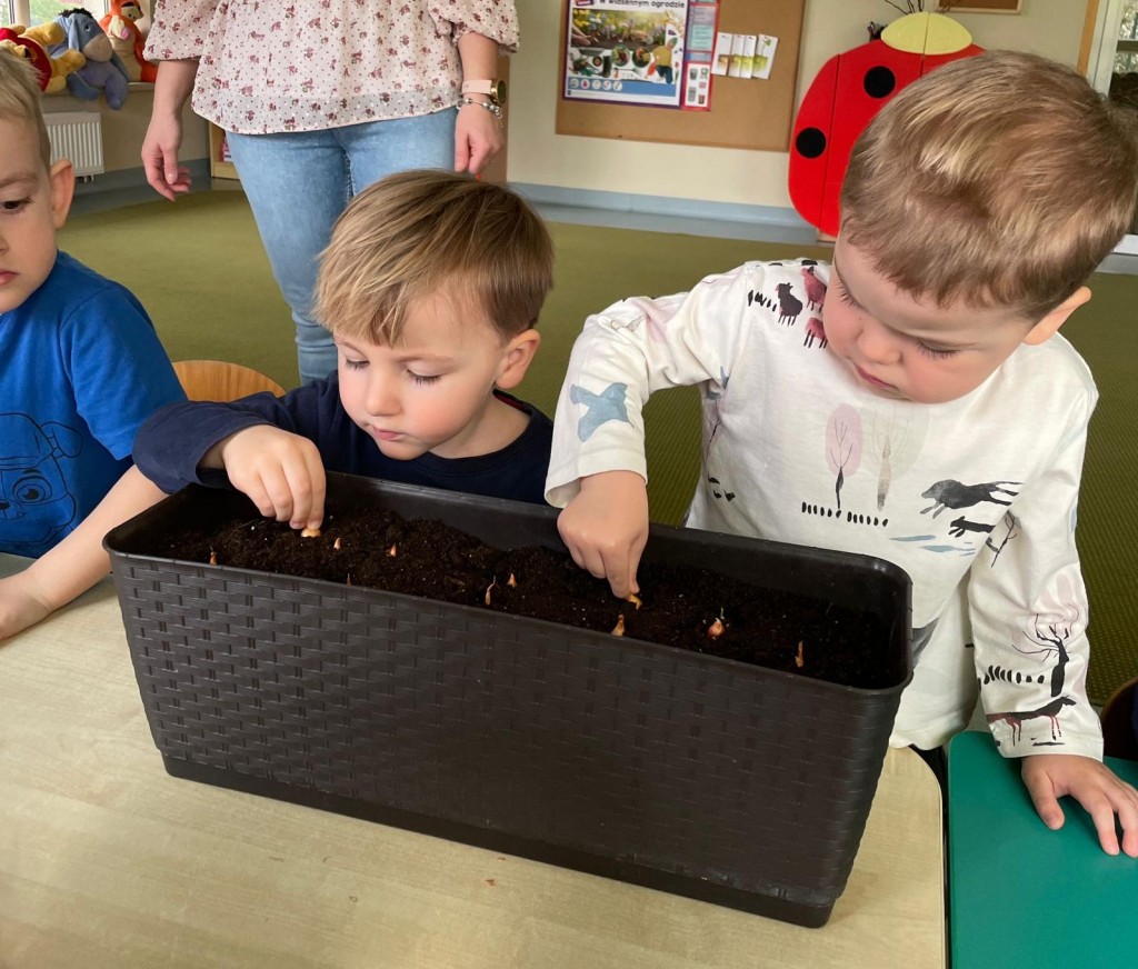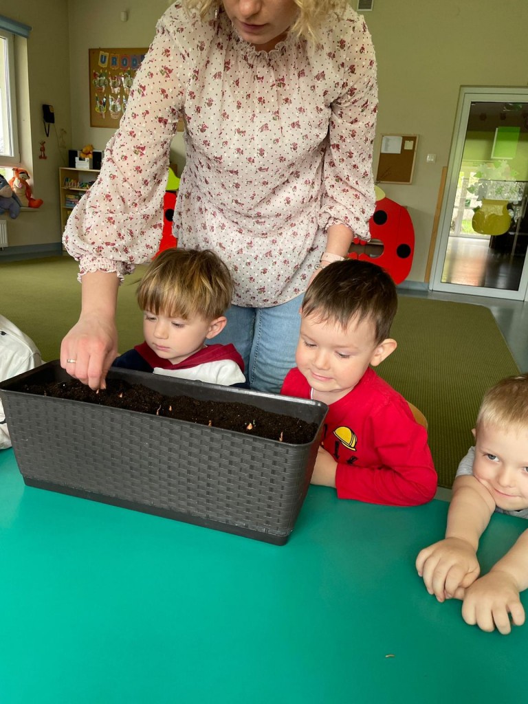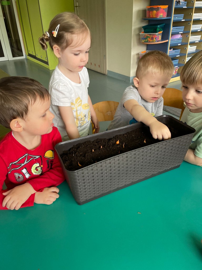 W nawiązaniu do tematyki tygodnia „W ogrodzie” 3-latki posadziły własne cebulki „dymki” na szczypiorek. Dzieci poznały potrzebne przedmioty do sadzenia rośliny (doniczka, ziemia) i dowiedziały się , że do wzrostu cebulki potrzebna jest także woda i słońce.