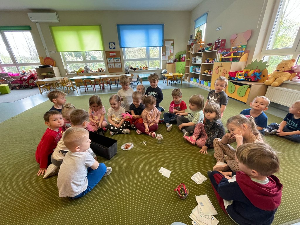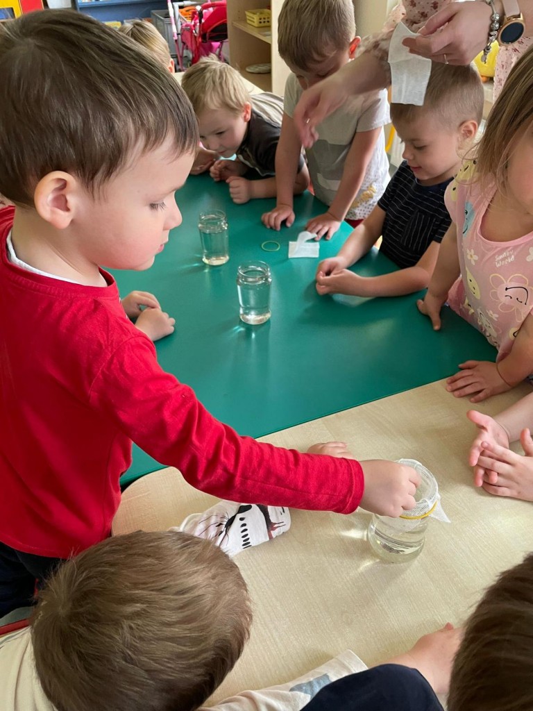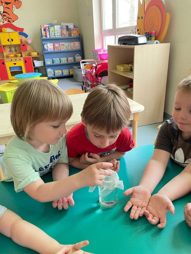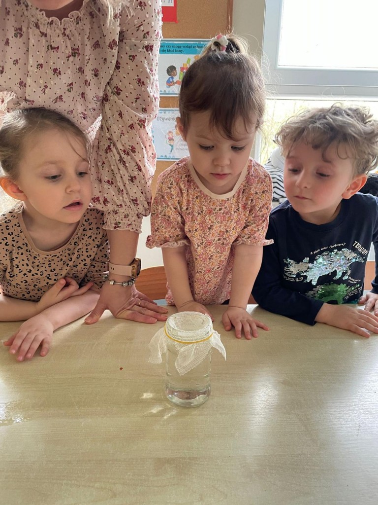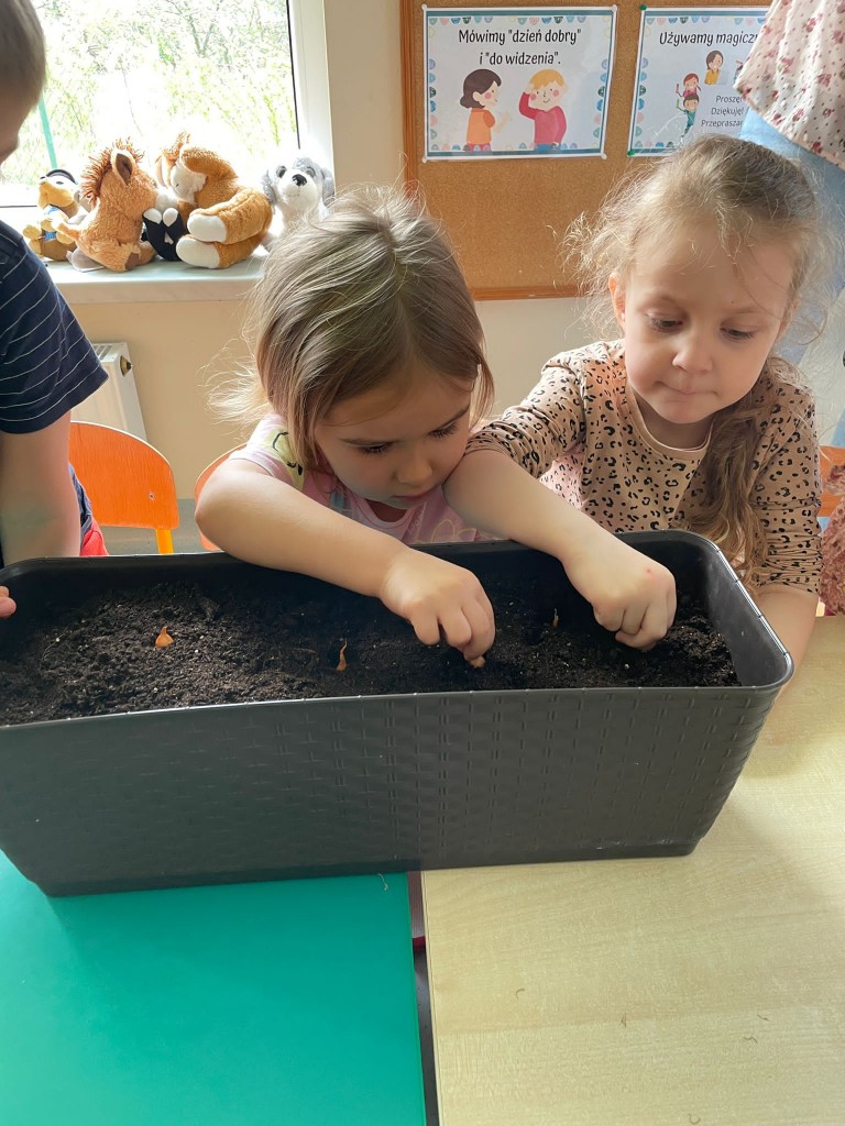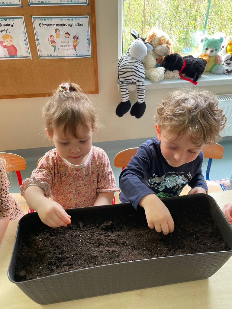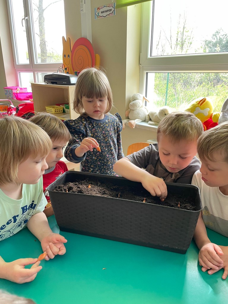 W nawiązaniu do tematyki tygodnia „W ogrodzie” 3-latki posadziły własne cebulki „dymki” na szczypiorek. Dzieci poznały potrzebne przedmioty do sadzenia rośliny (doniczka, ziemia) i dowiedziały się , że do wzrostu cebulki potrzebna jest także woda i słońce.