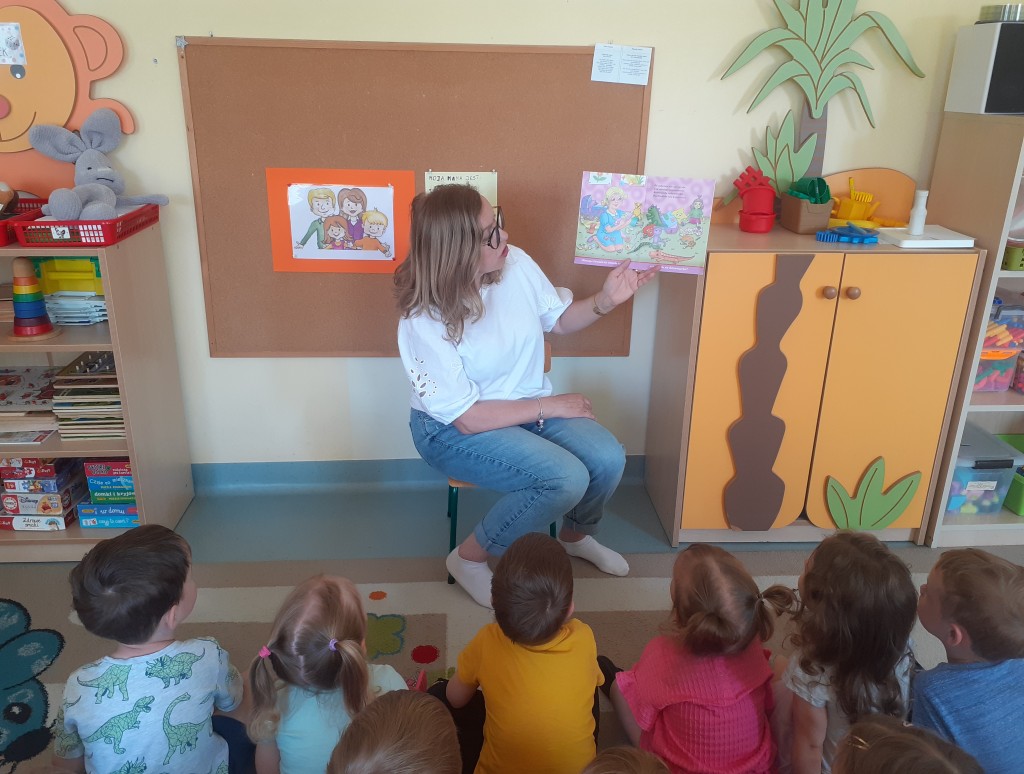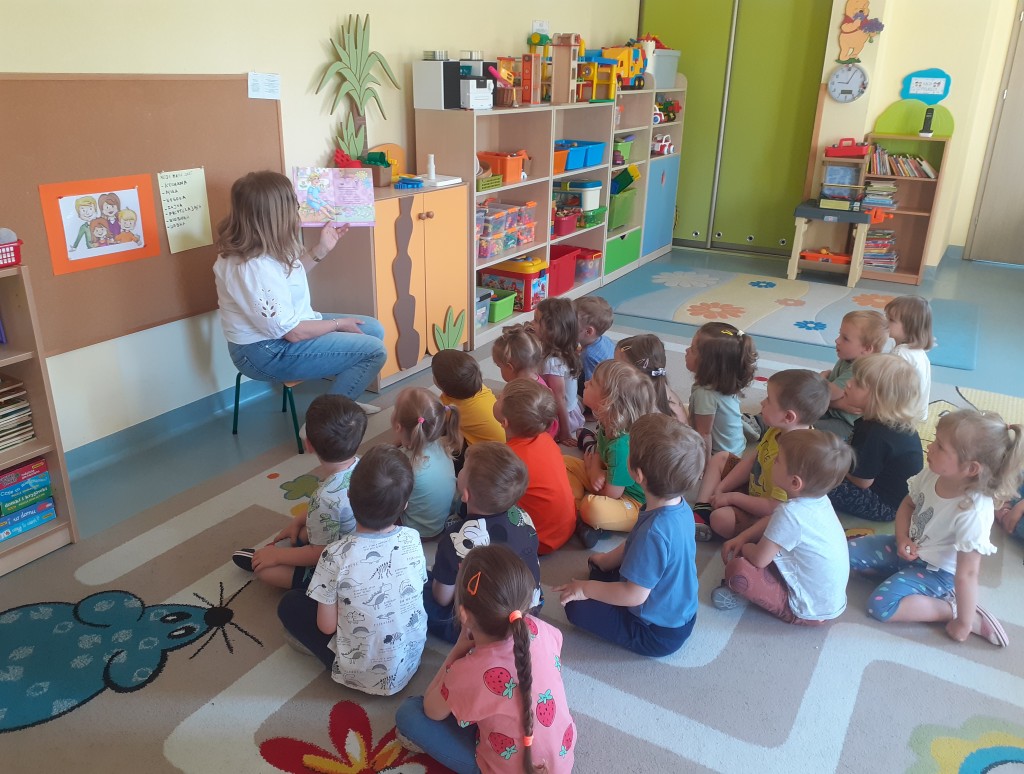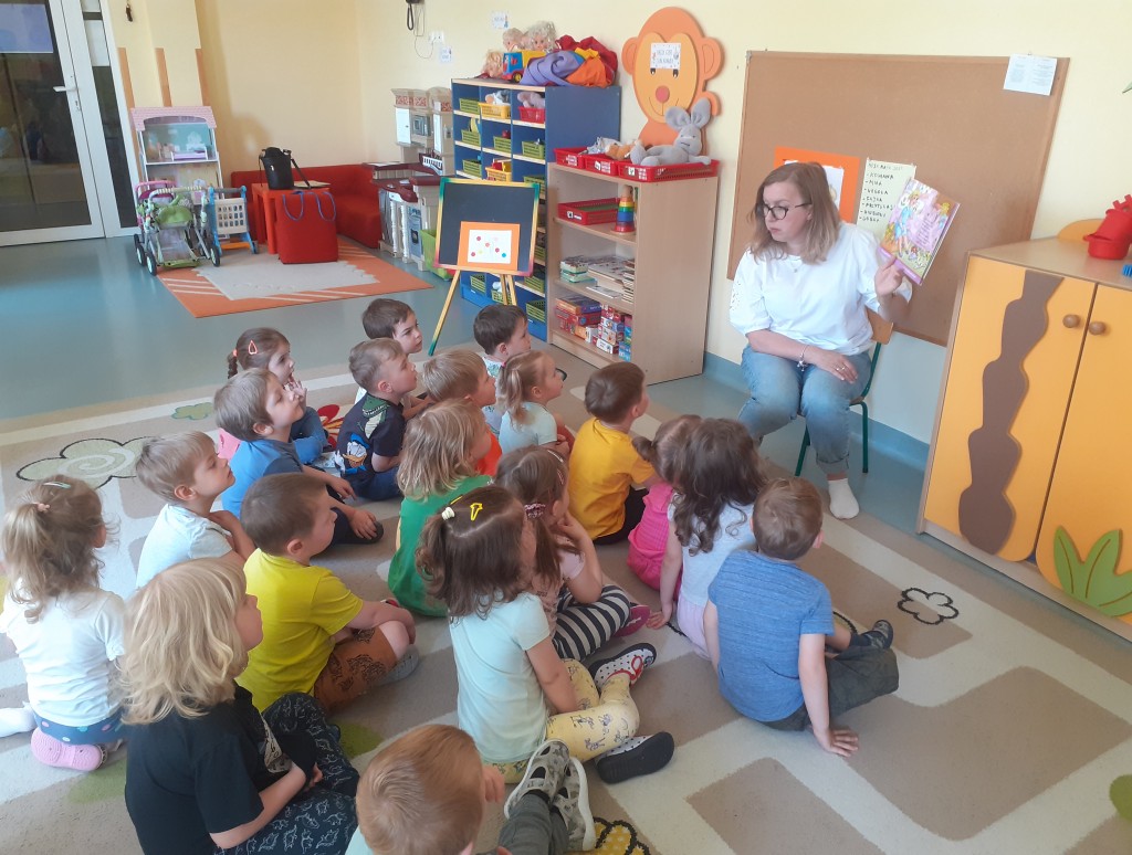 Realizacja bloku tematycznego: ,,Kocham Cię Mamo’’ była znakomitą okazją do spotkania z pracownikiem Biblioteki Pedagogicznej w Białej Podlaskiej. Wyjątkowy gość przybył do nas 24 maja zaraz po śniadaniu. Podczas wizyty pani bibliotekarka przeczytała nam książkę pt. ,,Ewunia nie sprząta zabawek’’ autorstwa Barbary Ciemskiej, książeczka opowiada o dziewczynce, która nie chciała sprzątać zabawek. W tej historii dowiadujemy się, co może się stać, gdy zabawki nie będą posprzątanie, a także uczy nas, dlaczego warto to robić i dla kogo. Gdyż wiemy doskonale, że taką pomocną osobą jest nasza mama.