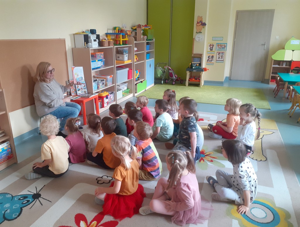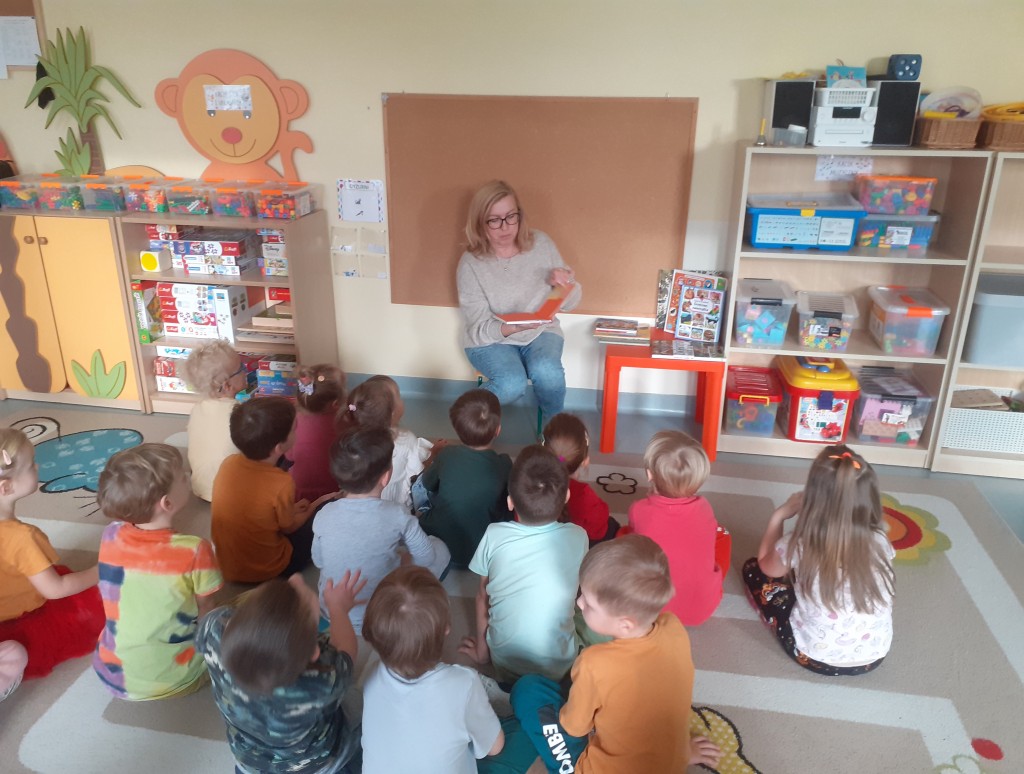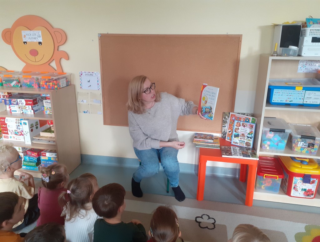 Dnia 27 listopada naszą grupę odwiedził pracownik Biblioteki Pedagogicznej. Spotkanie stało się podstawą do rozmowy na temat szanowania książek poprzez unikanie zaginania rogów kartek i wyrywania stron. Zgodnie z tematyką tygodnia ,,Spotkanie z książką'' dzieci mogły wysłuchać ciekawej literatury.