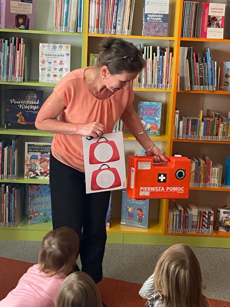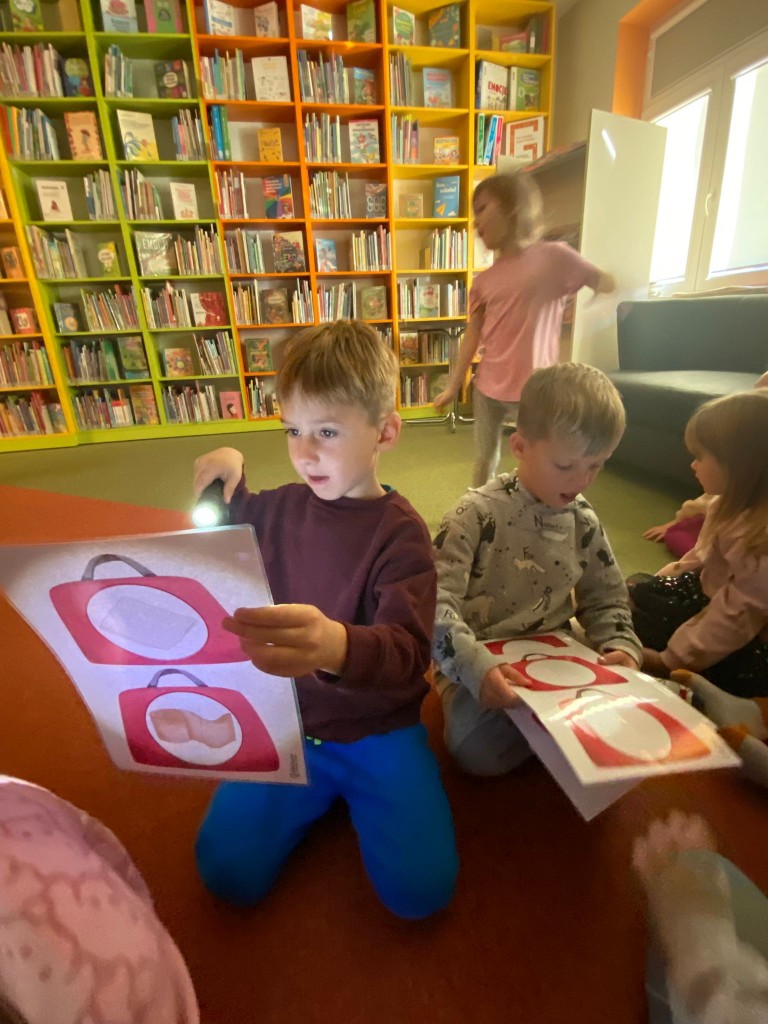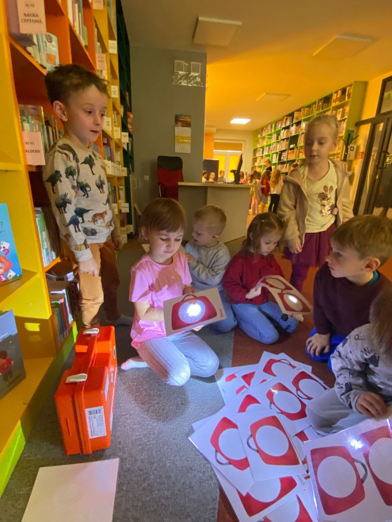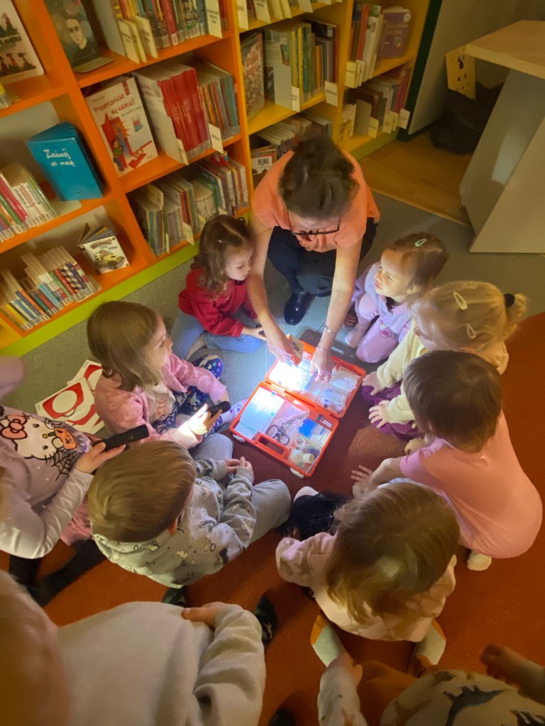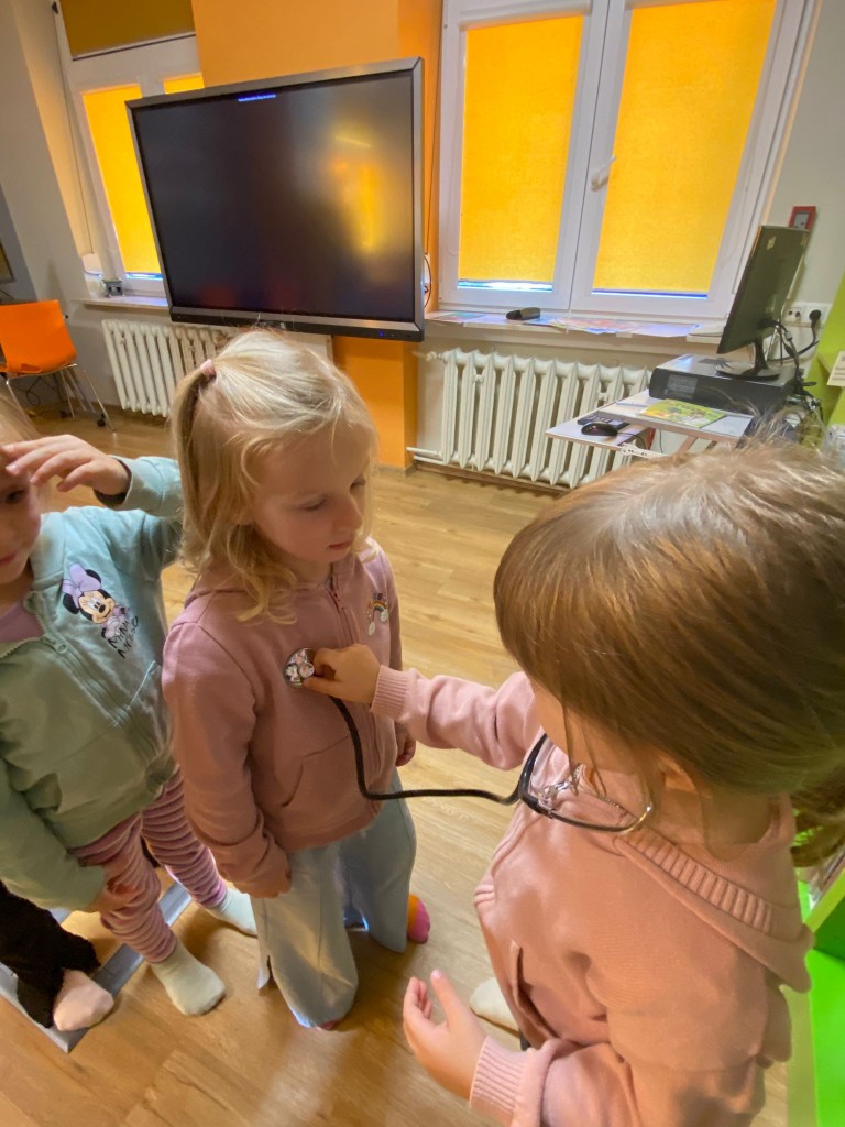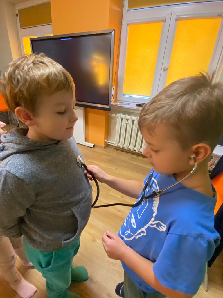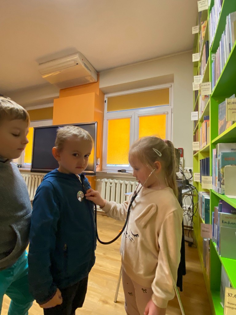 W trakcie październikowych zajęć w Bibliotece Pedagogicznej przypomnieliśmy sobie, co należy robić, aby być zdrowym. Wspólnie z panią Beatą, panią prowadzącą zajęcia, zwróciliśmy uwagę na to, by dbać o higienę osobistą, ubierać się adekwatnie do pogody, dużo się ruszać, uprawiać sport i często przebywać na dworze, co znacząco wpłynie na zahartowanie naszego organizmu. Potem pani Beata zaprosiła nas do zabaw, w czasie których za pomocą latarek sprawdzaliśmy zawartość apteczki lekarskiej, utrwalaliśmy prawidłowy sposób mycia zębów, a także słuchaliśmy bicia serc za pomocą stetoskopu- jak prawdziwi lekarze!