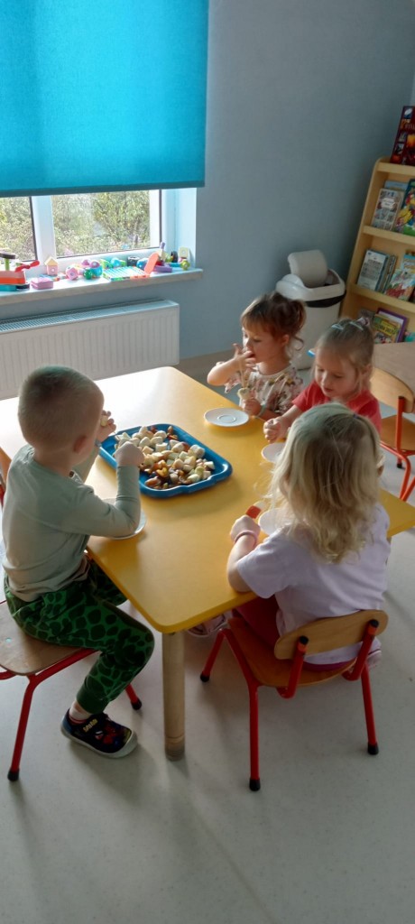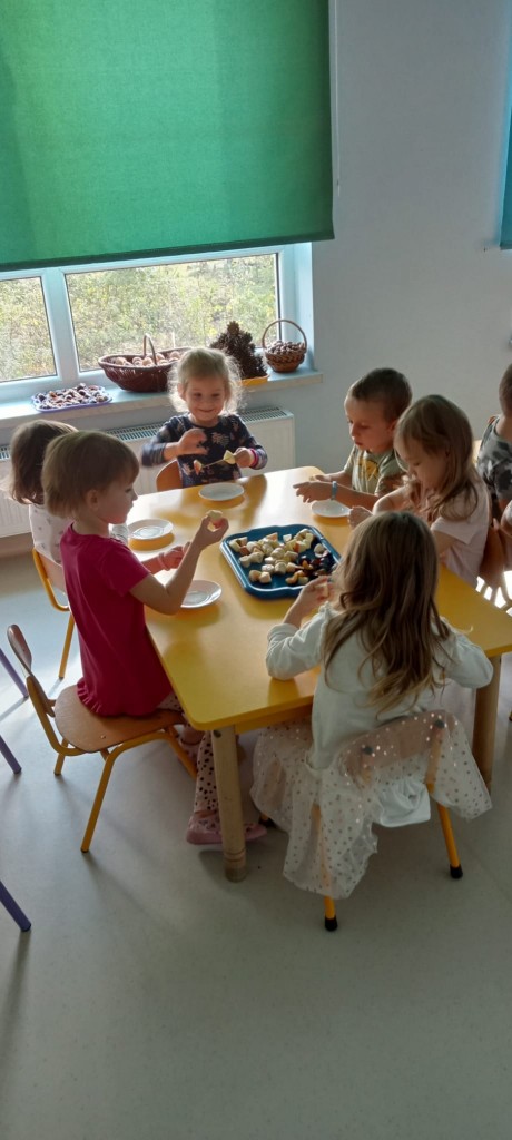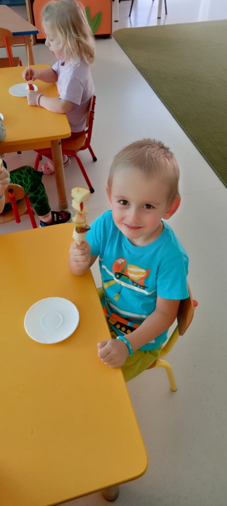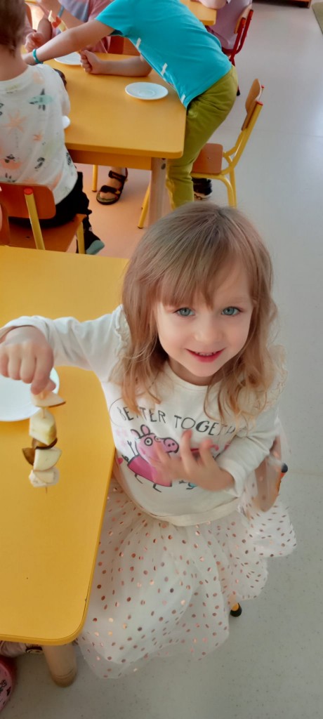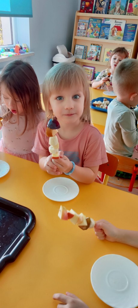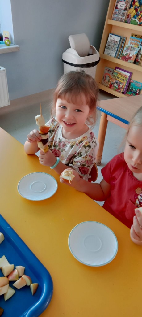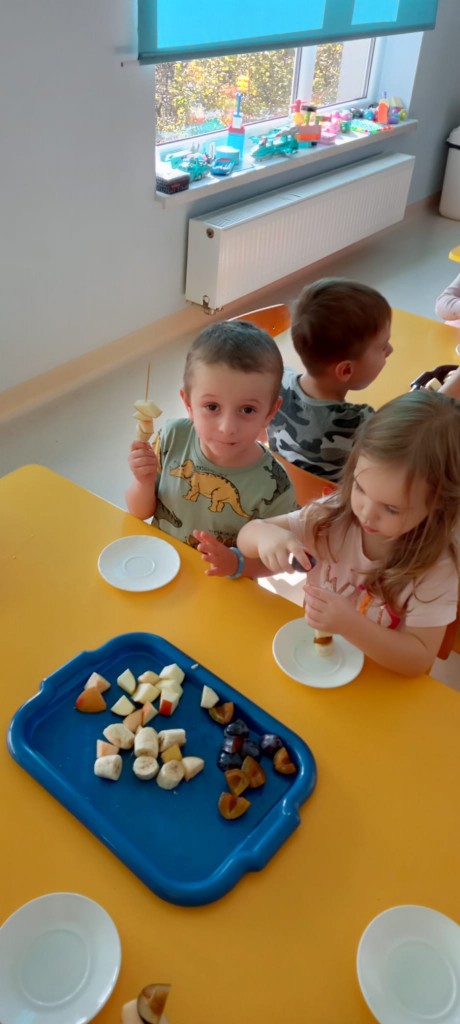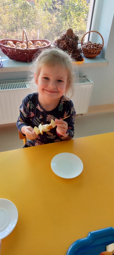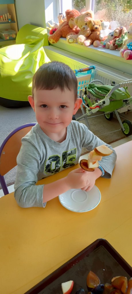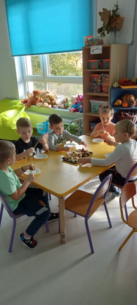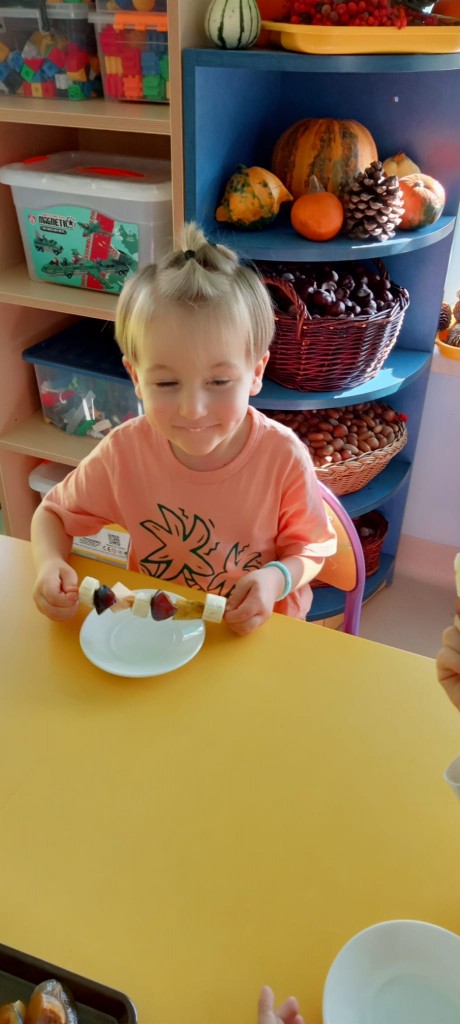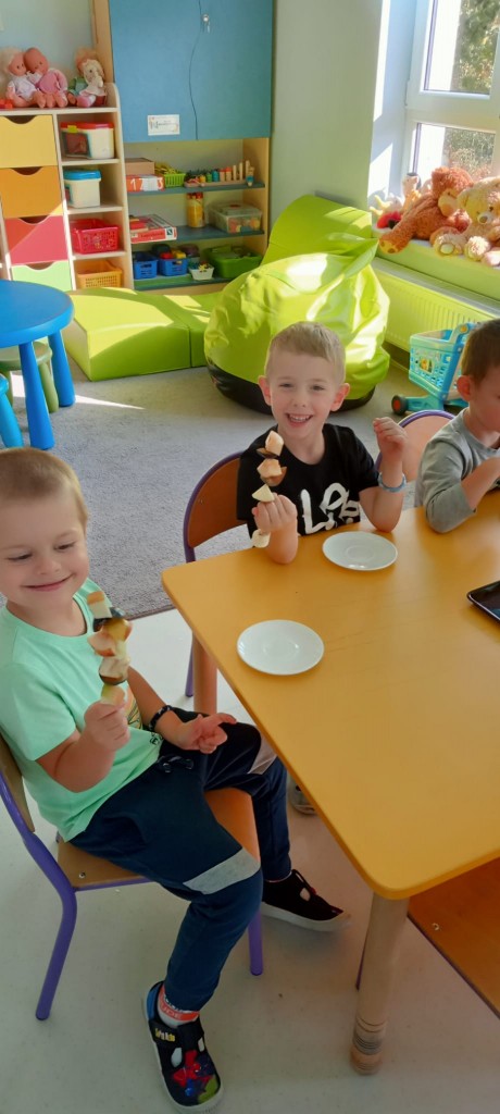 Nasza grupa wie, jak osłodzić sobie tą pochmurną, jesienną aurę za oknem. W ramach realizacji tematyki tygodnia związanej z jesienią w sadzie, nasze czwartkowe popołudnie upłynęło nam na robieniu owocowych szaszłyków. Nasza pani Dorotka pokroiła nam świeże owoce, a my przy stoliczkach samodzielnie komponowaliśmy i nadziewaliśmyna patyczki swoje ulubione owoce, tworząc pyszne i zdrowe szaszłyki, które następnie każdy z nas zjadł z ogromnym apetytem. Uwielbiamy takie zajęcia!