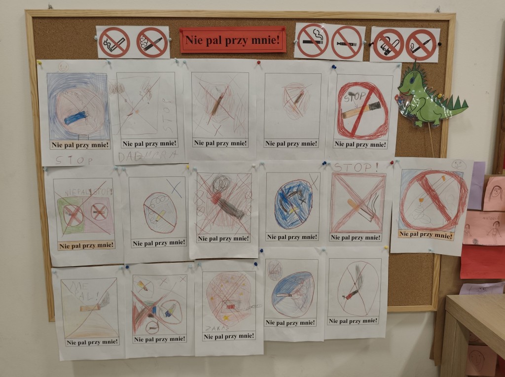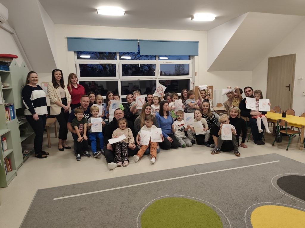 W czasie spotkania dowiedzieliśmy się, że dym tytoniowy jest szkodliwy dla zdrowia, a jednocześnie szkodzi nie tylko osobie palącej, ale także tym, którzy oddychają dymem tytoniowym. W czasie spotkania mieliśmy możliwość dowiedzieć się także, że możemy zachować się asertywnie w kontakcie z osobą palącą papierosy. Zapoznaliśmy się z wyglądem znaków zakazu palenia oraz współpracowaliśmy z rodzicami podczas projektowania i rysowania znaku zakazu palenia.
