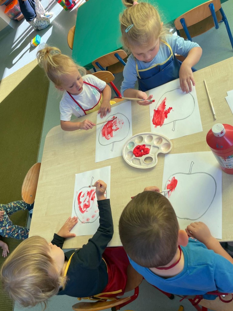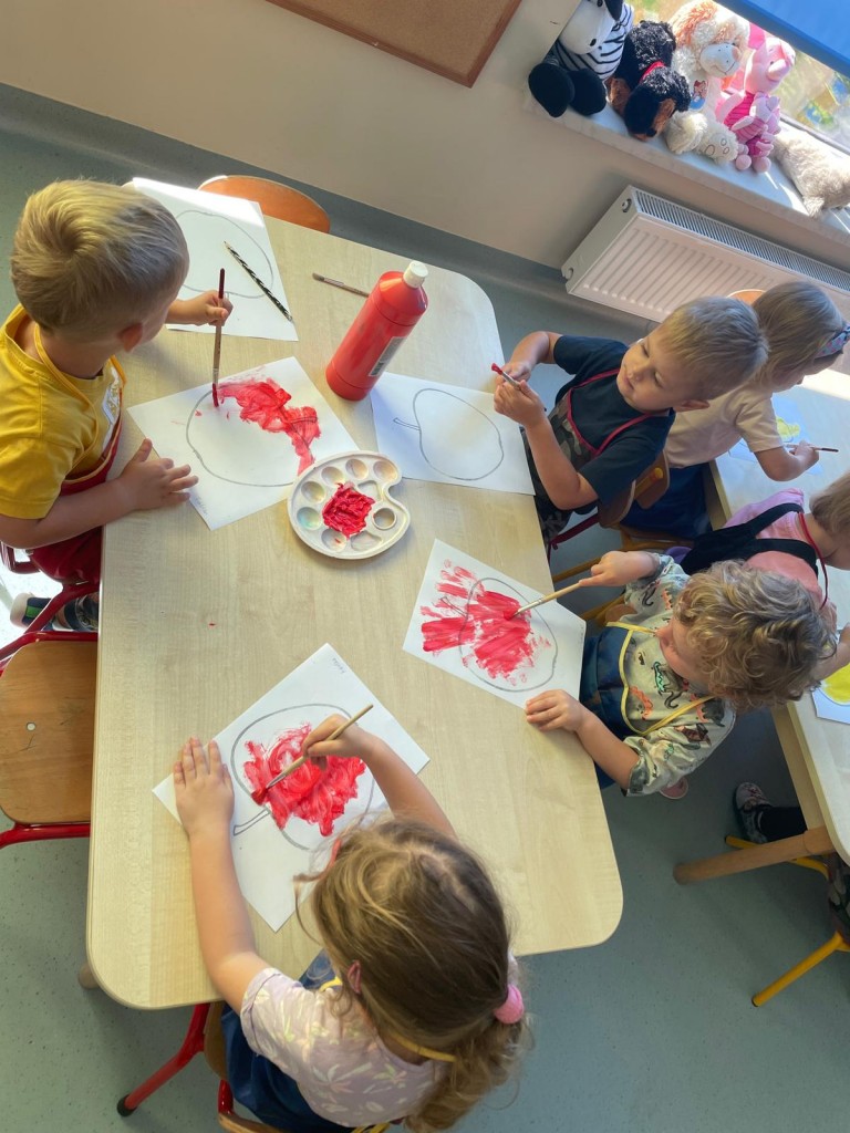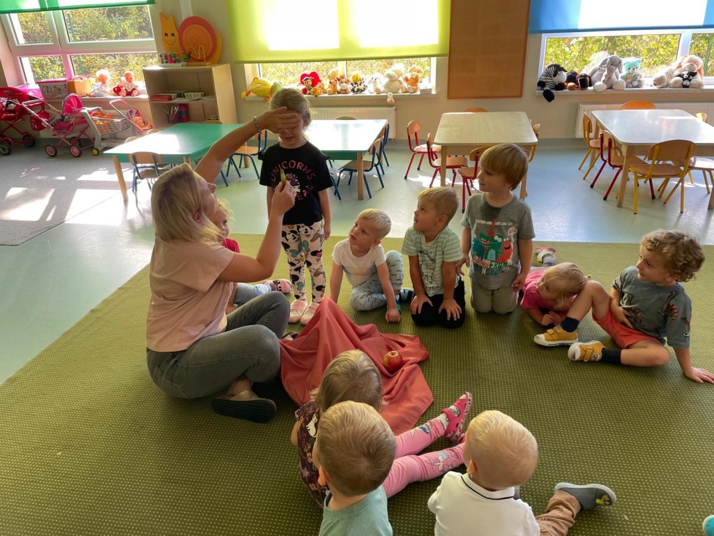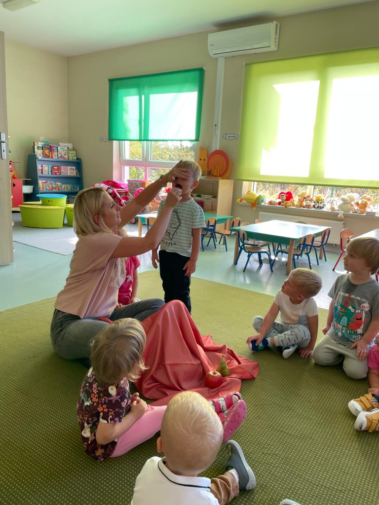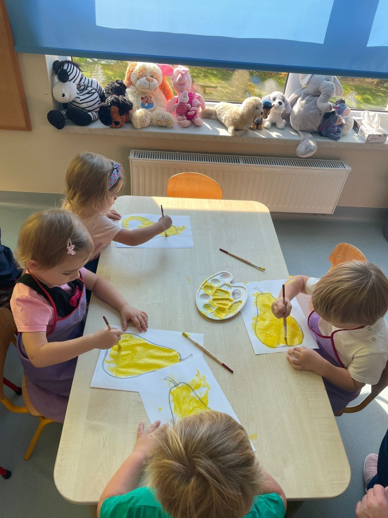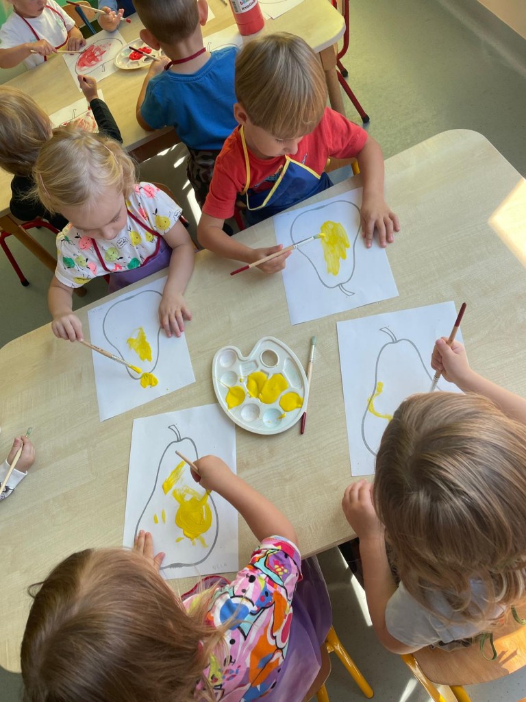 W dniach 18-20 września 3-latki poznawały owoce występujące w wierszyku: „Wpadła gruszka do fartuszka”. Dzieci rozpoznawały owe owoce po smaku, dotyku i kolorze. Wykonały także pracę plastyczną, malując wybrane owoce farbami ucząc się prawidłowo trzymać pędzel i odpowiednio rozprowadzać farbę.