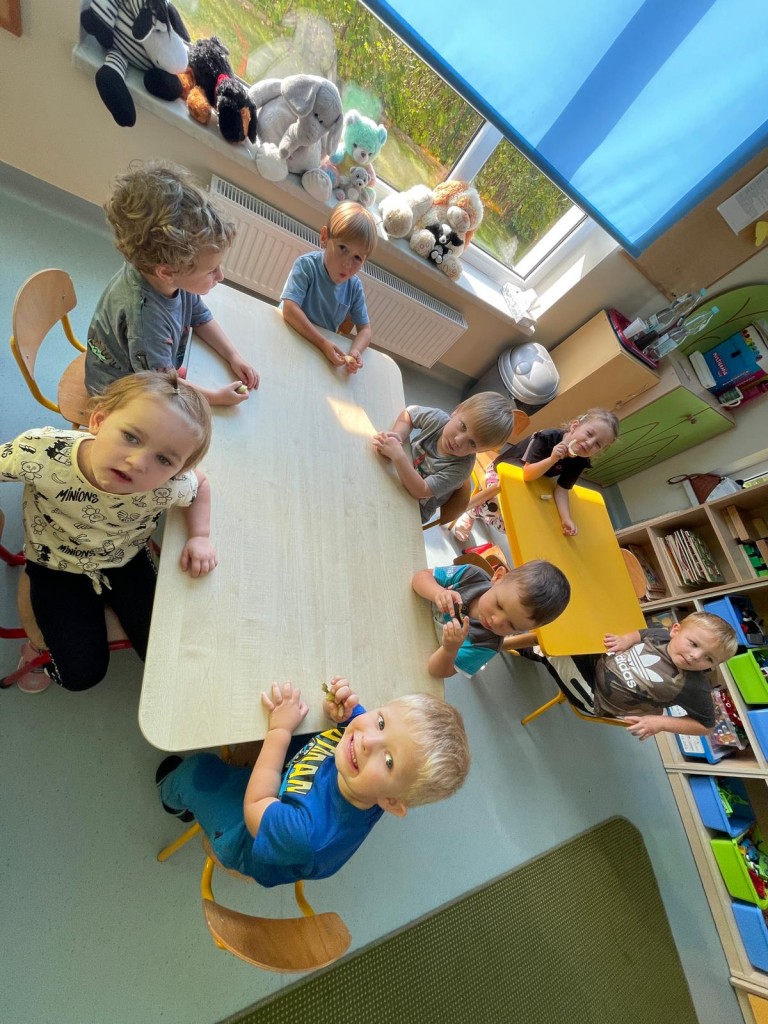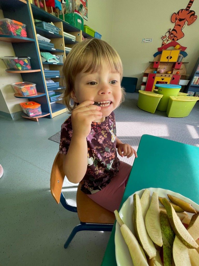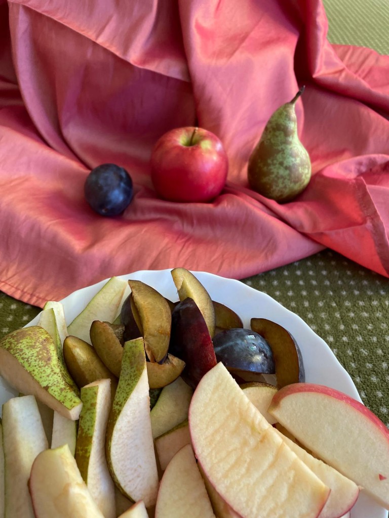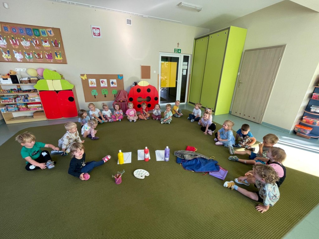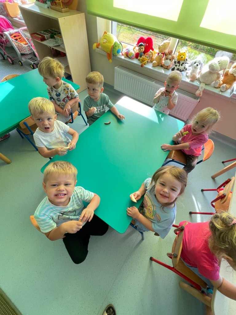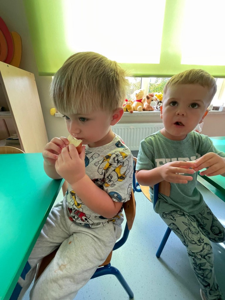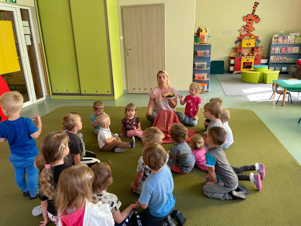 W dniach 18-20 września 3-latki poznawały owoce występujące w wierszyku: „Wpadła gruszka do fartuszka”. Dzieci rozpoznawały owe owoce po smaku, dotyku i kolorze. Wykonały także pracę plastyczną, malując wybrane owoce farbami ucząc się prawidłowo trzymać pędzel i odpowiednio rozprowadzać farbę.