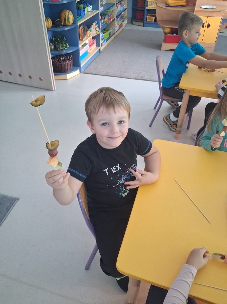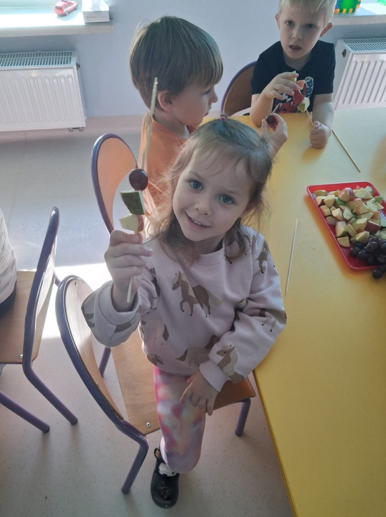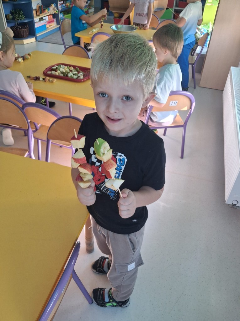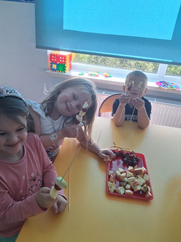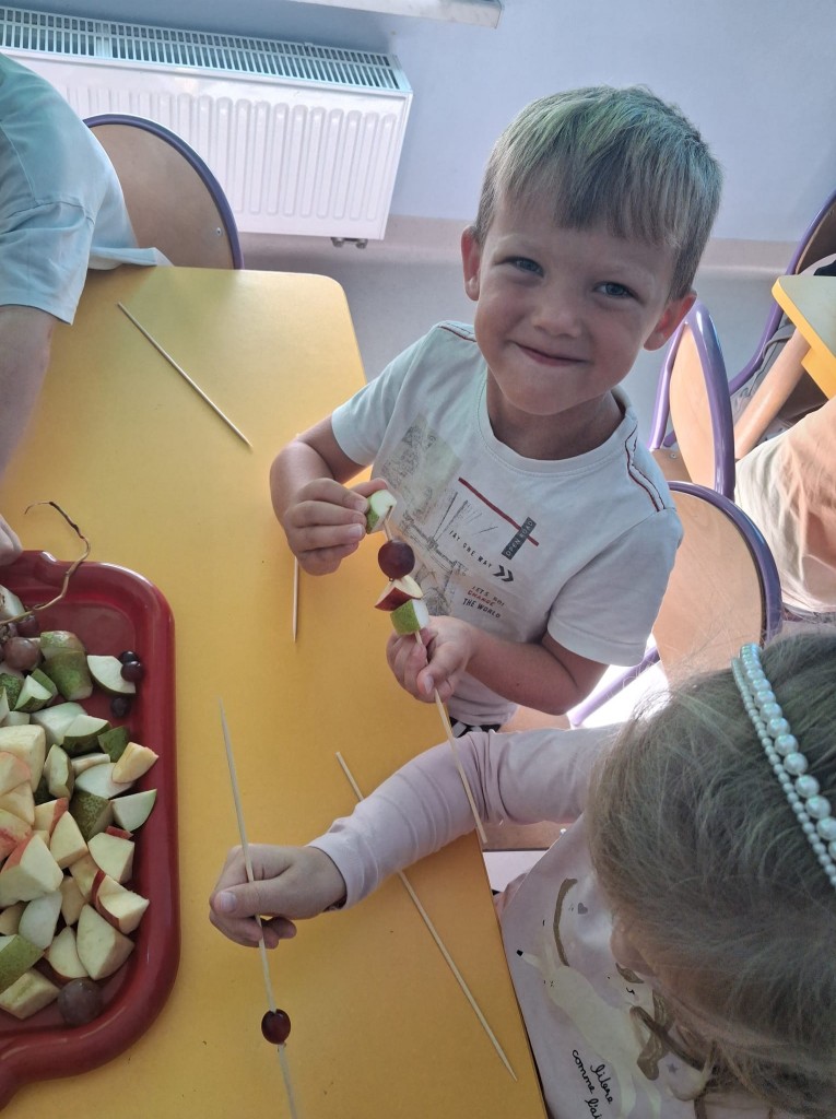 We środę 28.09.2025r., w ramach przygotowań do jesiennego festynu, wykonaliśmy owocowe szaszłyki. Była to świetna okazja do powtórzenia nazw owoców, kojarzących nam się z jesienią, tj. śliwek, jabłek, gruszek, winogron. Po umyciu rąk usiedliśmy do stolików, gdzie każdy z nas mógł komponować i nadziewać na wykałaczki swoje ulubione owoce tworząc pyszne i zdrowe szaszłyki owocowe. Przygotowanie słodkiego poczęstunku na festyn dało nam wiele satysfakcji, uświadamiając jednocześnie, jak ważną rolę odgrywają witaminy we właściwym funkcjonowaniu naszego organizmu.