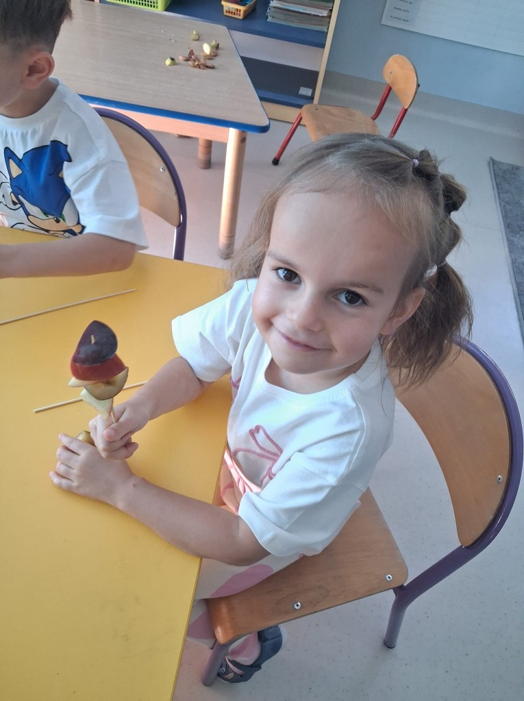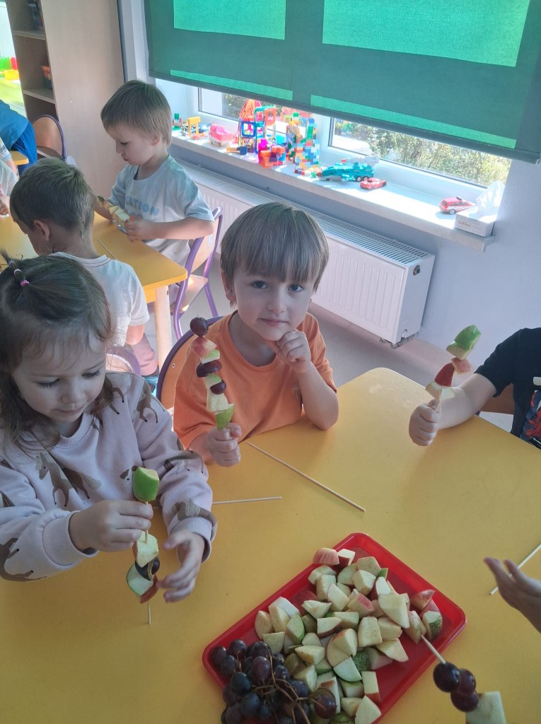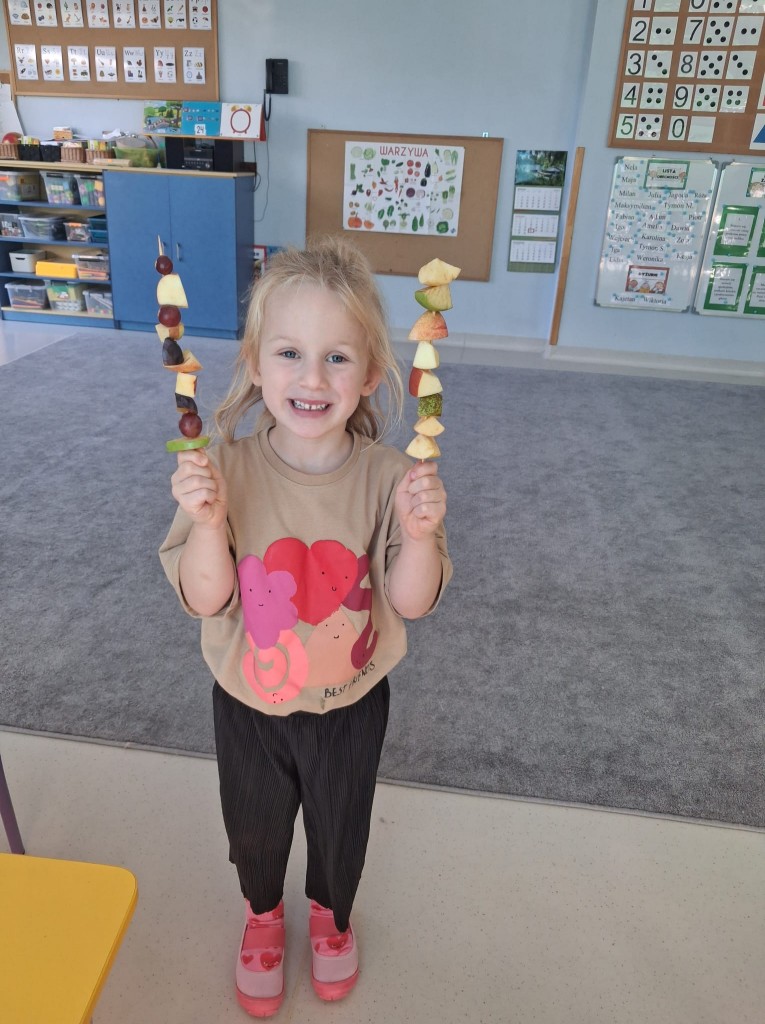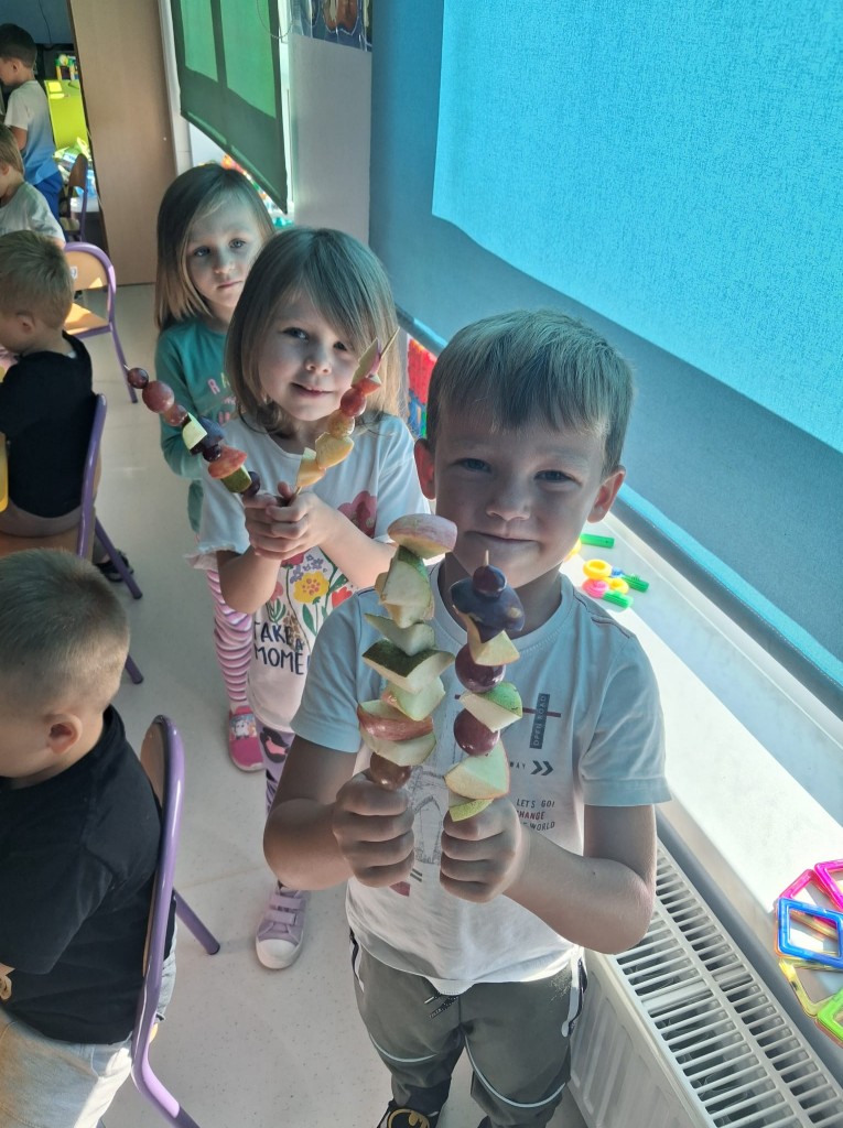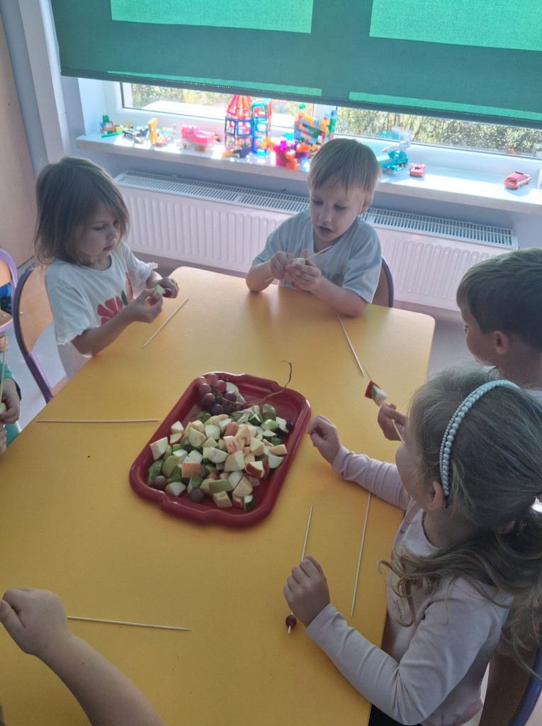 We środę 28.09.2025r., w ramach przygotowań do jesiennego festynu, wykonaliśmy owocowe szaszłyki. Była to świetna okazja do powtórzenia nazw owoców, kojarzących nam się z jesienią, tj. śliwek, jabłek, gruszek, winogron. Po umyciu rąk usiedliśmy do stolików, gdzie każdy z nas mógł komponować i nadziewać na wykałaczki swoje ulubione owoce tworząc pyszne i zdrowe szaszłyki owocowe. Przygotowanie słodkiego poczęstunku na festyn dało nam wiele satysfakcji, uświadamiając jednocześnie, jak ważną rolę odgrywają witaminy we właściwym funkcjonowaniu naszego organizmu.