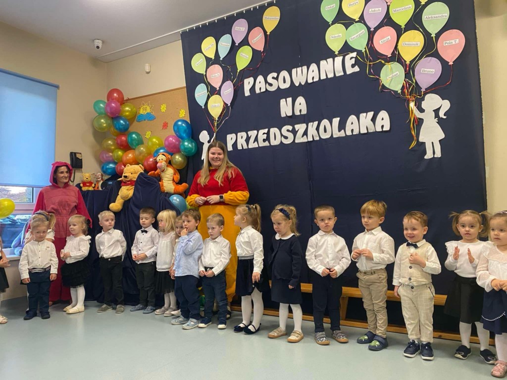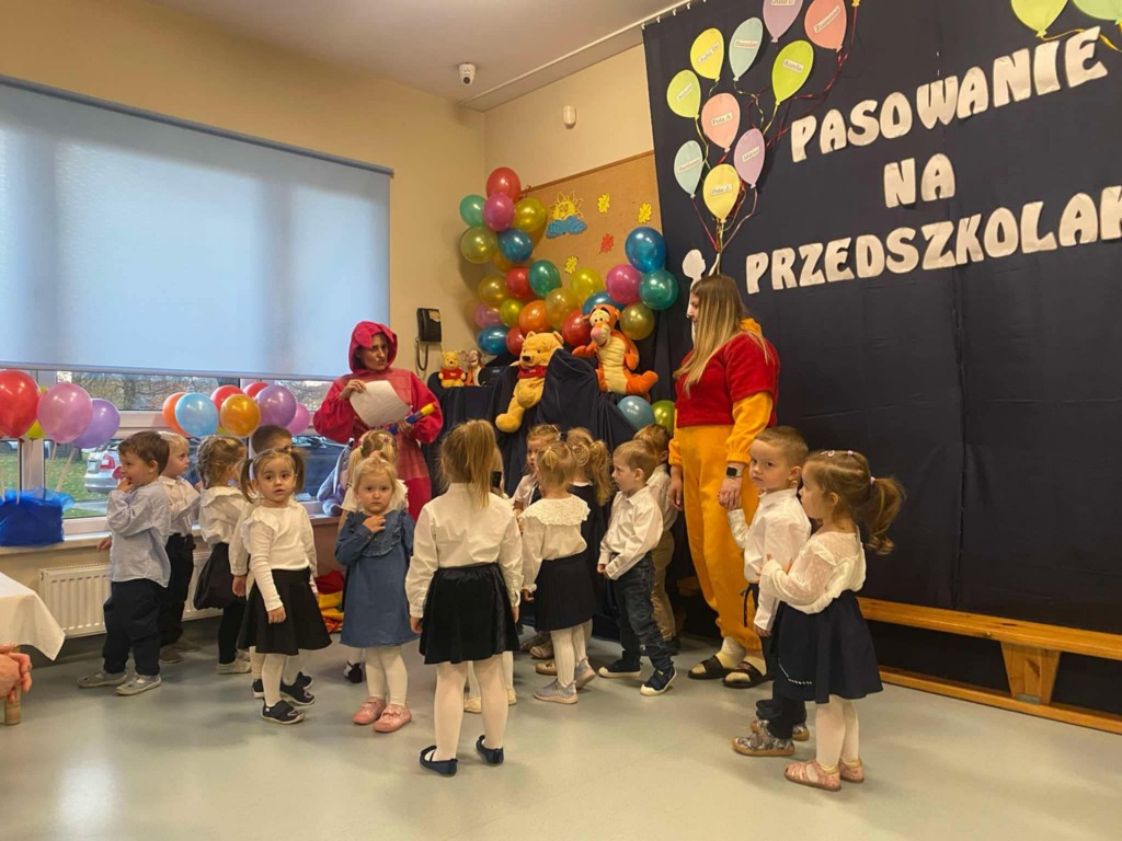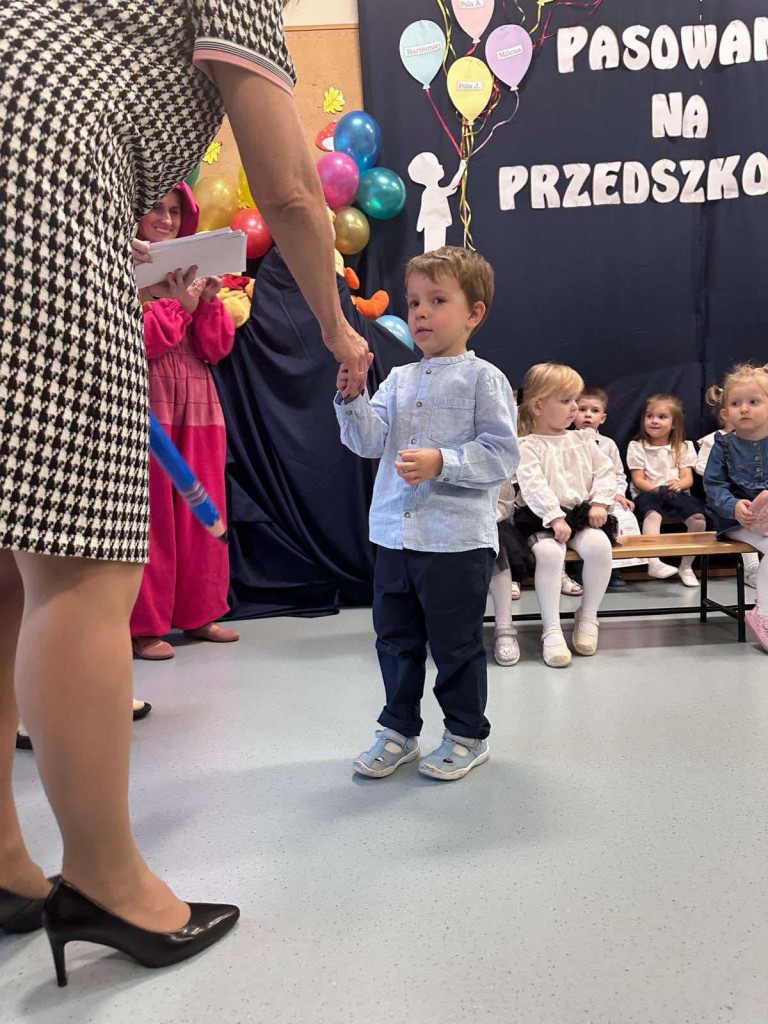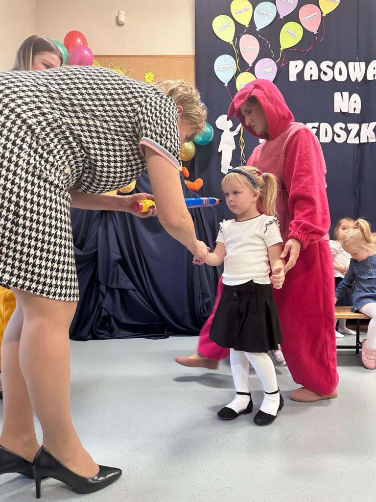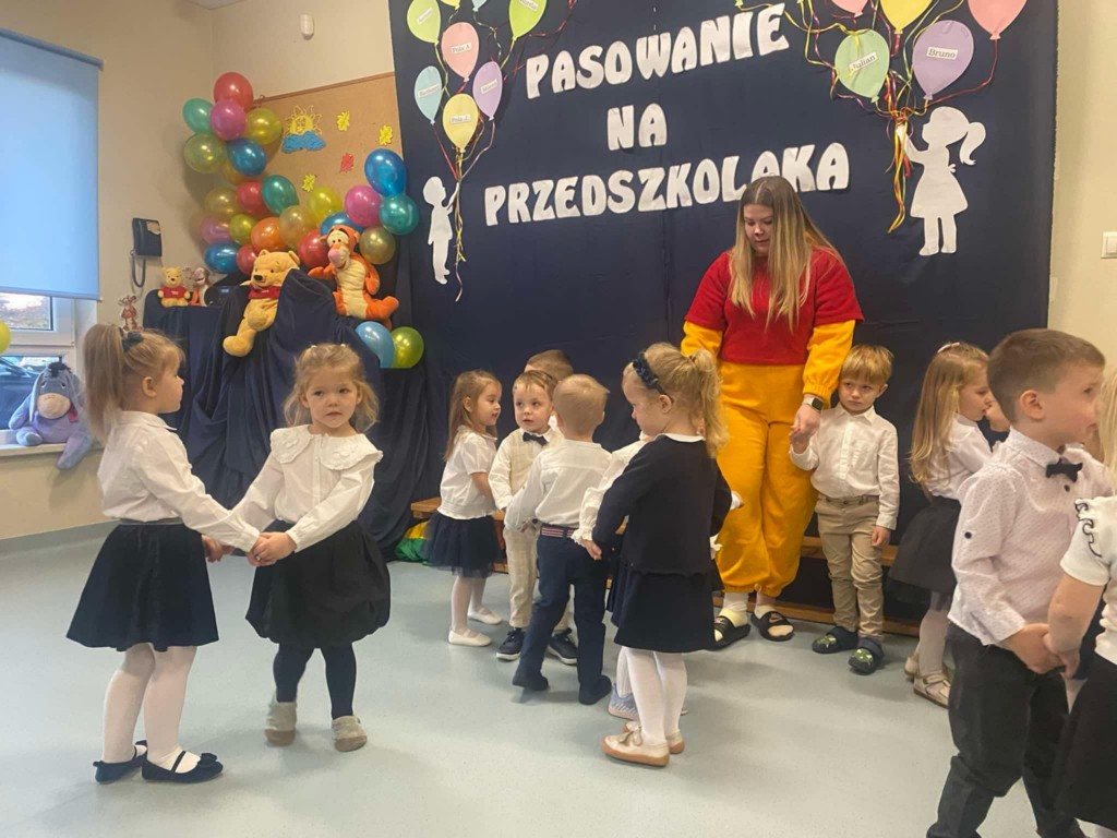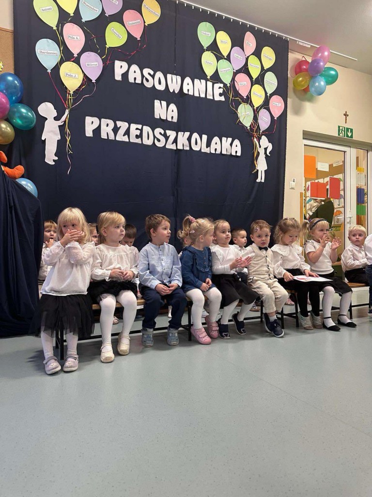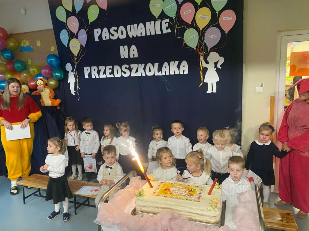 Pasowanie na Przedszkolaka to wyjątkowa uroczystość, która odbyła się w naszej grupie 6 listopada. Zaprosiliśmy na nią naszą Panią Dyrektor oraz kochanych Rodziców. Przedstawiając krótką część artystyczną, pokazaliśmy, że potrafimy mówić wierszyki, śpiewać piosenki, a nawet tańczyć! Dla większości z nas, był to pierwszy występ przed tak licznie zgromadzoną publicznością. Po części artystycznej nastąpił uroczysty akt pasowania - dotknięcie ramienia każdego z nas dużym ołówkiem przez Panią Dyrektor. Zwieńczeniem tego spotkania był słodki poczęstunek.