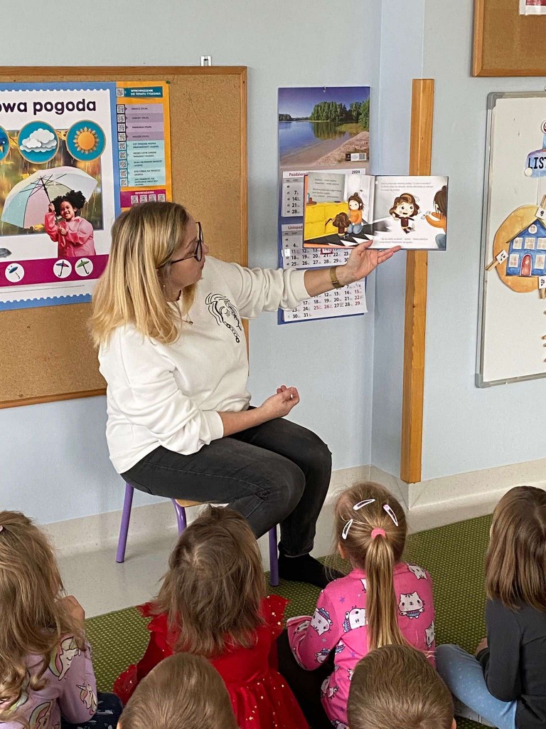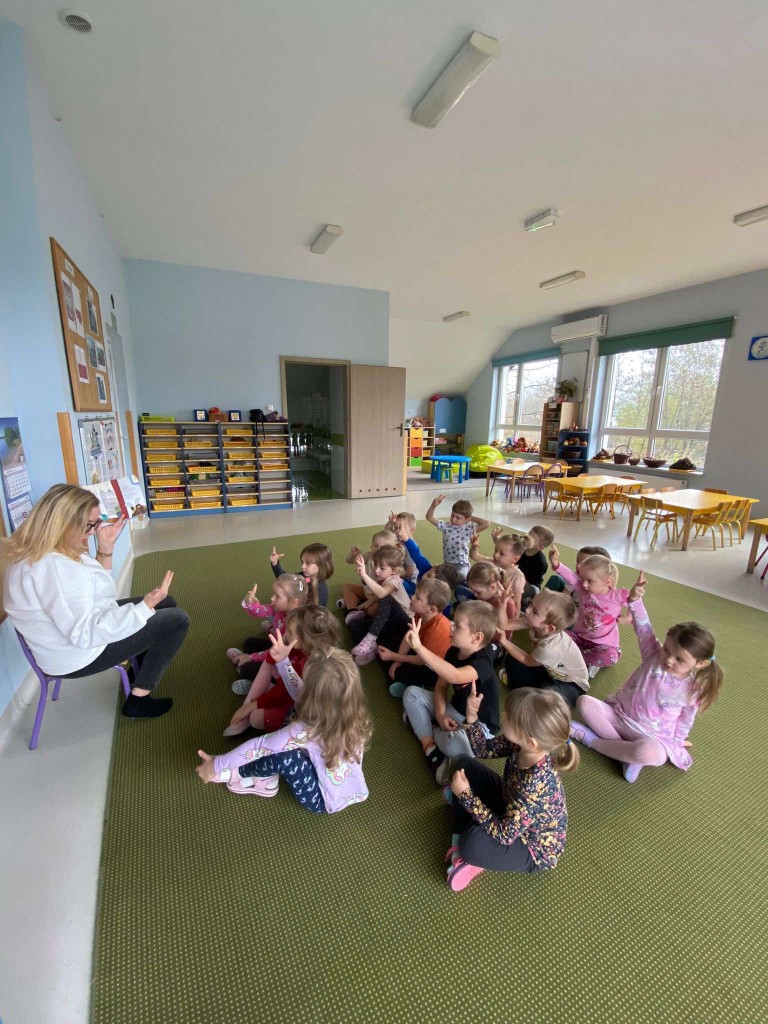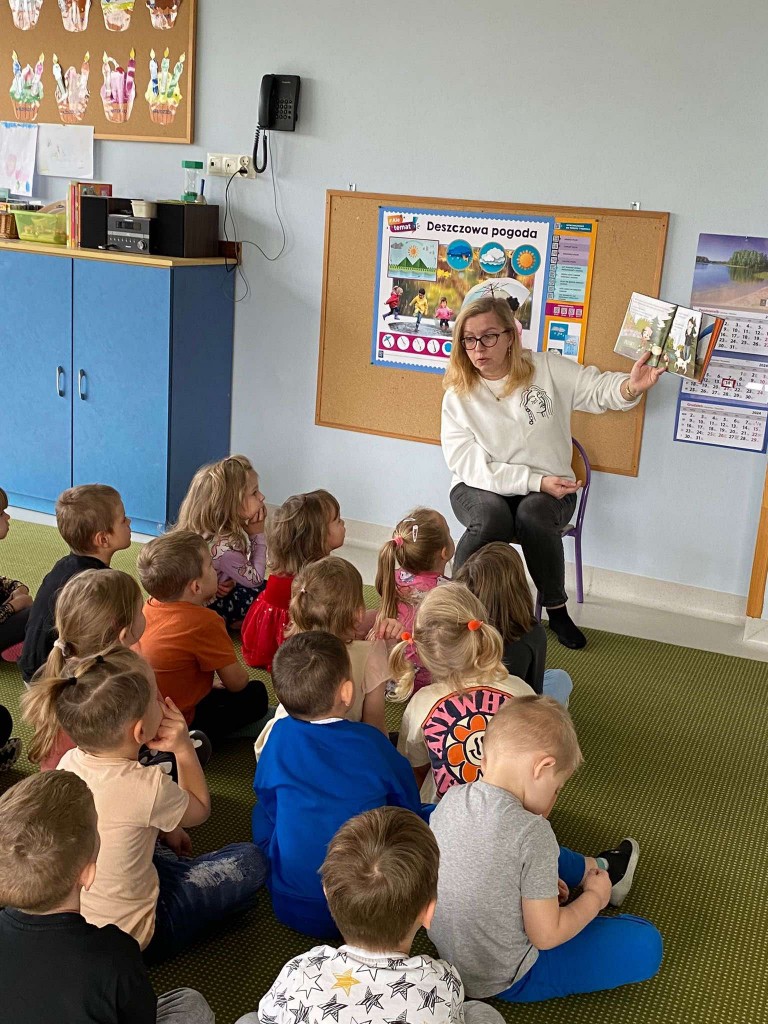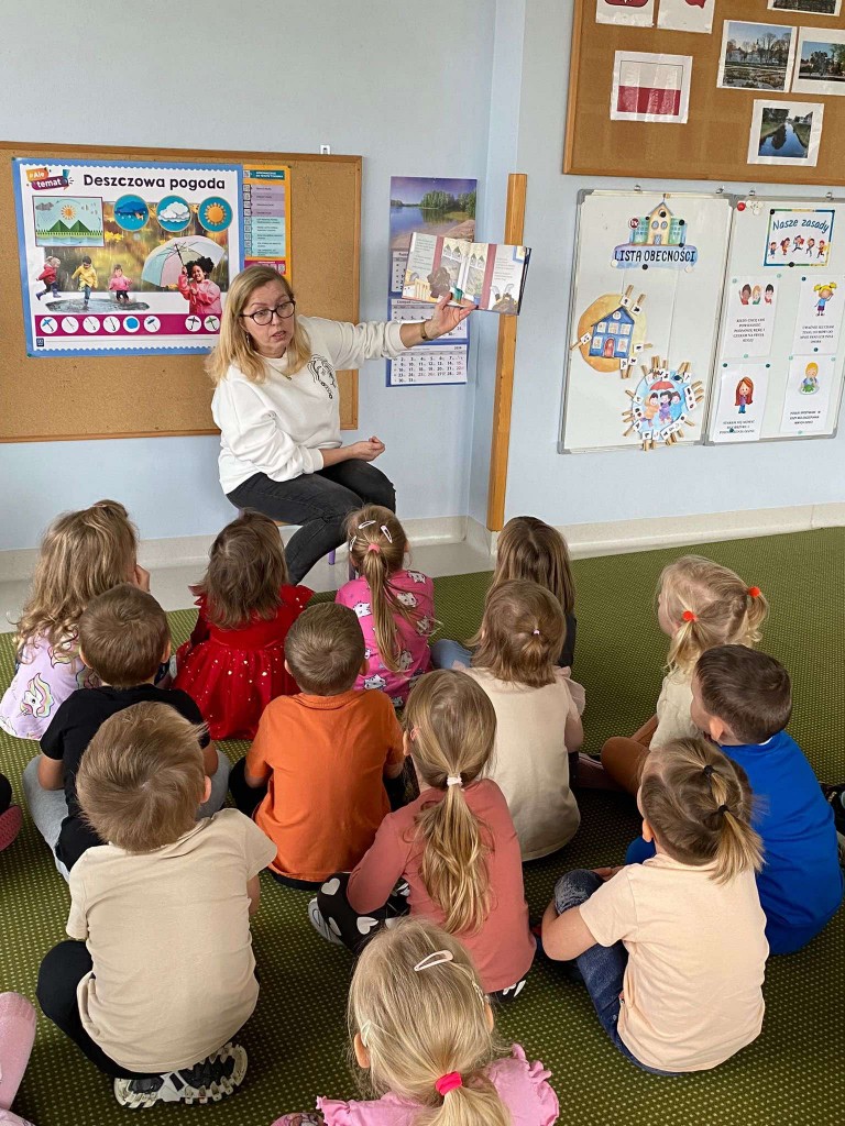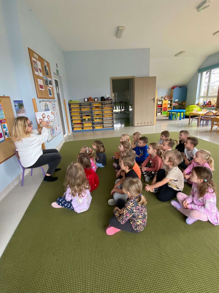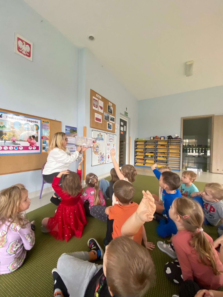 Po raz pierwszy 14 listopada uczestniczyliśmy w spotkaniu pod hasłem: „Minutki z książką”. Spotkania te prowadzą panie bibliotekarki z Biblioteki Pedagogicznej. W trakcie pierwszych zajęć słuchaliśmy opowiadania, którego bohaterką była Jadzia Pętelka i jej przygody na jesiennym spacerze. Potem rozmawialiśmy na temat tych przygód i na tej podstawie wiemy, jak ważne jest dostosowywanie ubrania do aktualnej pogody. Kiedy jesteśmy dobrze ubrani, nie grozi nam przeziębienie, a czas spędzony z rodziną będzie radosny. I nawet takie drobne niedogodności, jak koparka ubłocona w kałuży- nie zepsują nam humoru.