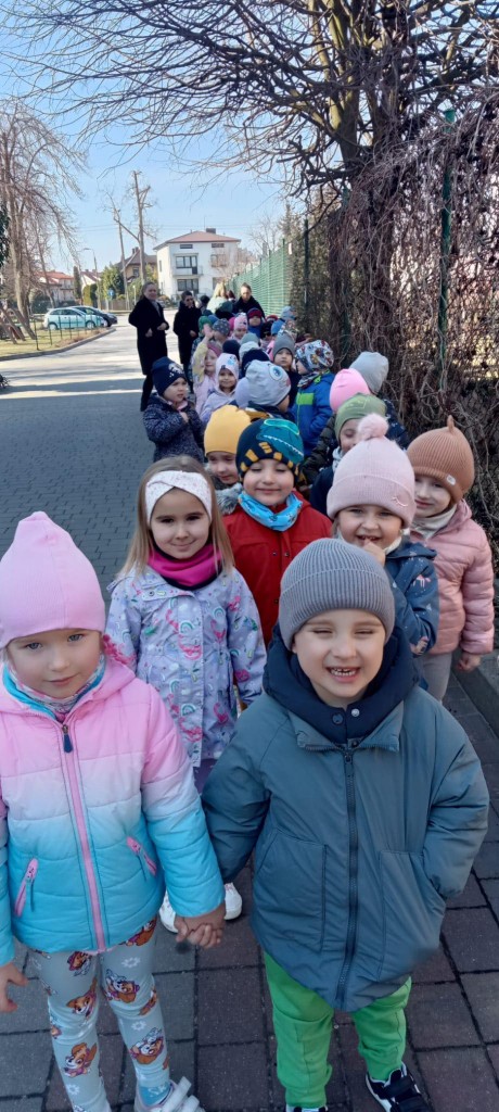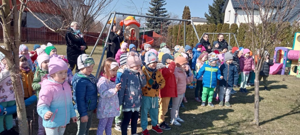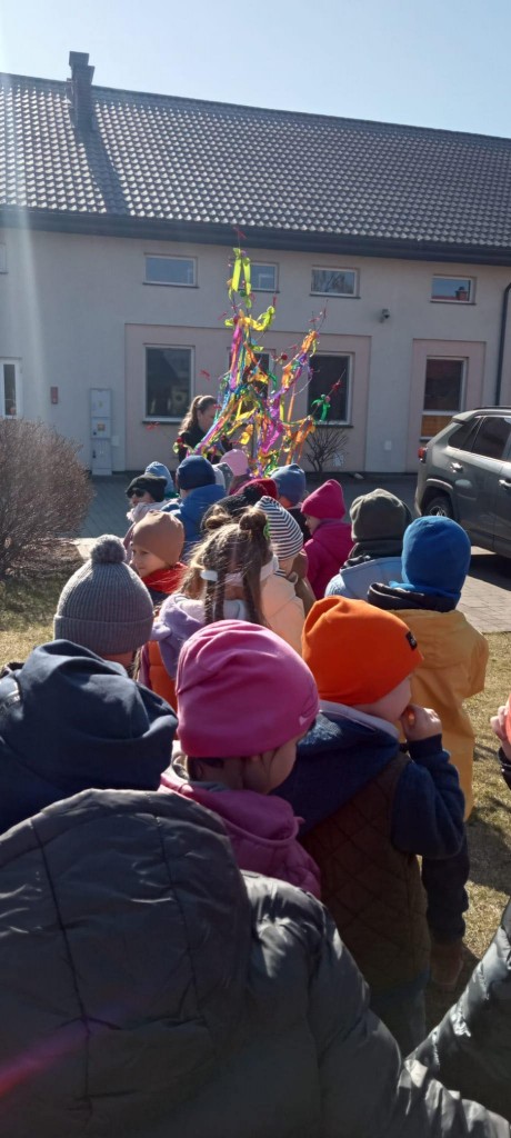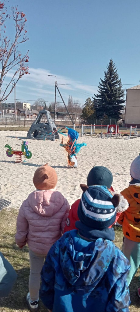 W piątek 21 marca, w pierwszy dzień kalendarzowej wiosny, wzięliśmy udział w tradycyjnym obrzędzie “powitania wiosny i pożegnania zimy”. Po przepysznym śniadanku wzięliśmy własnoręcznie wykonaną przez nas Marzannę i wspólnie z dziećmi z innych grup wyruszyliśmy w pochód dookoła przedszkola, śpiewając wiosenne piosenki. Paląc naszą Marzannę - symbol zimy, oficjalnie pożegnaliśmy zimę i powitaliśmy wiosnę. Nasz pochód zakończyliśmy powrotem do przedszkola z przepięknym “gaikiem - maikiem” wykonanym przez 5-latki, który ozdobił nasz przedszkolny korytarz.