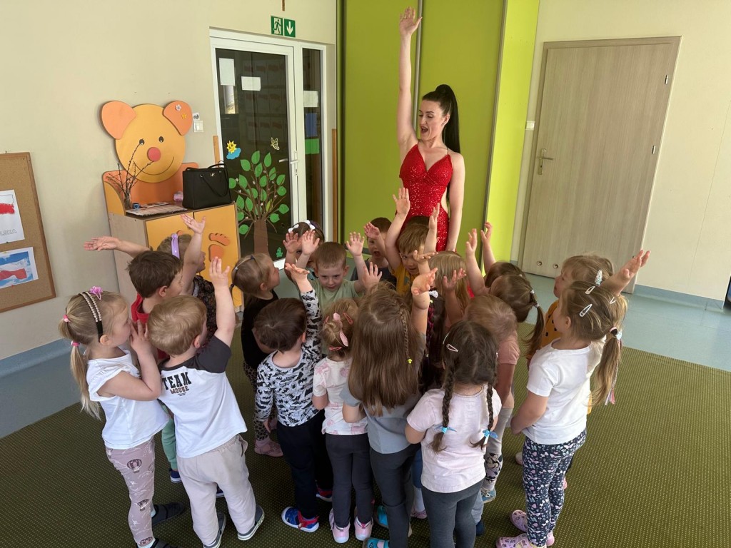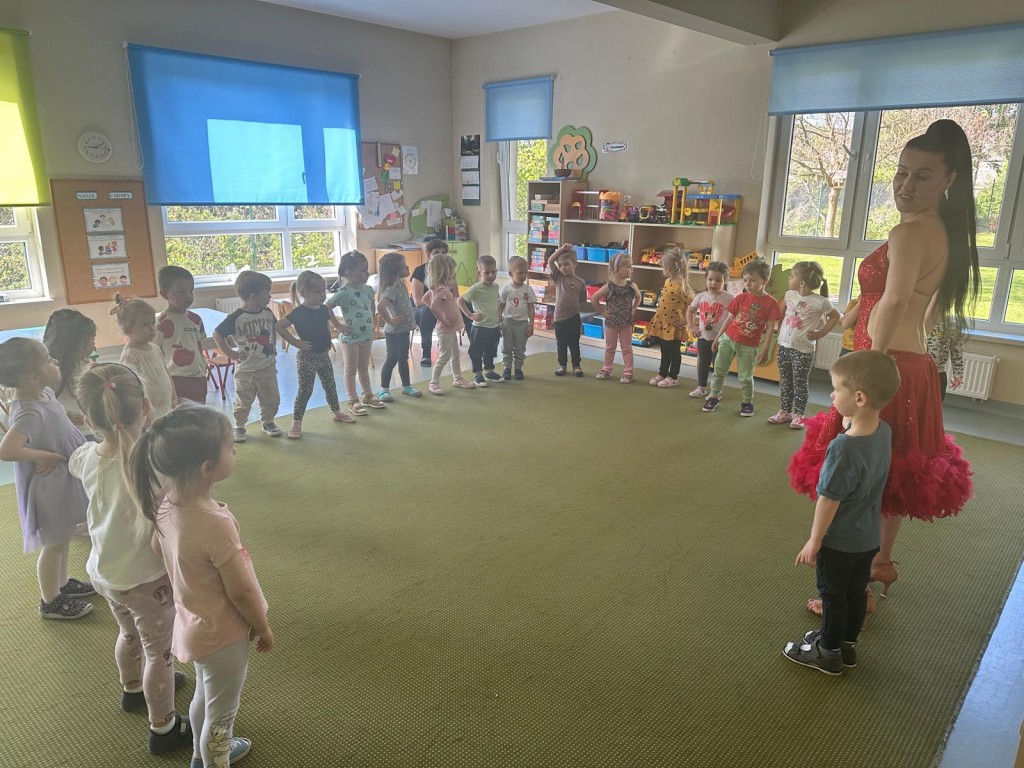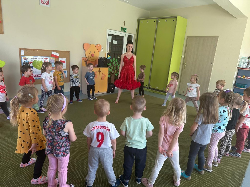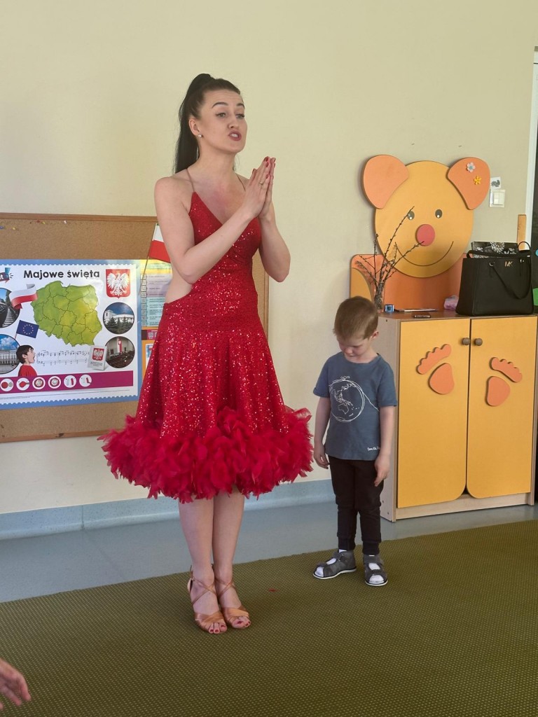 30 kwietnia odwiedziła naszą grupę Pani Magdalena - mama Oskara i opowiedziała nam o zawodzie instruktora tańca. Podczas spotkania mieliśmy okazję zobaczyć z bliska profesjonalny strój tancerki oraz poznaliśmy podstawowy krok cza-czy.