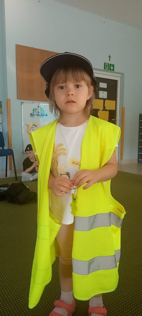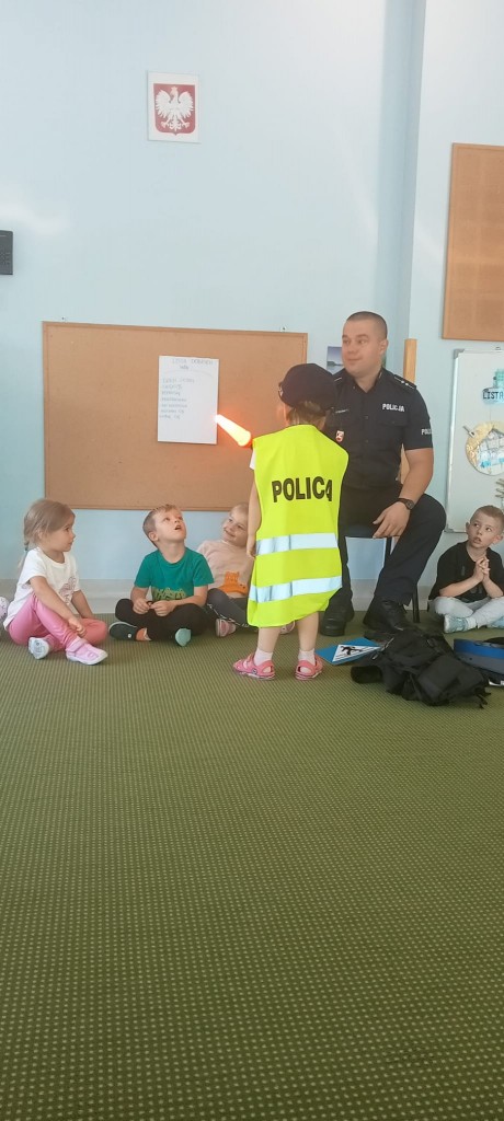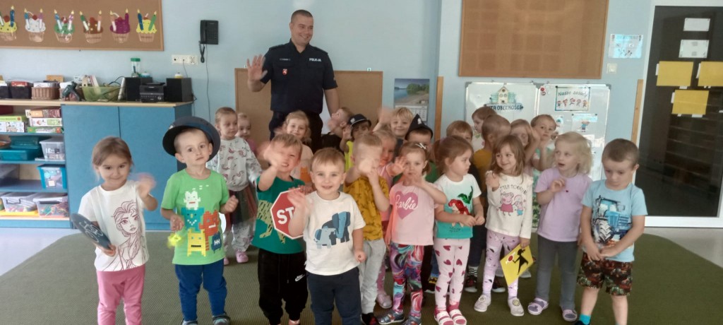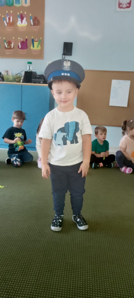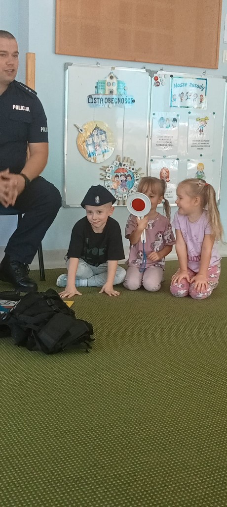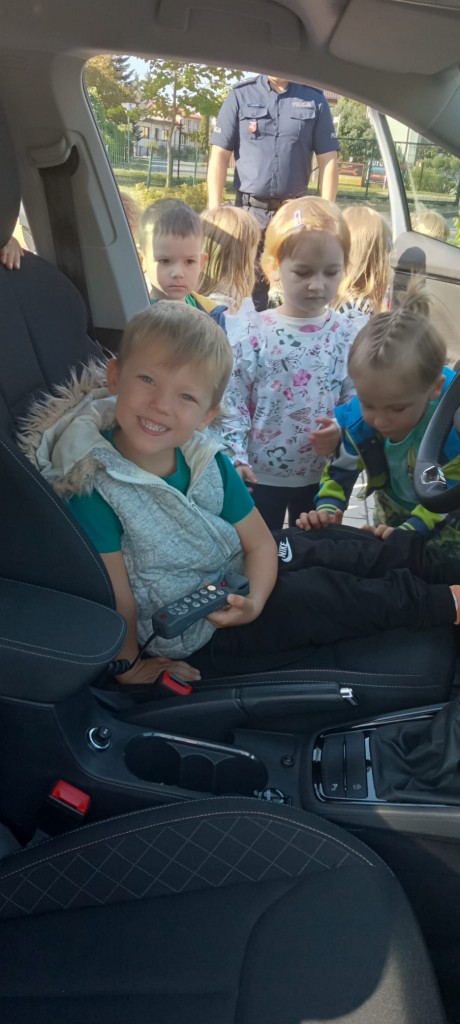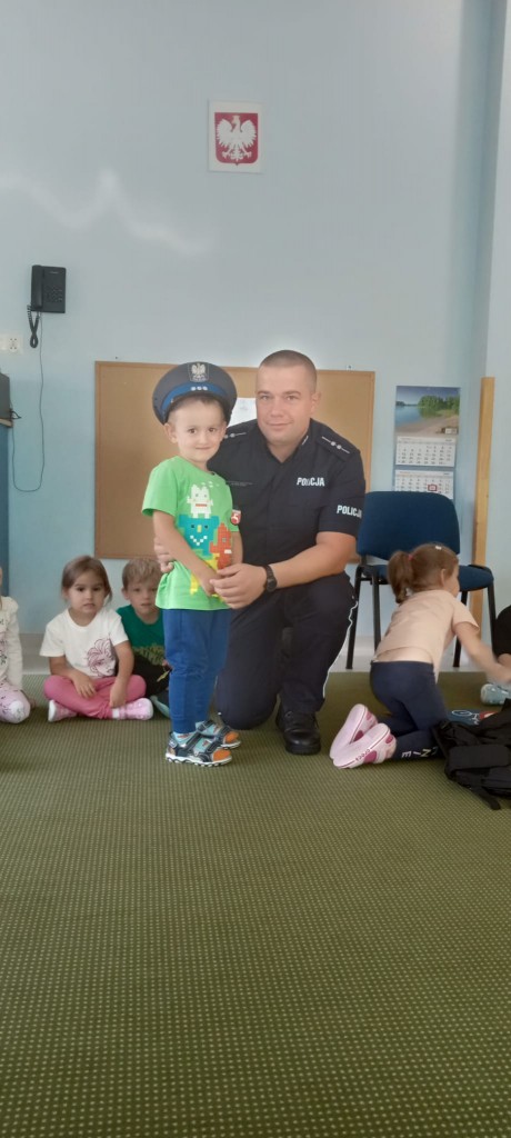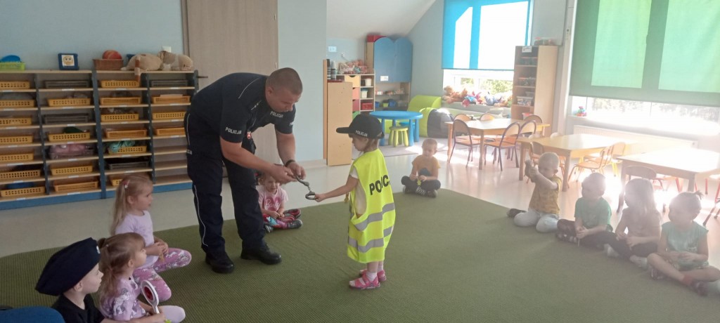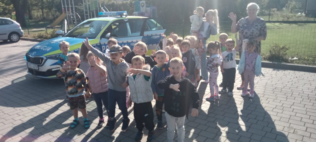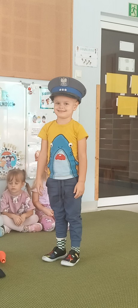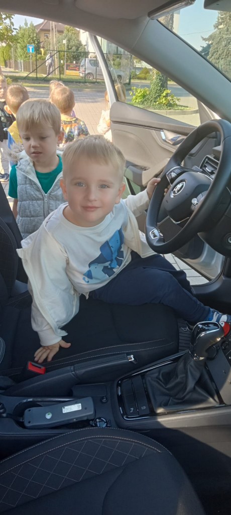 W piątek, 20.09.2024r., naszą grupę odwiedził tata Kordiana, aby przedstawić nam zawód policjanta. Krótko opowiedział nam o tym, czym zajmuje się policjant, pokazał nam swój strój oraz sprzęt potrzebny mu podczas pracy, a także dał nam malutki prezent – breloczek odblaskowy w kształcie misia. Na zakończenie mieliśmy okazję usiąść za kierownicą radiowozu.