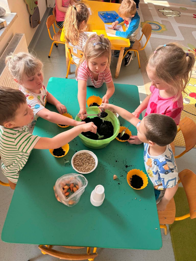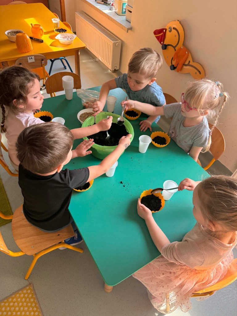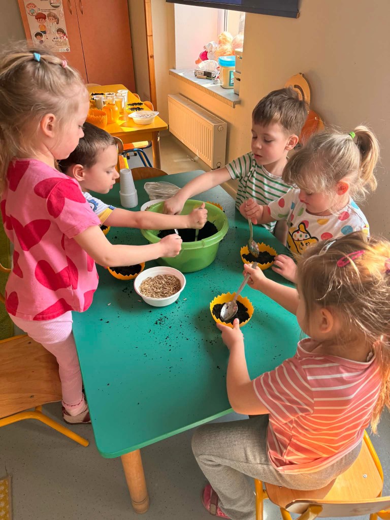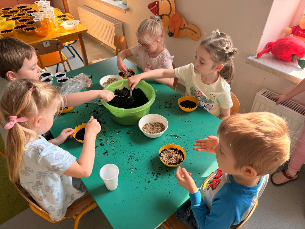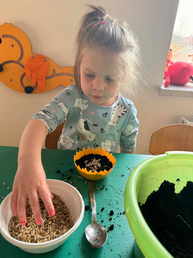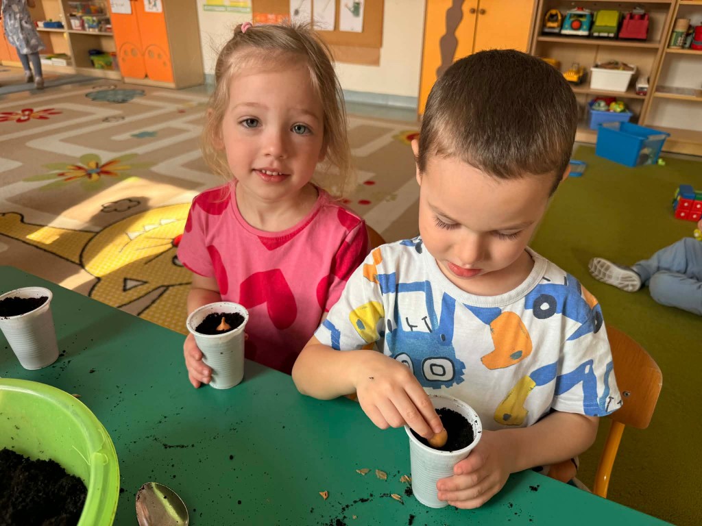 W pierwszym tygodniu kwietnia rozpoczęliśmy przygotowania do Świąt Wielkanocnych. Poznaliśmy tradycje i zwyczaje wielkanocne, a także uczyliśmy się wierszy i piosenek o Wielkanocy. W środę, każde dziecko w swojej doniczce wysiało owies, którym później ozdobi stół wielkanocny. Sialiśmy także rzeżuchę i sadziliśmy cebulki. W czwartek poznaliśmy właściwości jajka, następnie wyklejaliśmy plasteliną szablony jajek, z których powstały przepiękne pisanki.