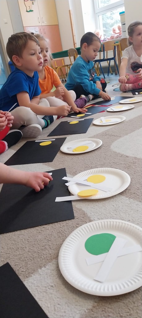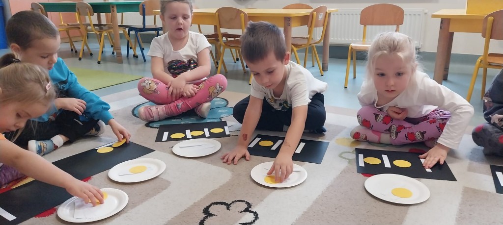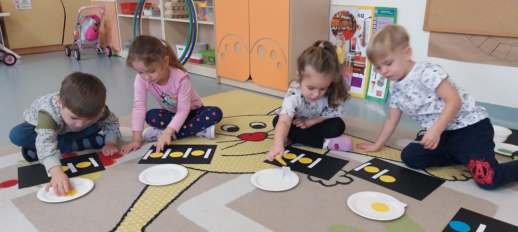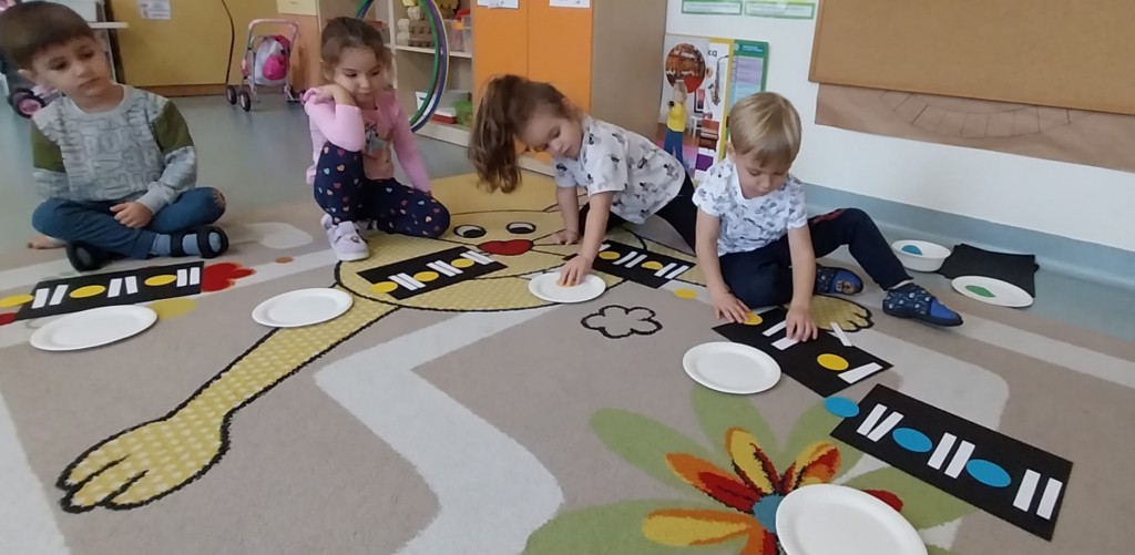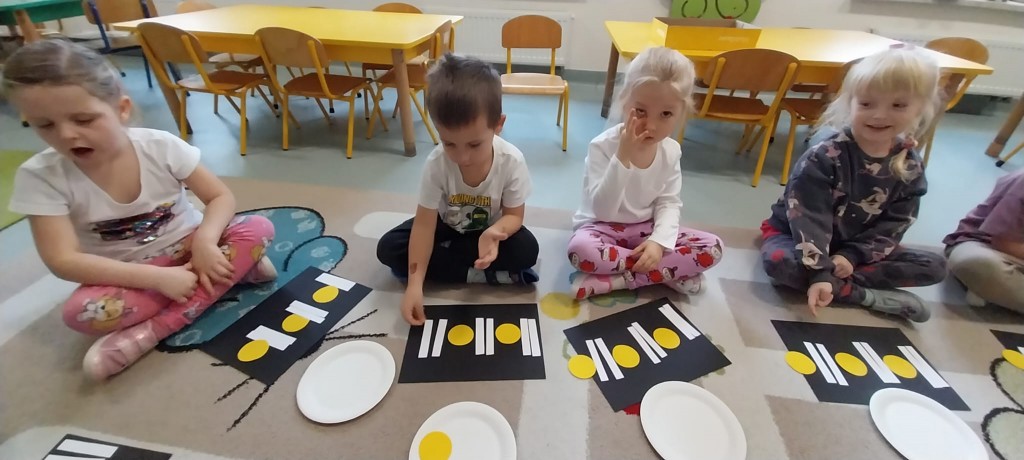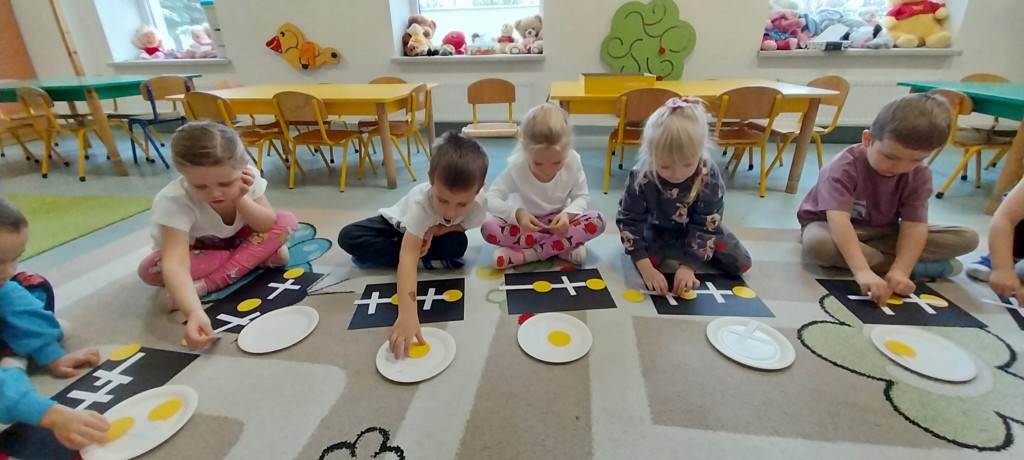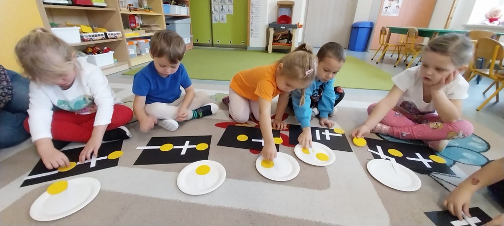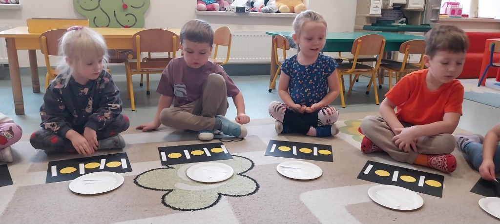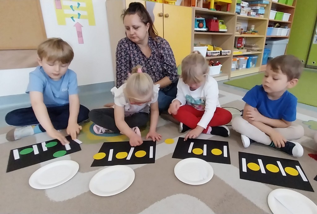 W ostatnich dniach dzieci uczestniczyły w zajęciach rozwijających kompetencje matematyczne w oparciu o program „Dziecięca matematyka”. Podczas wspólnych aktywności uczyły się dostrzegać elementy następujące po sobie, układały rytmy oraz rozpoznawały powtarzające się sekwencje.