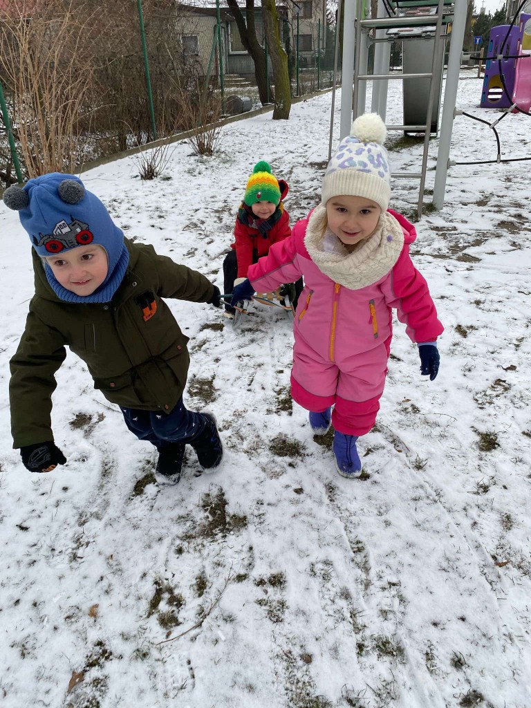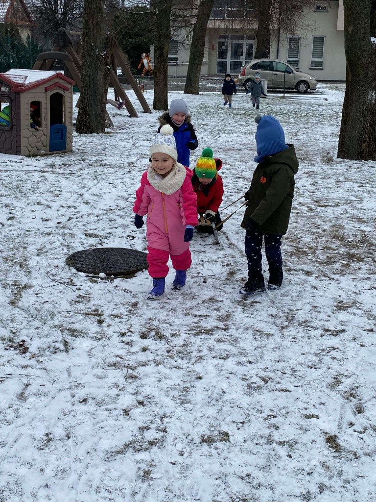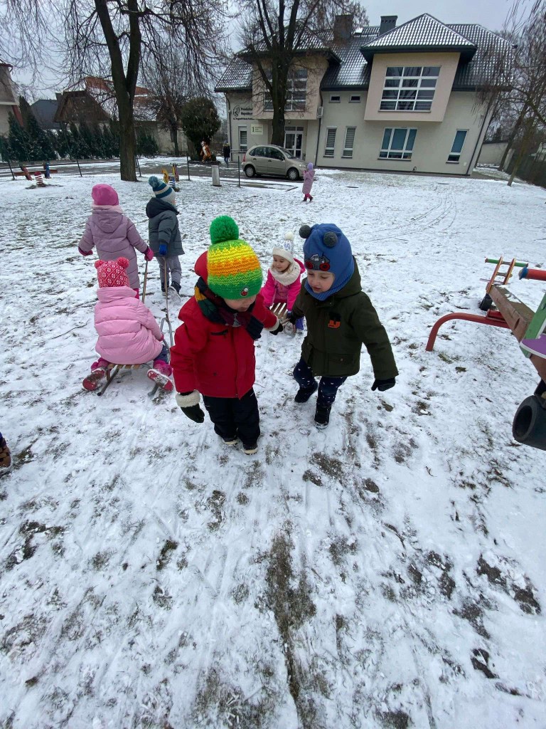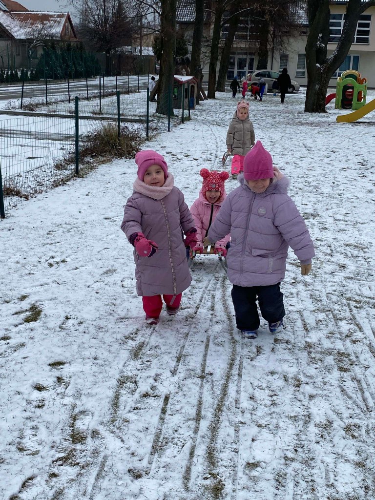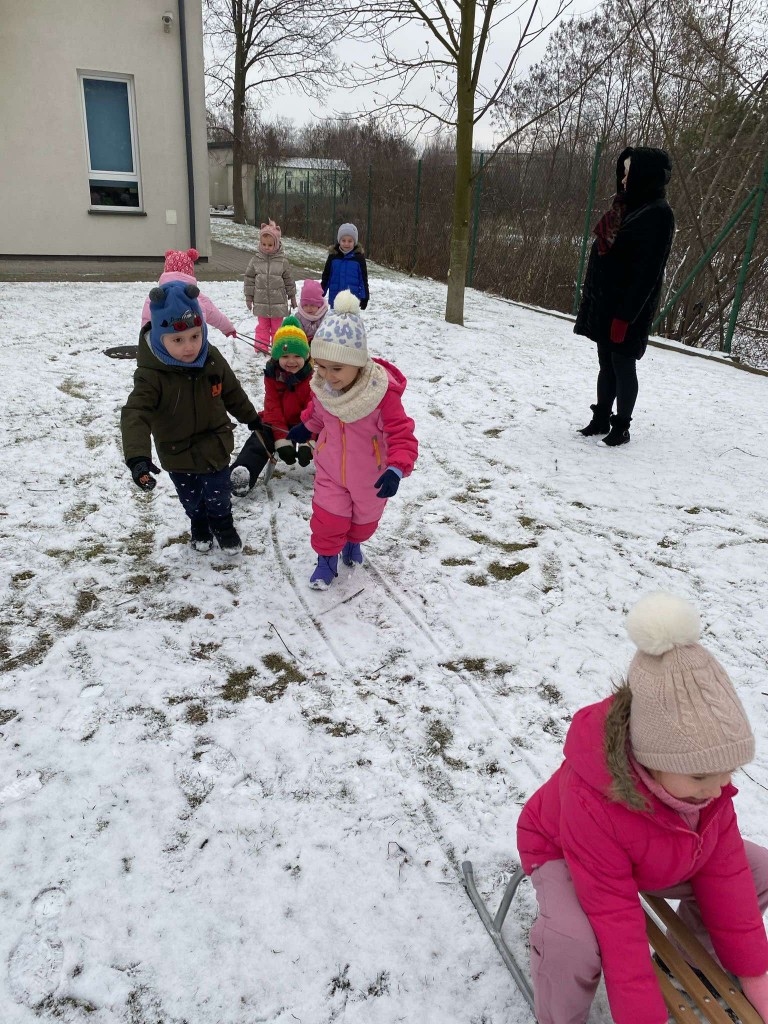 Tegoroczna zima skąpi nam śniegu. Dlatego też, gdy pojawiły się niewielkie opady wzięliśmy saneczki i ruszyliśmy na plac zabaw. Taka zabawa sprawiła nam bardzo dużo radości. Mogliśmy sprawdzić, czy mamy dość siły, by ciągnąć saneczki z pasażerem. Dbaliśmy też o to, aby nie tylko ciągnąć saneczki, ale też by na nich siedzieć i być ciągniętym przez innych.