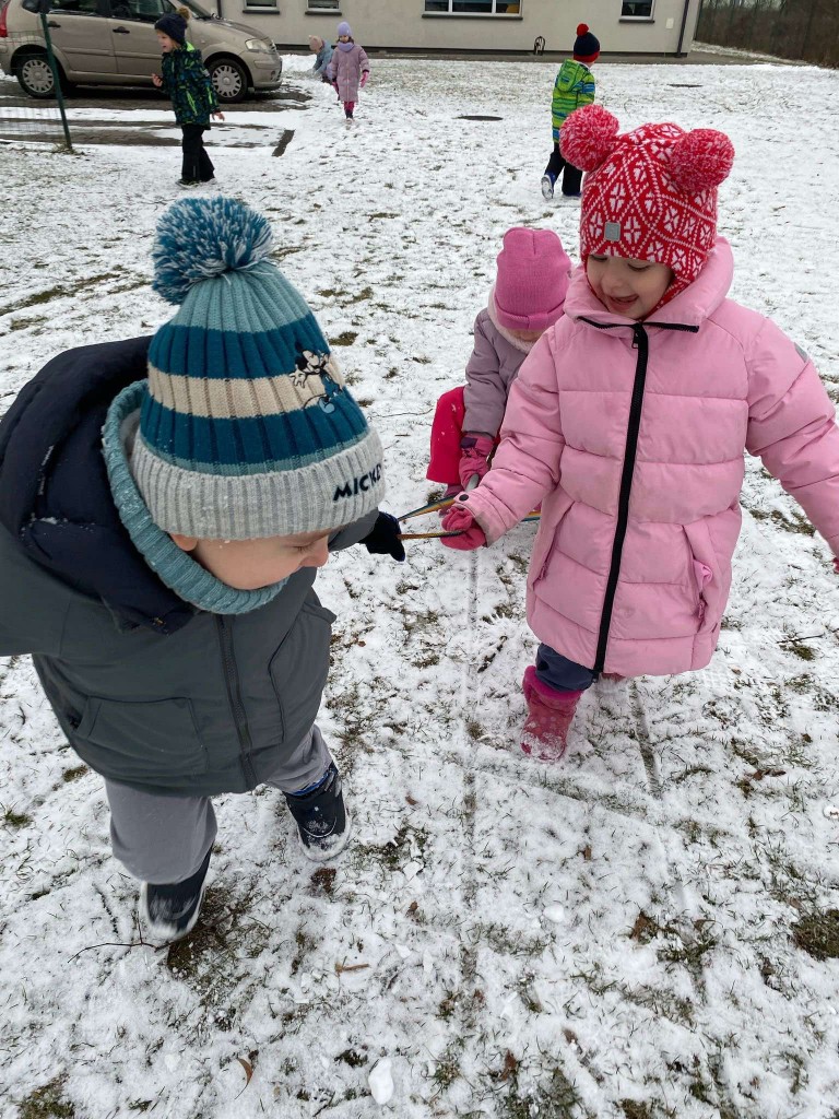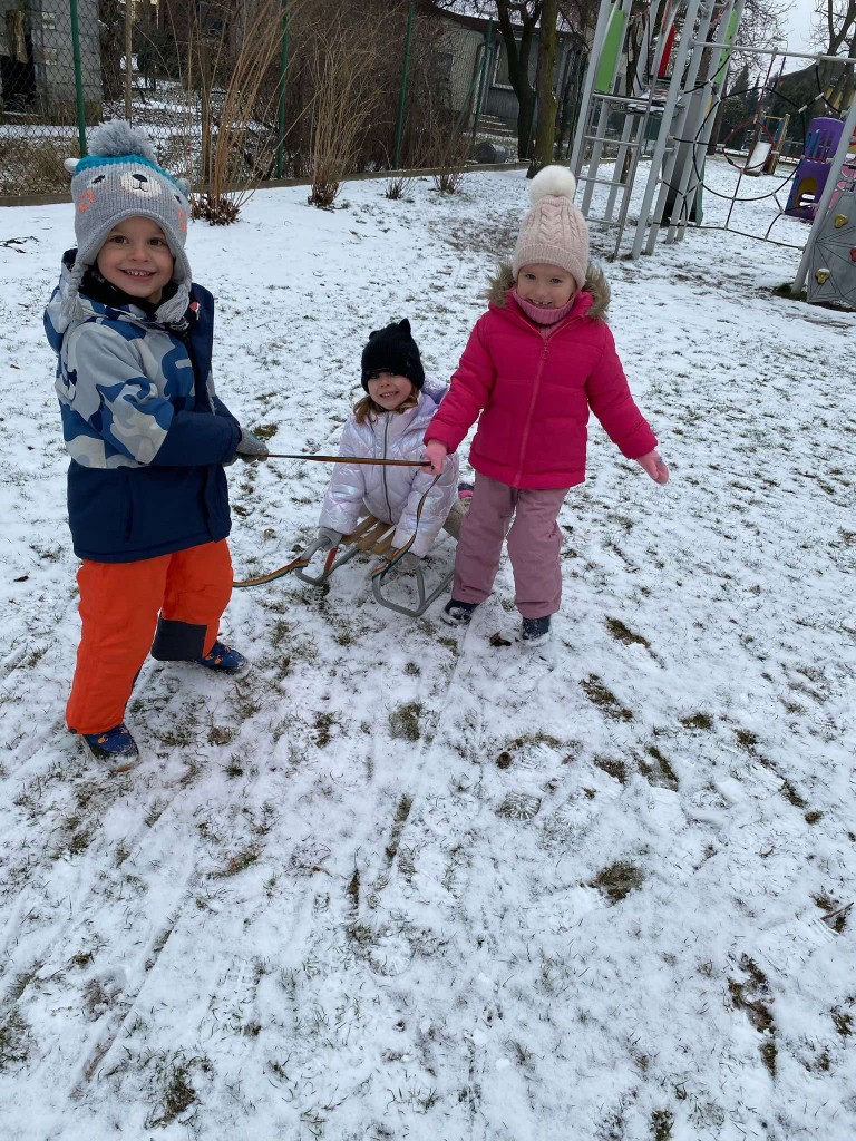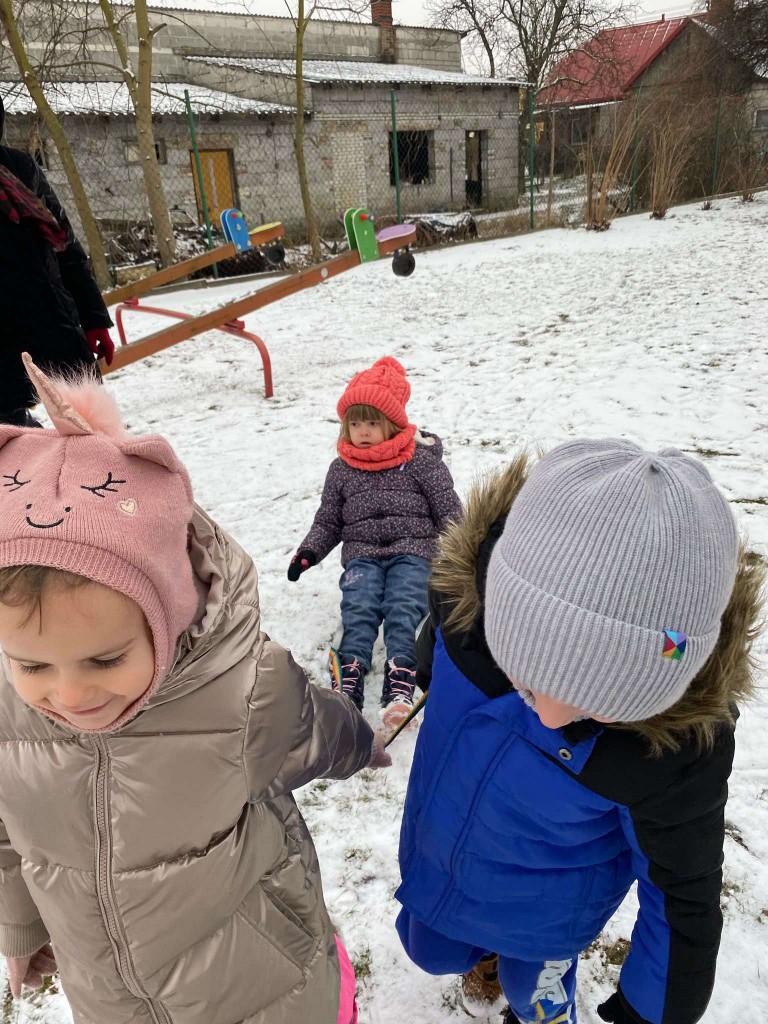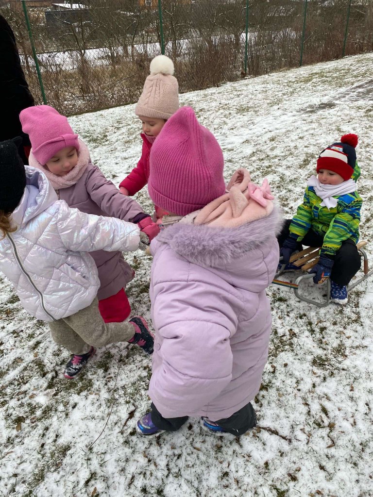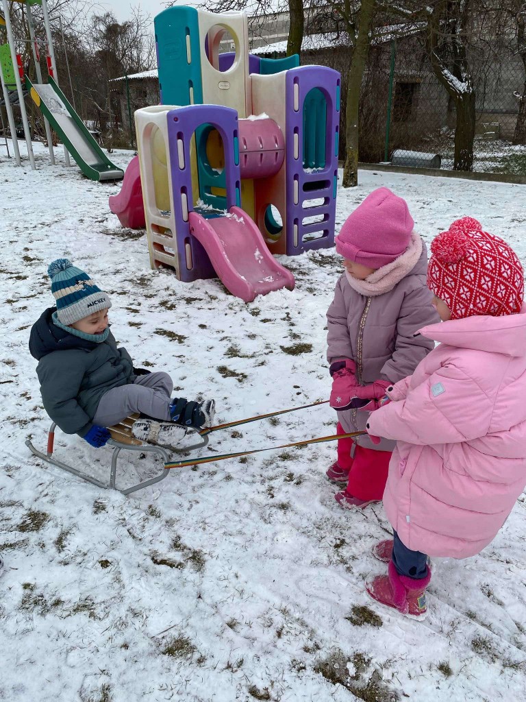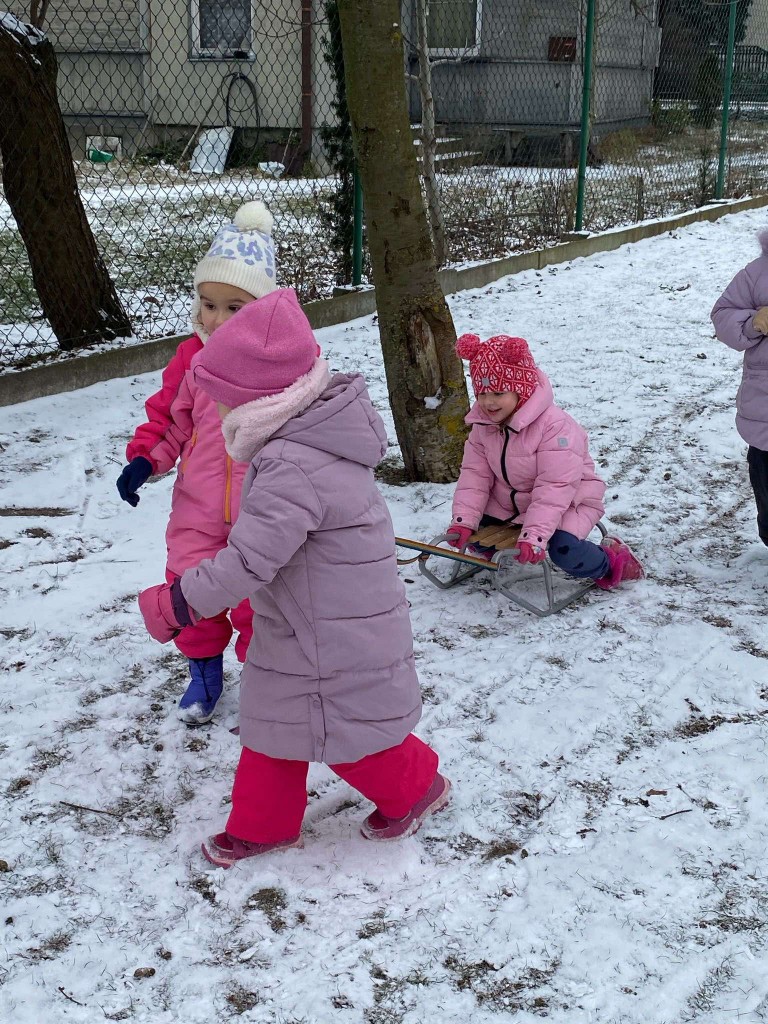 Tegoroczna zima skąpi nam śniegu. Dlatego też, gdy pojawiły się niewielkie opady wzięliśmy saneczki i ruszyliśmy na plac zabaw. Taka zabawa sprawiła nam bardzo dużo radości. Mogliśmy sprawdzić, czy mamy dość siły, by ciągnąć saneczki z pasażerem. Dbaliśmy też o to, aby nie tylko ciągnąć saneczki, ale też by na nich siedzieć i być ciągniętym przez innych.