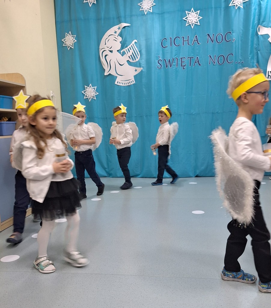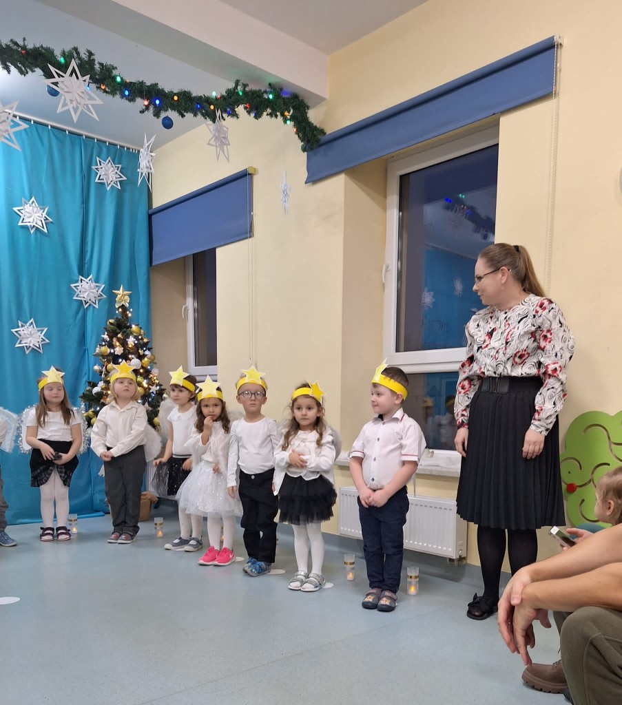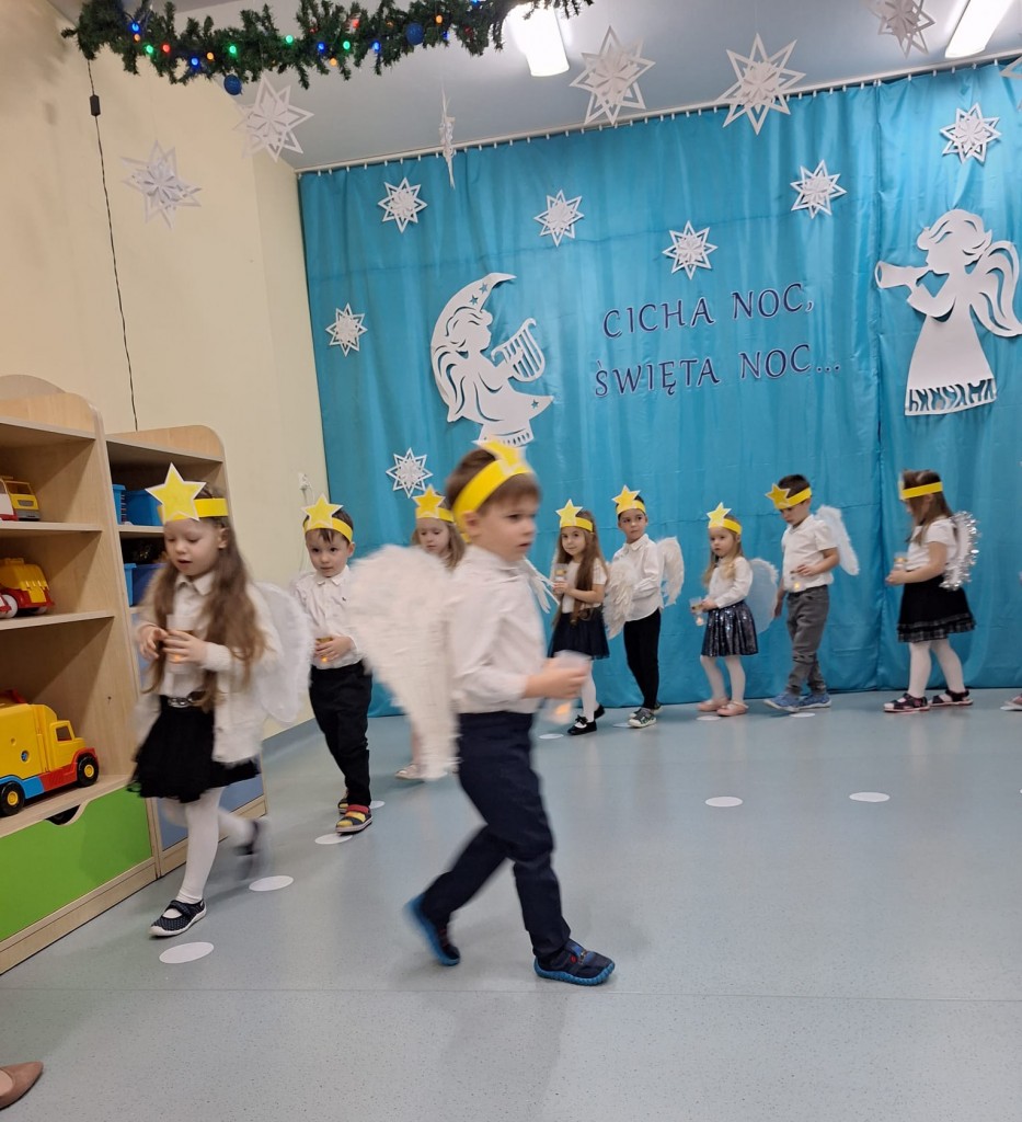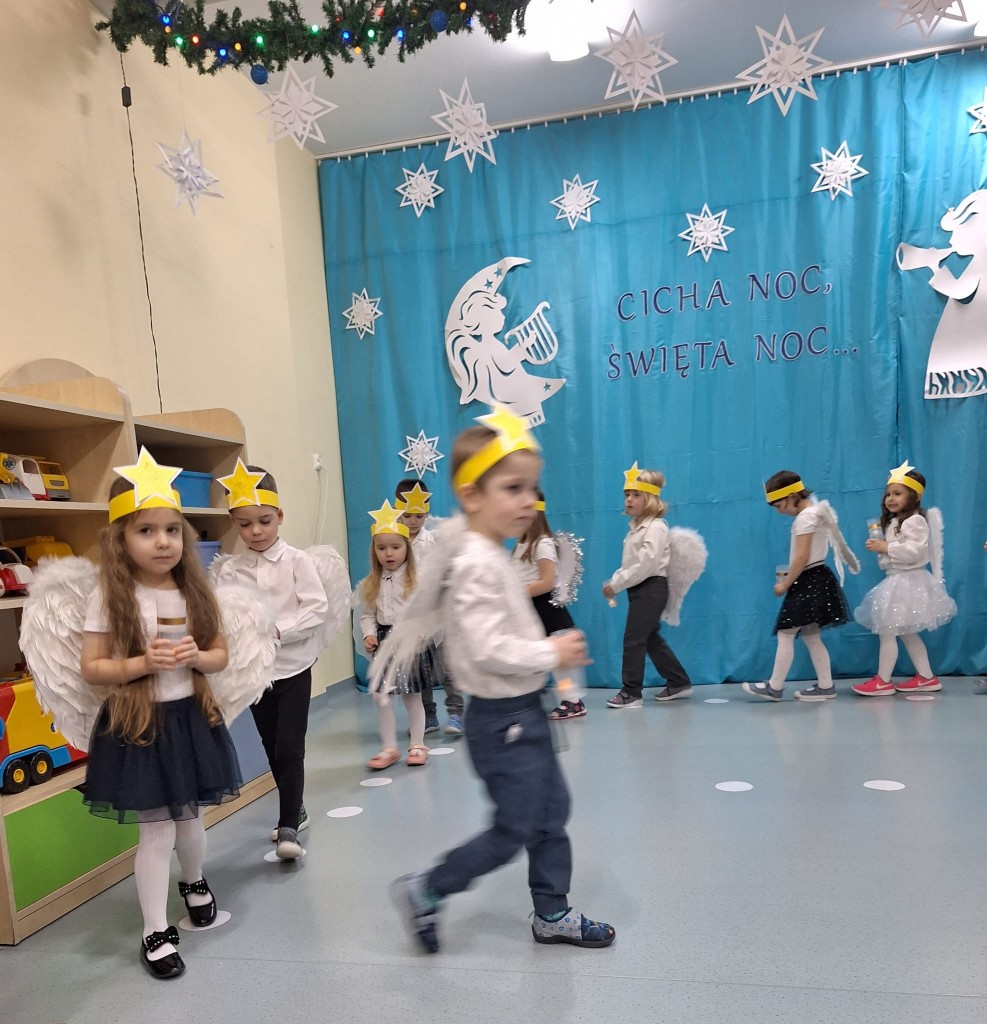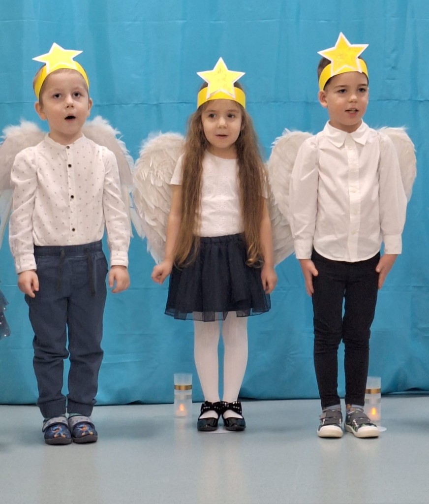 19 grudnia do naszej grupy zaprosiliśmy niezwykłych gości – Rodziców. Staraliśmy się wprowadzić naszych bliskich w czas oczekiwania na Narodziny Jezusa Pana. Wystąpiliśmy, jako chór Aniołów głoszących dobrą nowinę. Inscenizacja przeplatana była recytacją, śpiewem kolęd oraz tańcem.