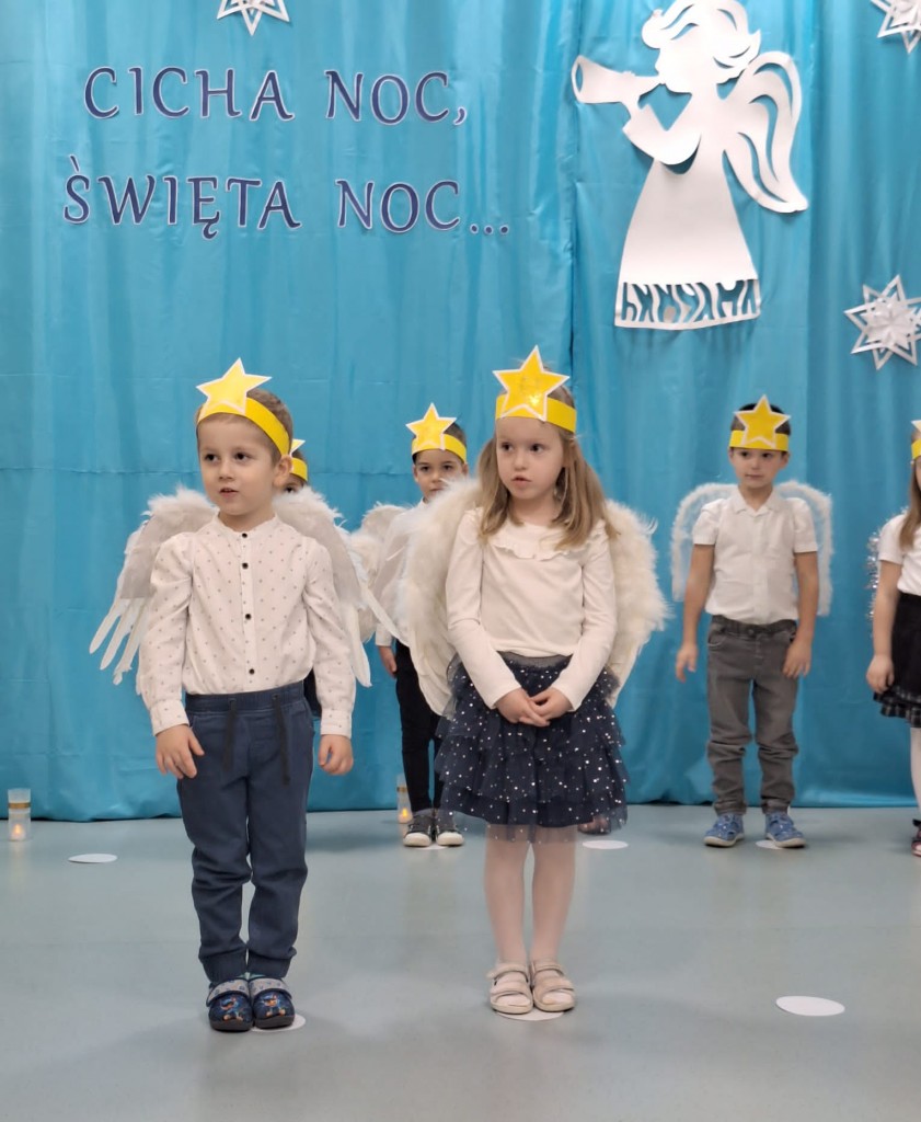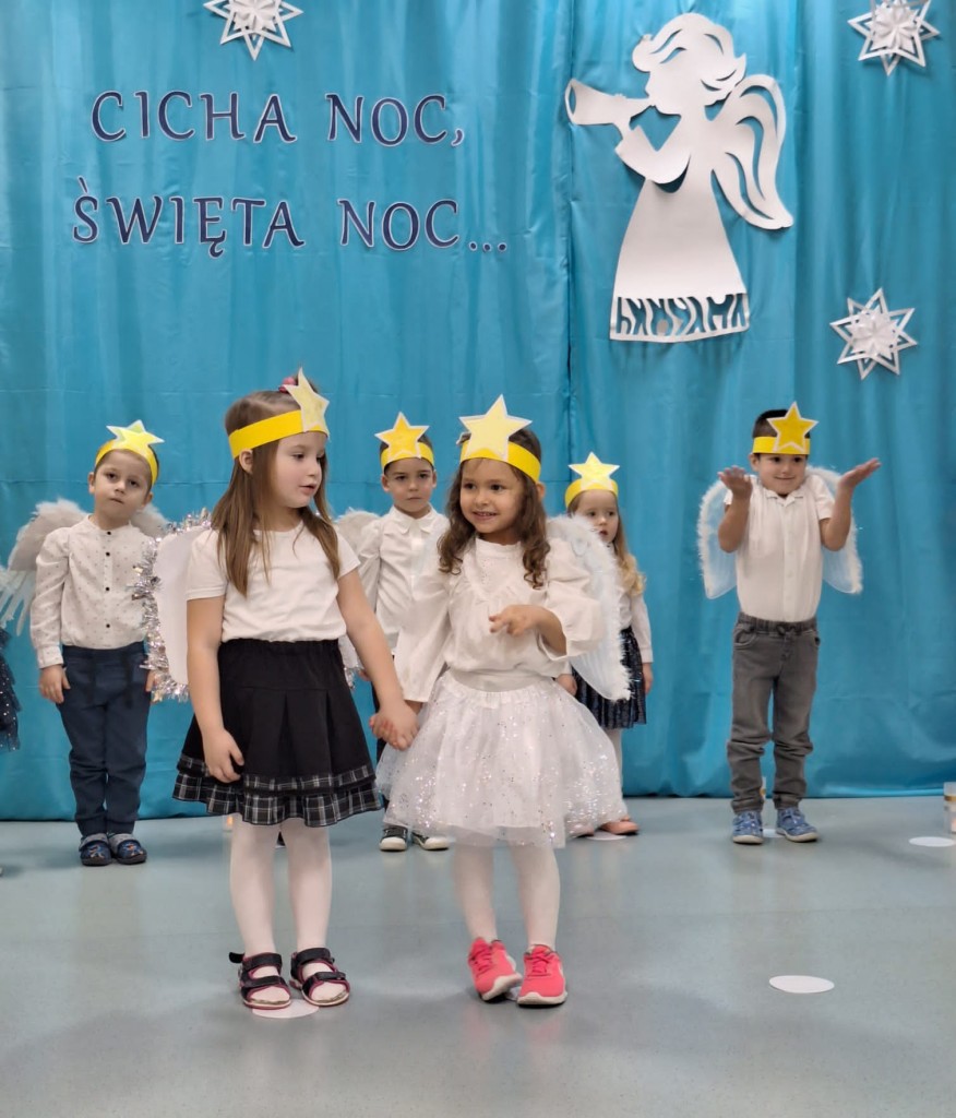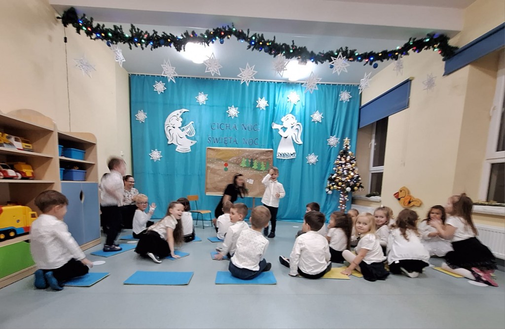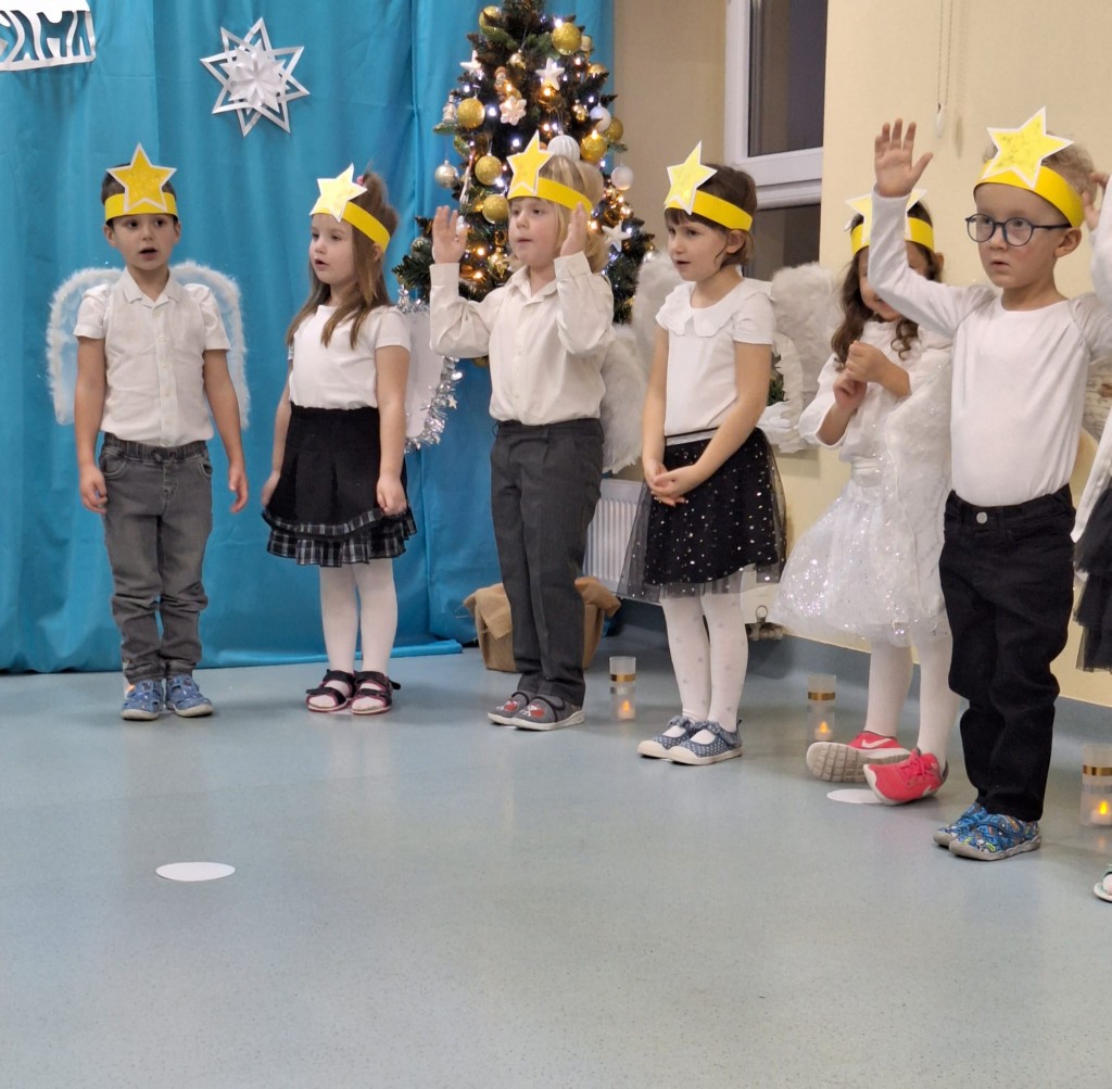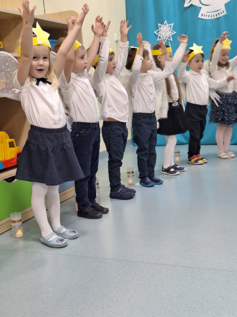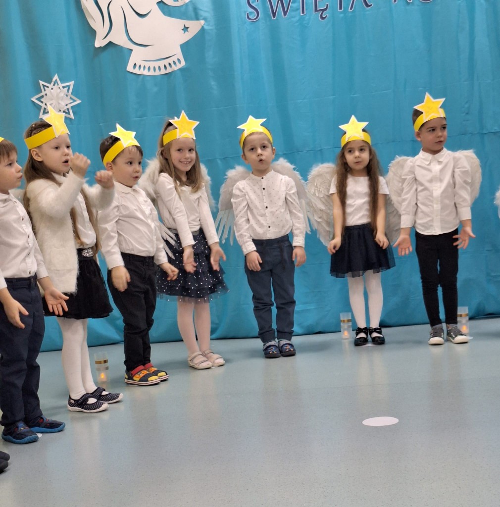 19 grudnia do naszej grupy zaprosiliśmy niezwykłych gości – Rodziców. Staraliśmy się wprowadzić naszych bliskich w czas oczekiwania na Narodziny Jezusa Pana. Wystąpiliśmy, jako chór Aniołów głoszących dobrą nowinę. Inscenizacja przeplatana była recytacją, śpiewem kolęd oraz tańcem.