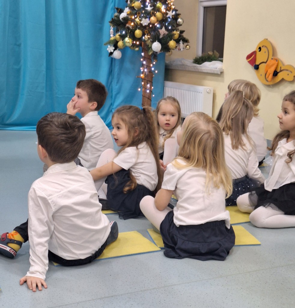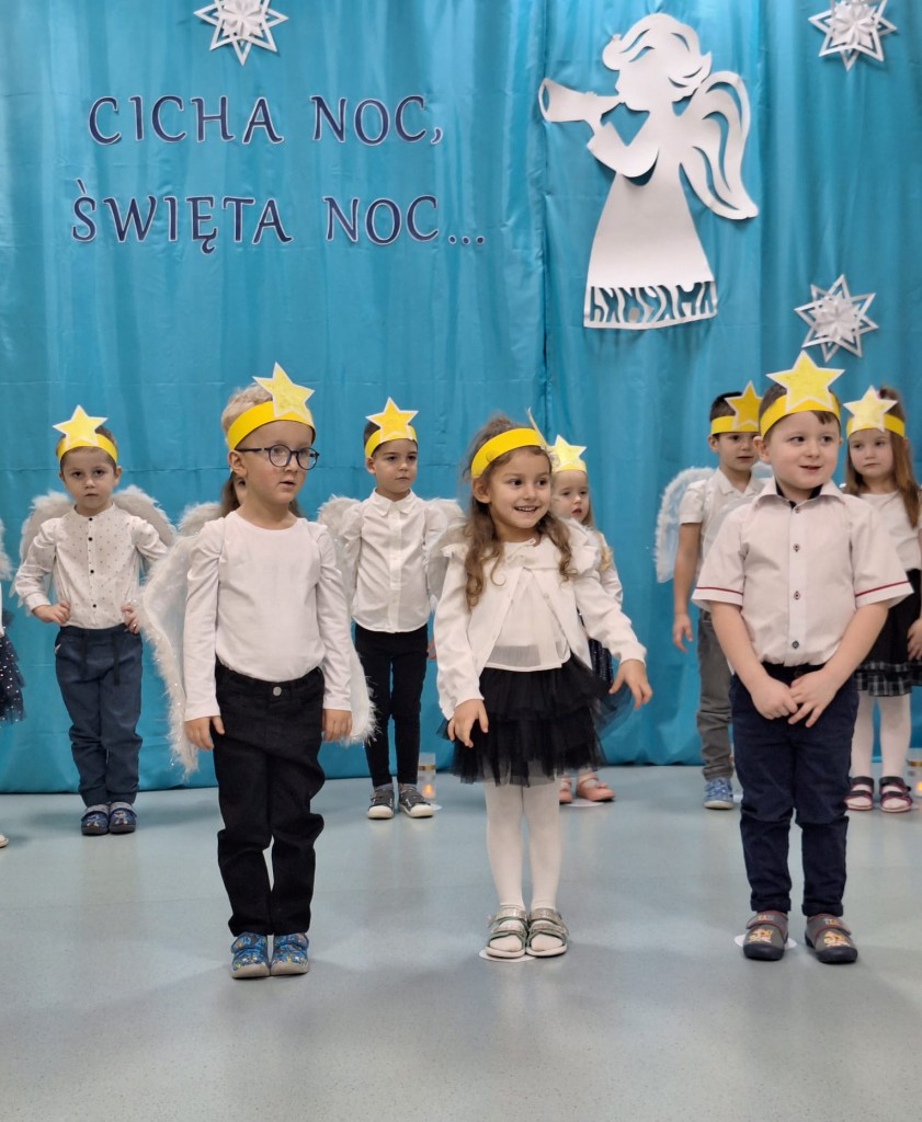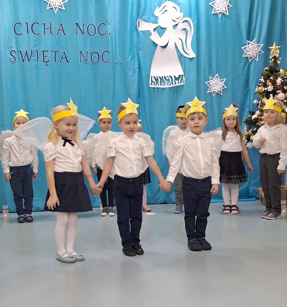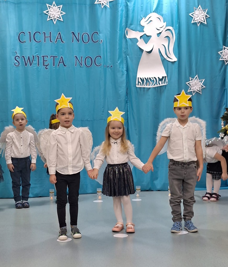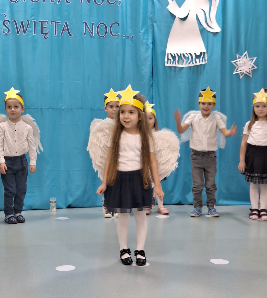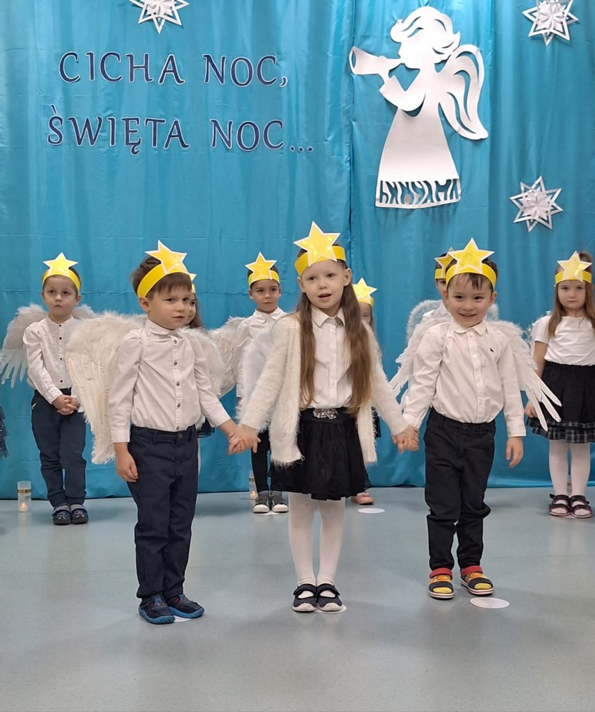 19 grudnia do naszej grupy zaprosiliśmy niezwykłych gości – Rodziców. Staraliśmy się wprowadzić naszych bliskich w czas oczekiwania na Narodziny Jezusa Pana. Wystąpiliśmy, jako chór Aniołów głoszących dobrą nowinę. Inscenizacja przeplatana była recytacją, śpiewem kolęd oraz tańcem.