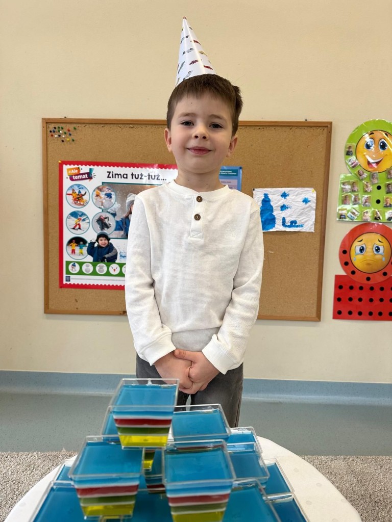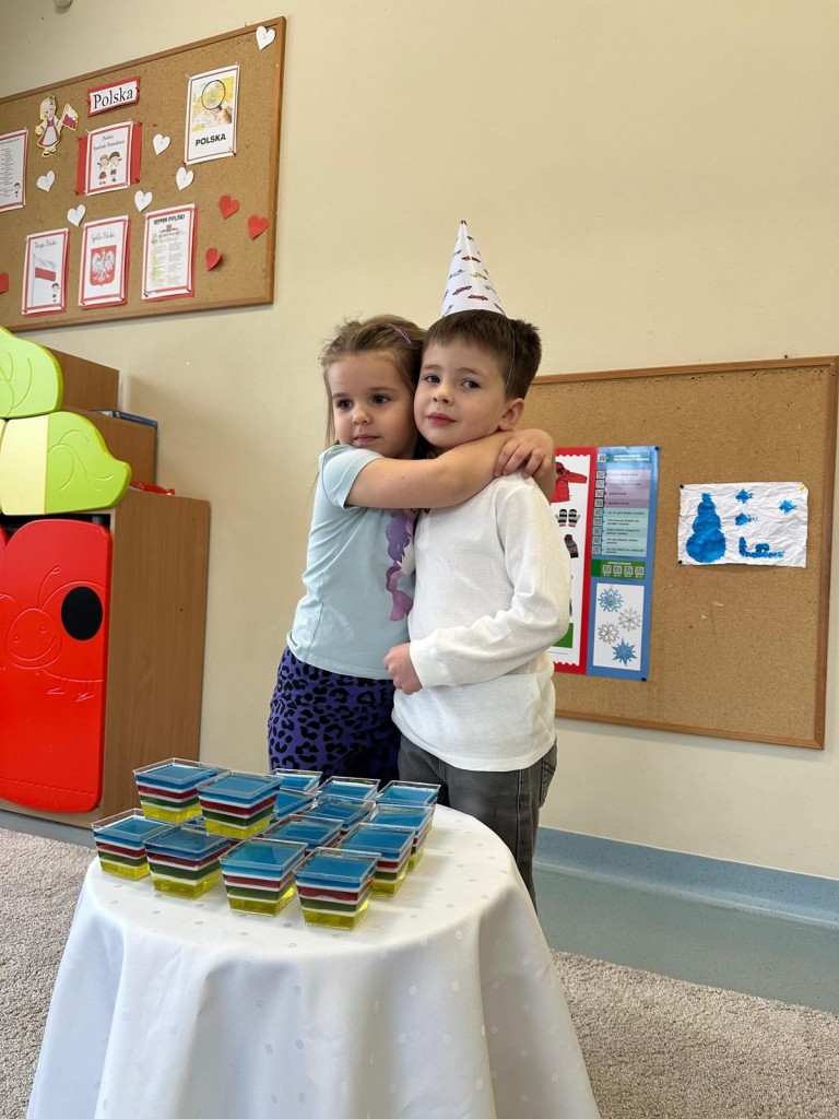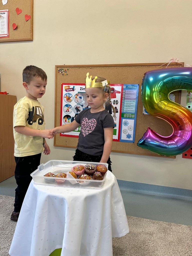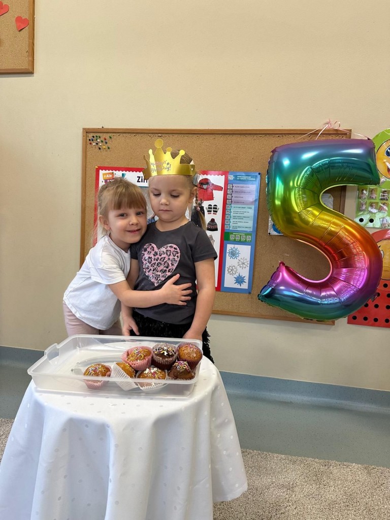 W styczniu w naszej grupie odbyło się radosne świętowanie urodzin Kuby i Zuzi, którzy jako pierwsi w grupie wkroczyli w erę 5-latków. Były to wyjątkowe dla nich dni pełne uśmiechów, dobrej zabawy i wspólnej radości. Złożyliśmy solenizantom serdeczne życzenia i wspólnie odśpiewaliśmy „Sto lat”. Kuba i Zuzia z dumą przyjęli urodzinowe życzenia i pocześtowali nas słodkim co nieco.