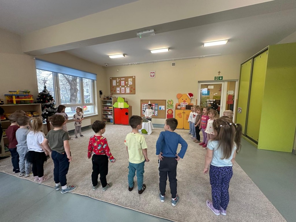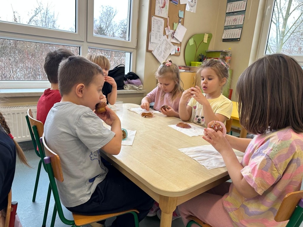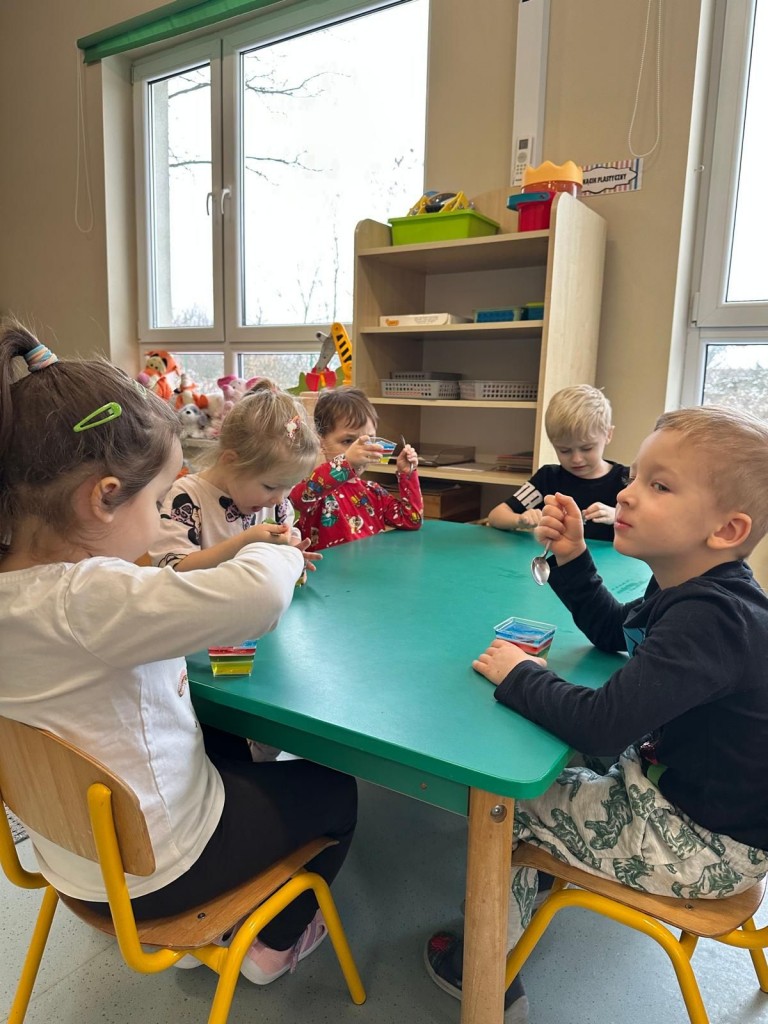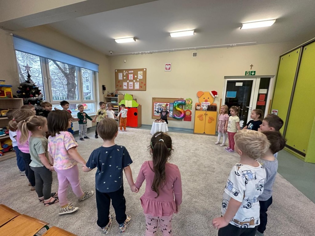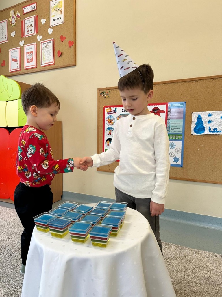 W styczniu w naszej grupie odbyło się radosne świętowanie urodzin Kuby i Zuzi, którzy jako pierwsi w grupie wkroczyli w erę 5-latków. Były to wyjątkowe dla nich dni pełne uśmiechów, dobrej zabawy i wspólnej radości. Złożyliśmy solenizantom serdeczne życzenia i wspólnie odśpiewaliśmy „Sto lat”. Kuba i Zuzia z dumą przyjęli urodzinowe życzenia i pocześtowali nas słodkim co nieco.