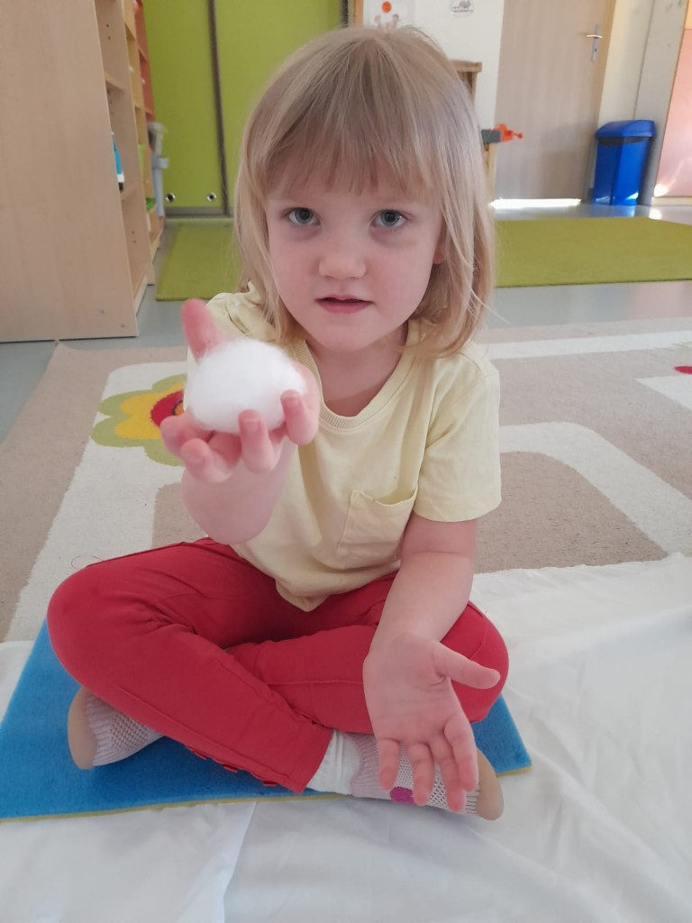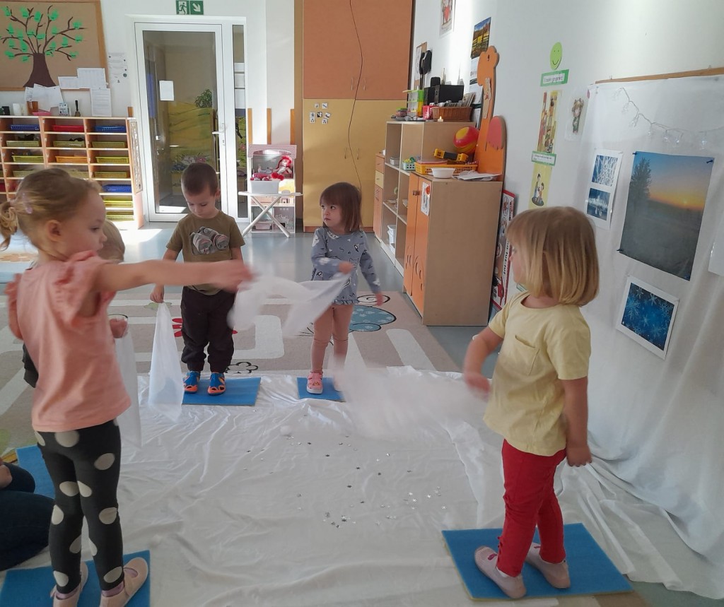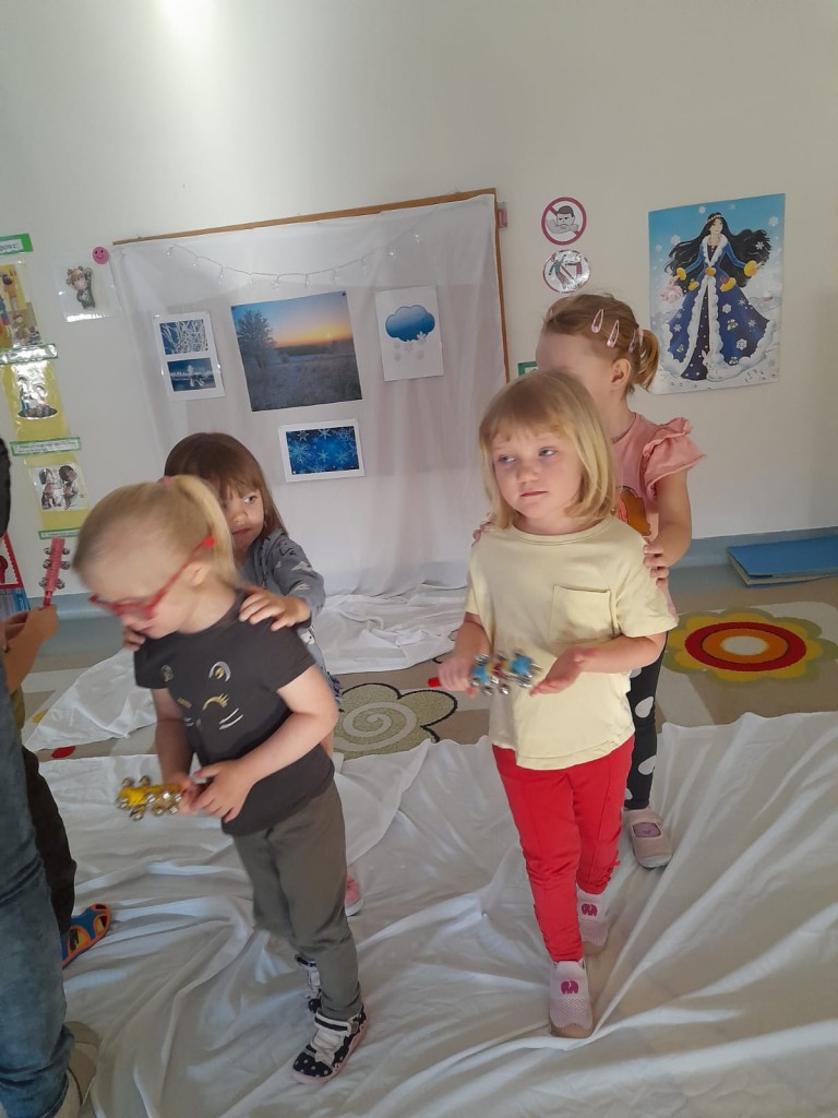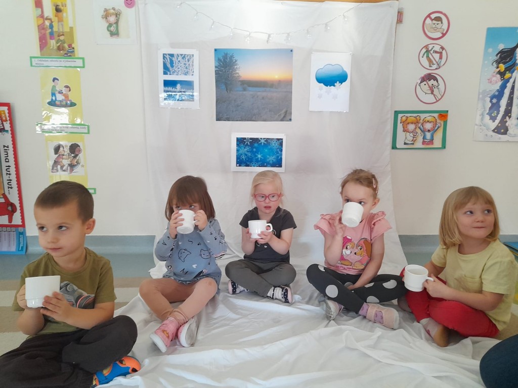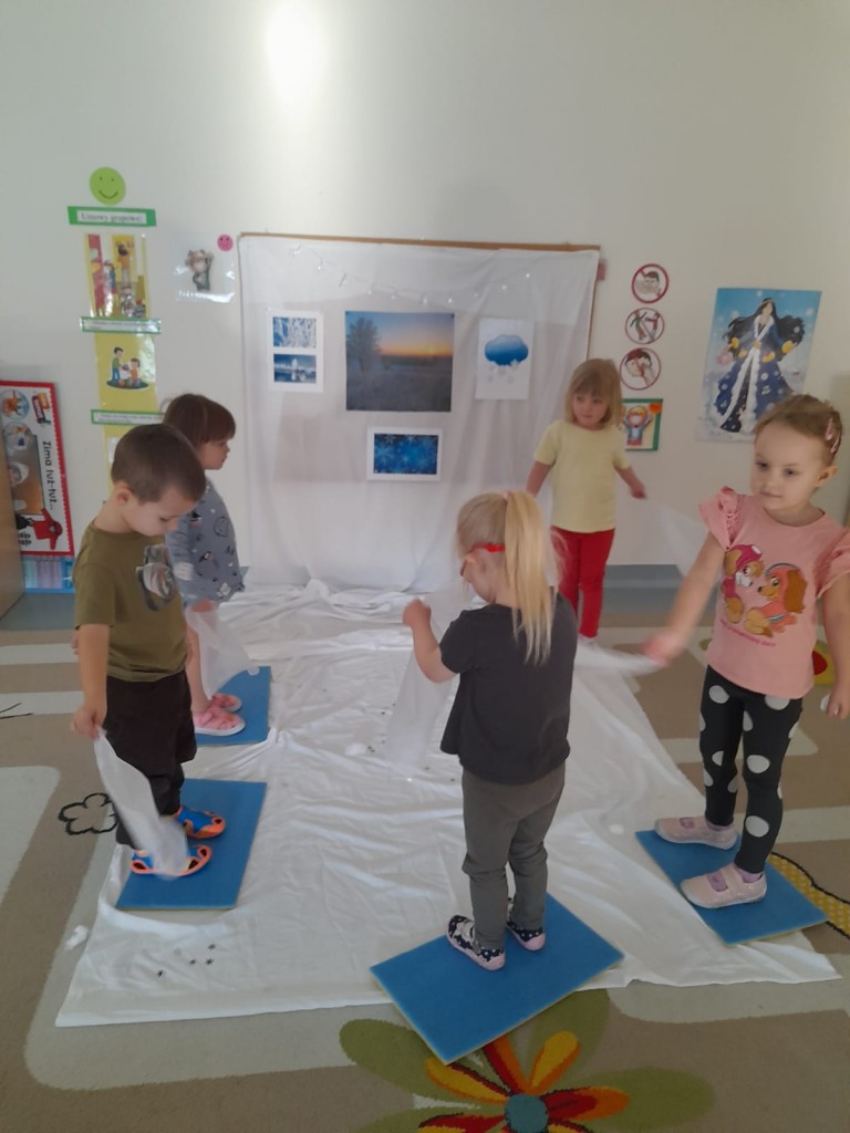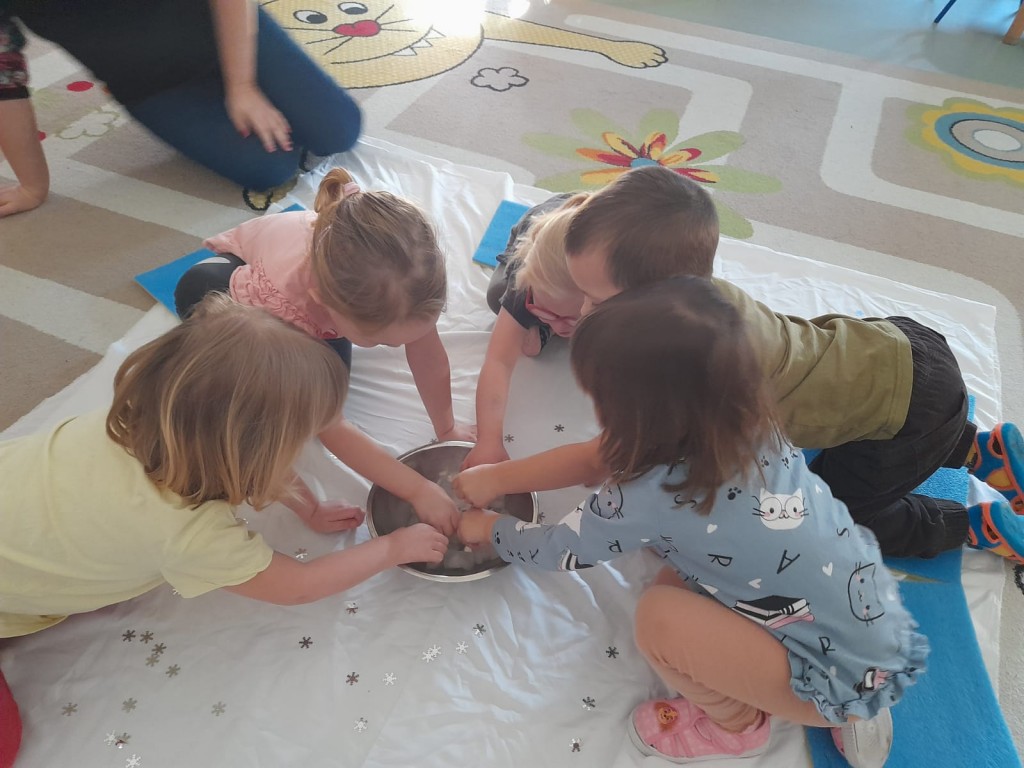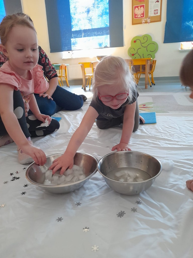 W trzecim tygodniu stycznia wieloma zmysłami poznawaliśmy zimę. Otoczeni kolorem białym, który symbolizuje śnieg oraz niebieskim kojarzącym się z dalą nieba i spokojem, bawiliśmy się wodą w stanie ciekłym i stałym. Woda dostarczyła nam wrażeń dotykowych i termicznych. Zmysł węchu pobudziliśmy mroźnym zapachem mięty, a zmysł smaku herbatką miętową z kostką lodu. Podczas zimowej przejażdżki „sanną” towarzyszyły nam dźwięki dzwoneczków.