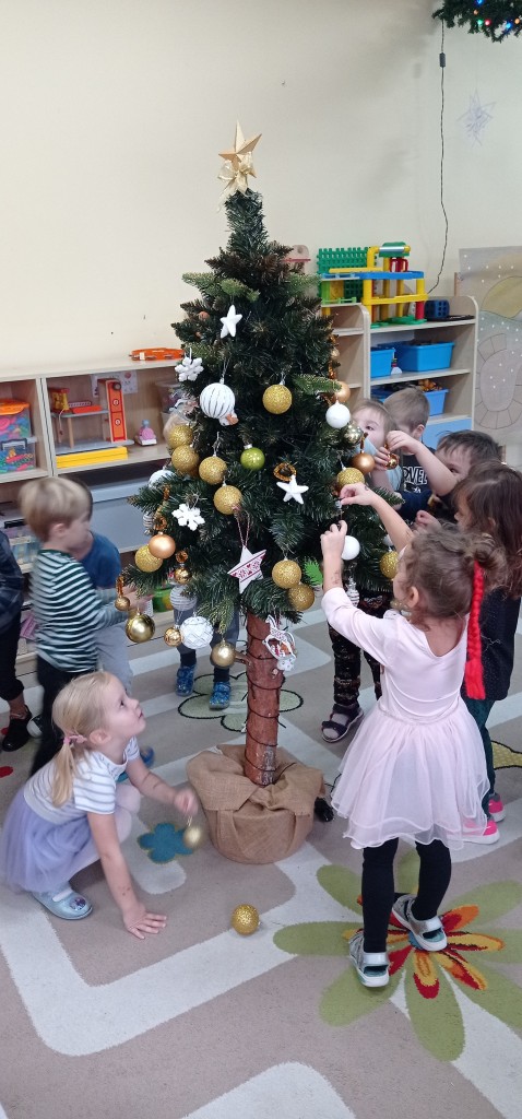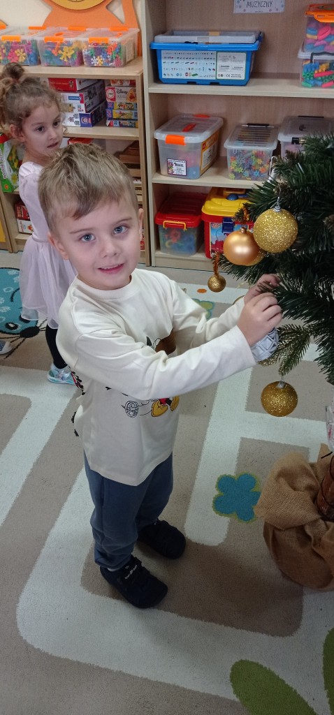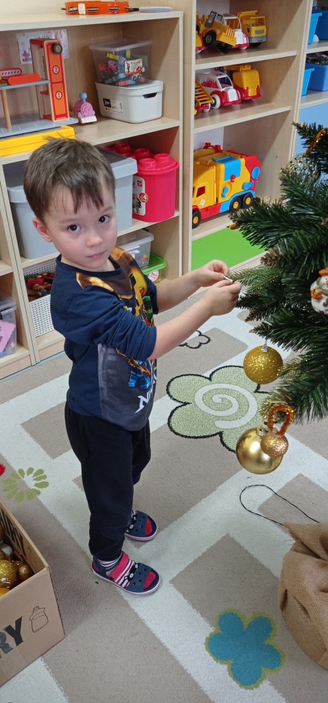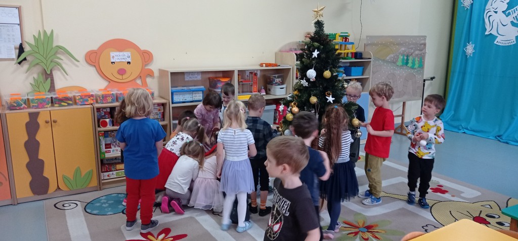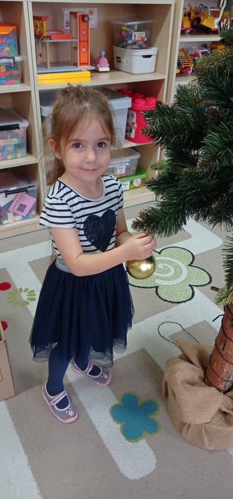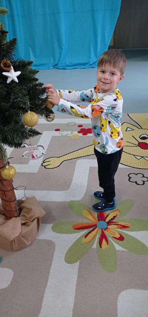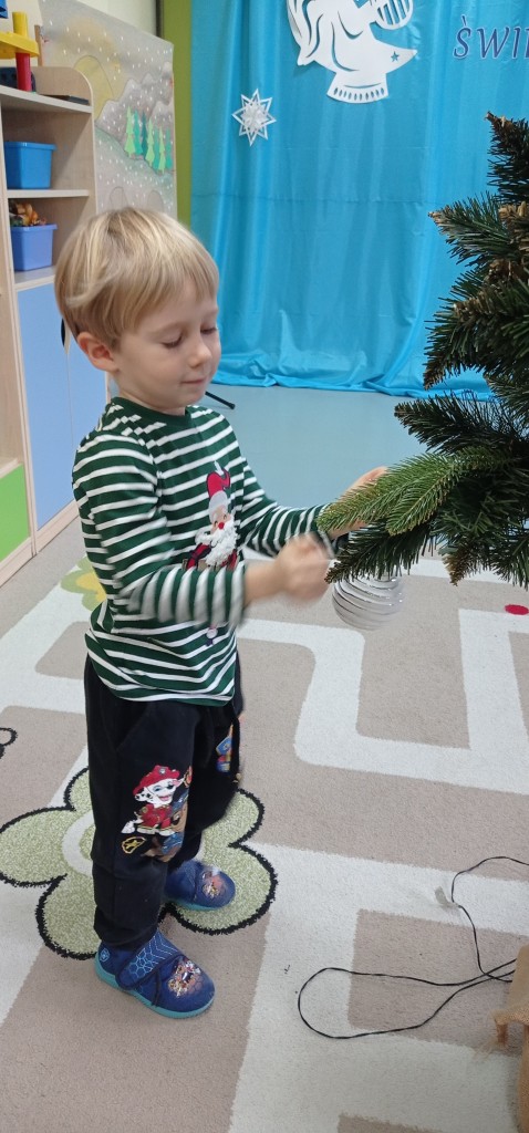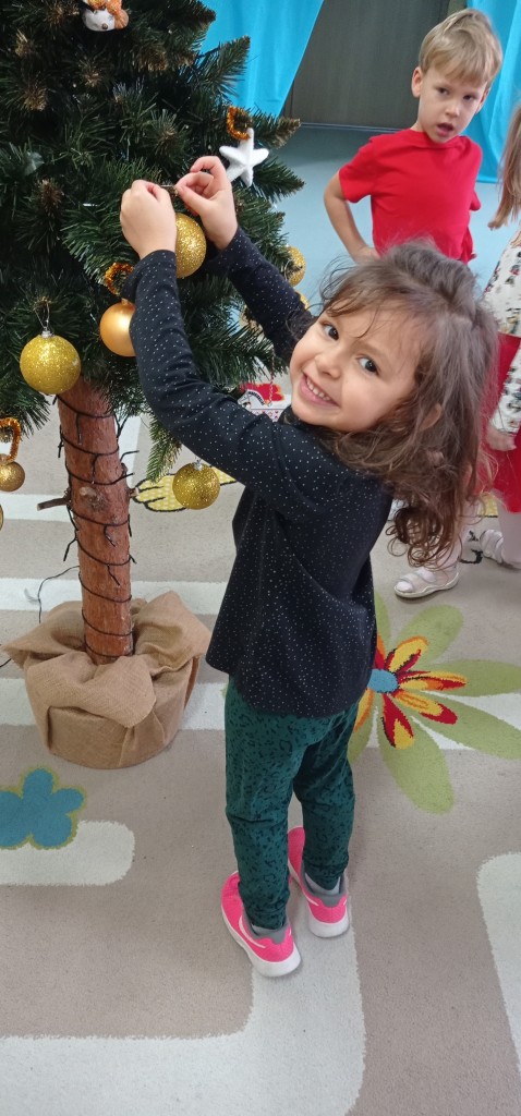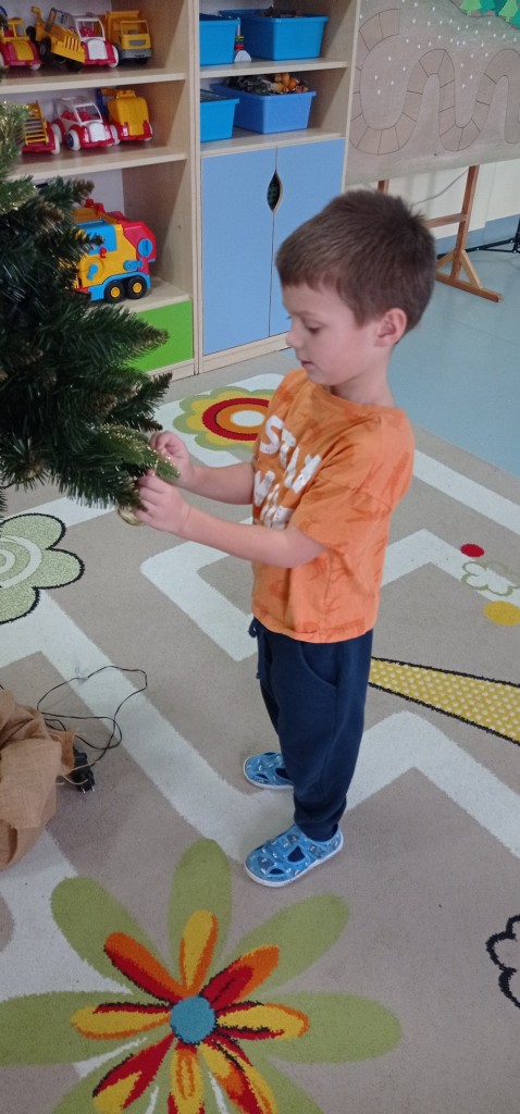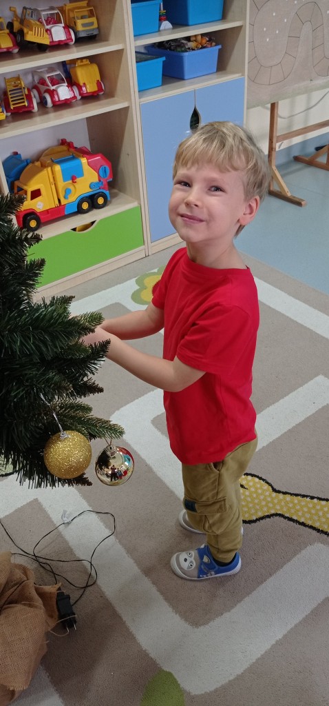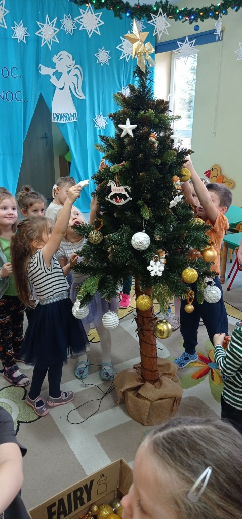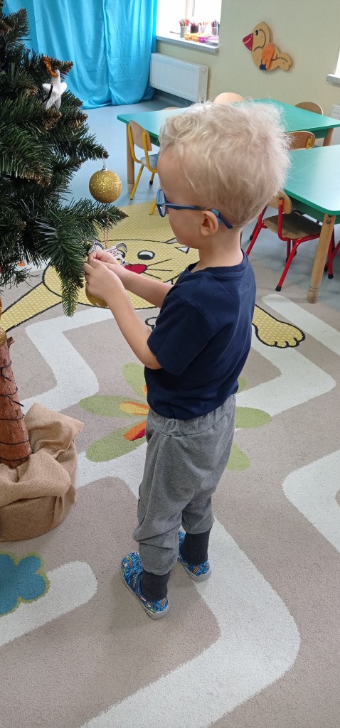 Nie zabrakło także dekorowania świątecznego drzewka. Przy dźwiękach kolęd nasza choinka została kolorowo ustrojona i nadaje naszej sali świątecznego charakteru.