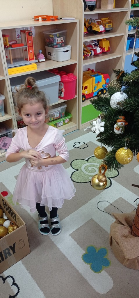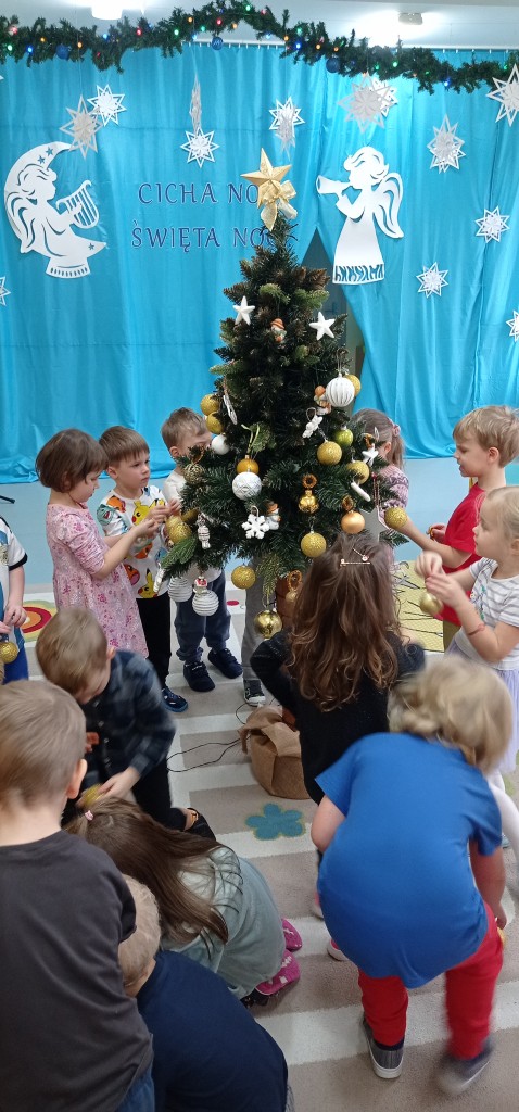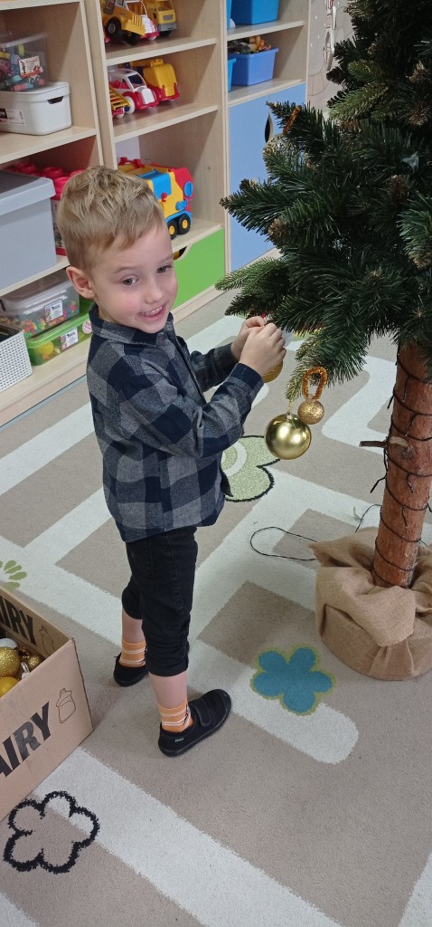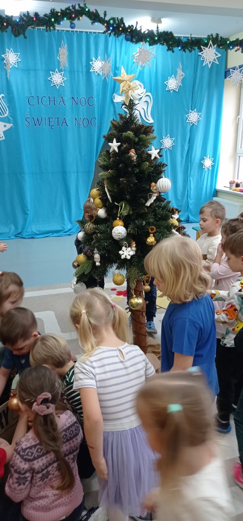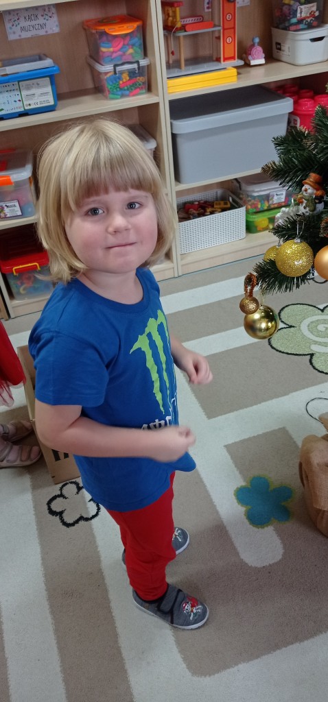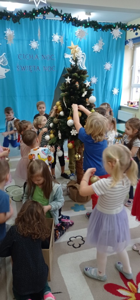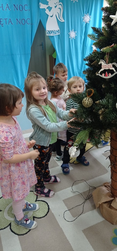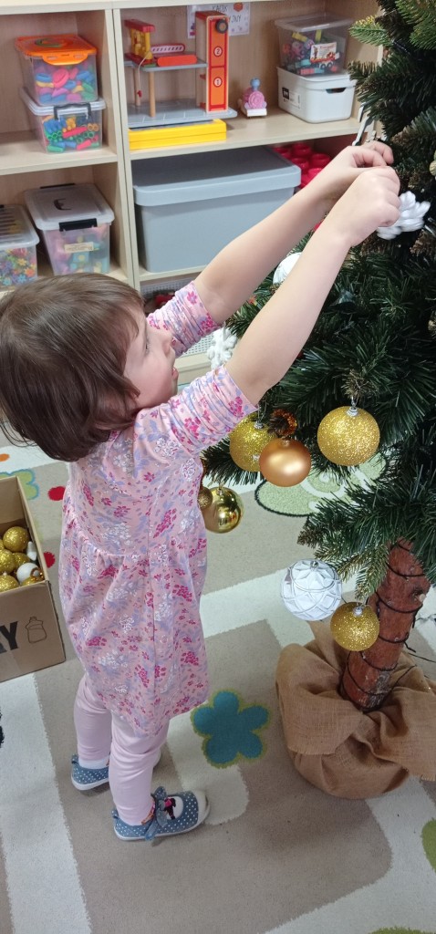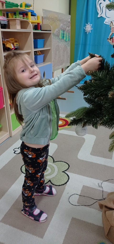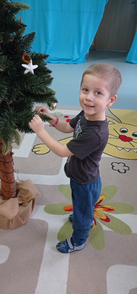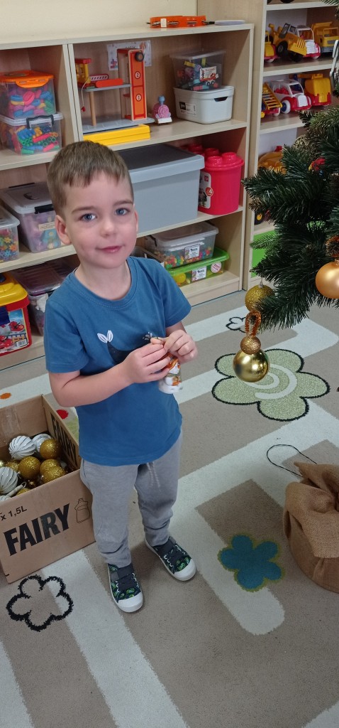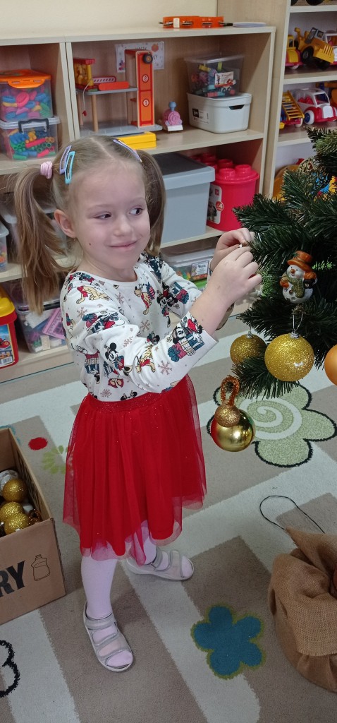 Nie zabrakło także dekorowania świątecznego drzewka. Przy dźwiękach kolęd nasza choinka została kolorowo ustrojona i nadaje naszej sali świątecznego charakteru.