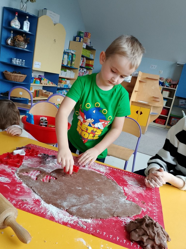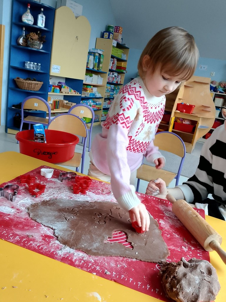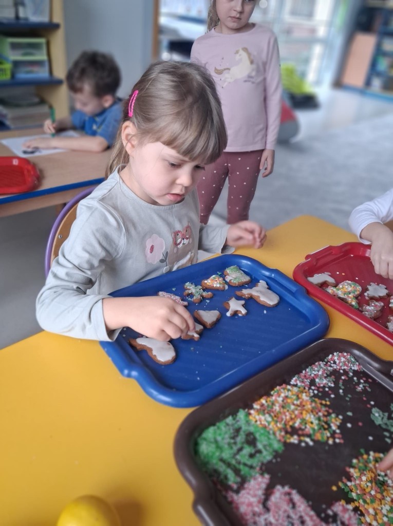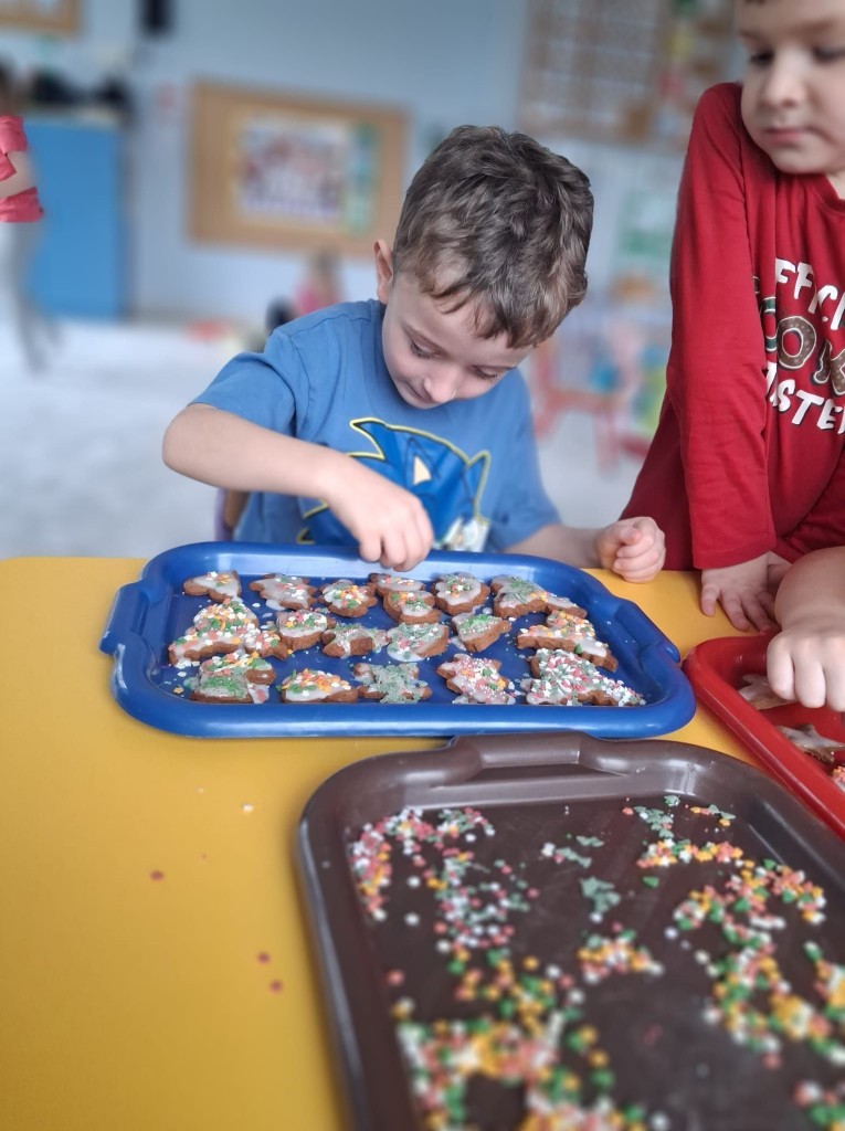 Grudzień w przedszkolu to cudowny czas wypełniony przygotowaniami oraz oczekiwania nadchodzących świąt Bożego Narodzenia. W tym roku nasze świąteczne przygotowania rozpoczęliśmy już 8 grudnia od upieczenia pierniczków. Każdy z nas pomagał Pani w przygotowaniu ciasta na pierniki oraz, tuż po jego wyrobieniu i rozwałkowaniu, samodzielnie wykrawał wybrane przez siebie wzory na foremkach. Pierniczki wyszły przepyszne!We środę, 10 grudnia, przygotowaliśmy lukier i udekorowaliśmy nim, według własnej inwencji twórczej, upieczone pierniczki. Na koniec posypaliśmy je kolorową posypką. Tak przygotowane pierniczki mogliśmy spakować, aby wręczyć je naszym rodzicom po przygotowanej przez nas uroczystości jasełkowej.
