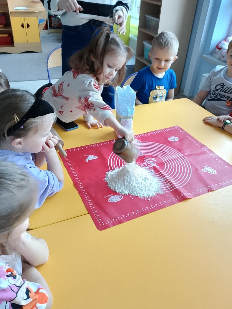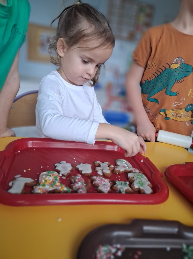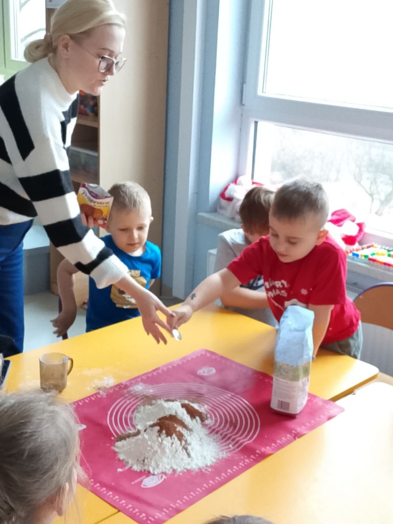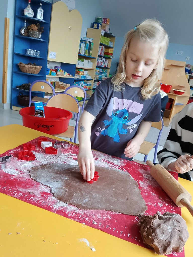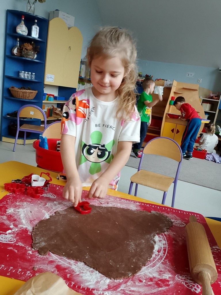 Grudzień w przedszkolu to cudowny czas wypełniony przygotowaniami oraz oczekiwania nadchodzących świąt Bożego Narodzenia. W tym roku nasze świąteczne przygotowania rozpoczęliśmy już 8 grudnia od upieczenia pierniczków. Każdy z nas pomagał Pani w przygotowaniu ciasta na pierniki oraz, tuż po jego wyrobieniu i rozwałkowaniu, samodzielnie wykrawał wybrane przez siebie wzory na foremkach. Pierniczki wyszły przepyszne!We środę, 10 grudnia, przygotowaliśmy lukier i udekorowaliśmy nim, według własnej inwencji twórczej, upieczone pierniczki. Na koniec posypaliśmy je kolorową posypką. Tak przygotowane pierniczki mogliśmy spakować, aby wręczyć je naszym rodzicom po przygotowanej przez nas uroczystości jasełkowej.