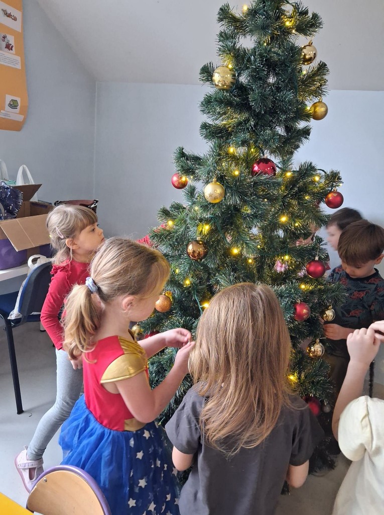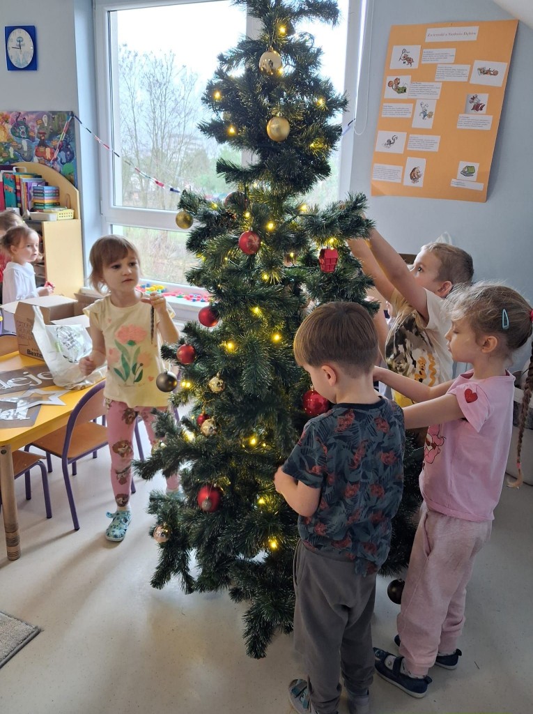 Zwieńczeniem naszych świątecznych przygotowań było przystrojenie sali na nadchodzące święta Bożego Narodzenia. Okna naszej sali udekorowały własnoręcznie wykonane przez nas kolorowe papierowe łańcuchy. A tuż obok naszej grupowej biblioteczki stanęła przepięknie ubrana choinka.