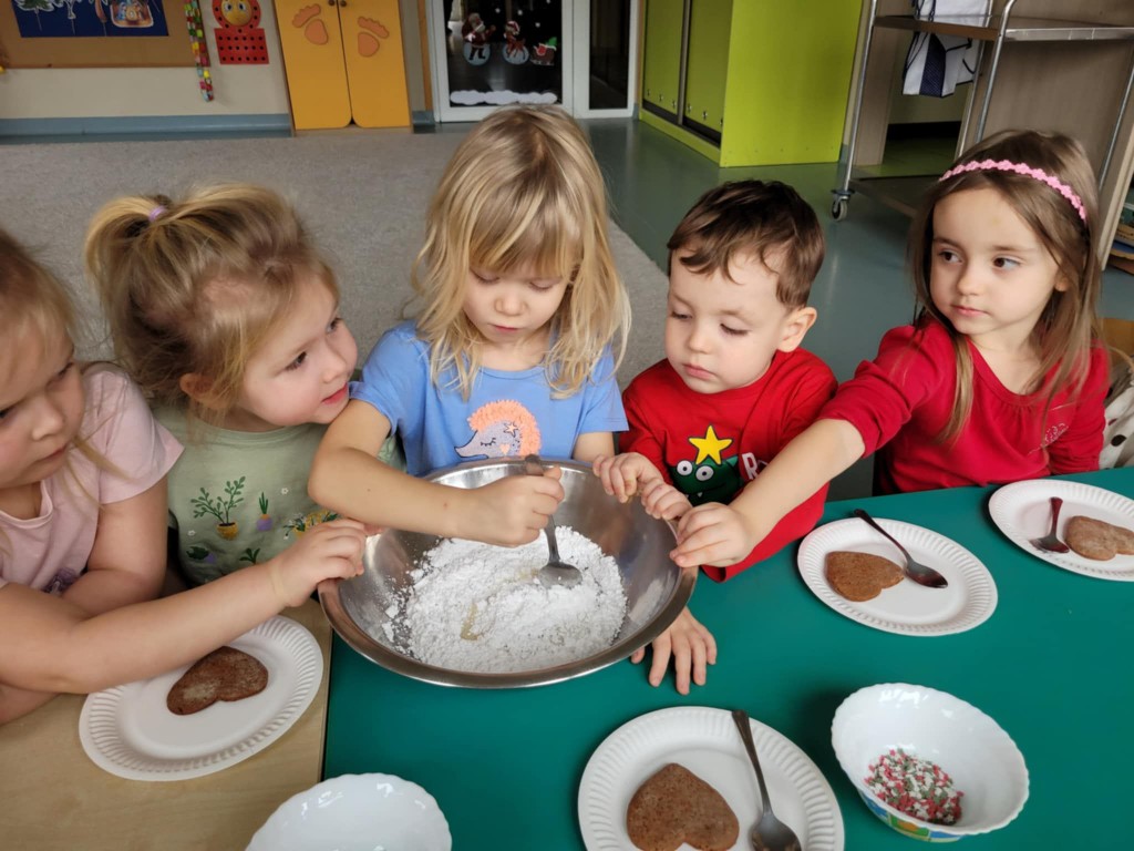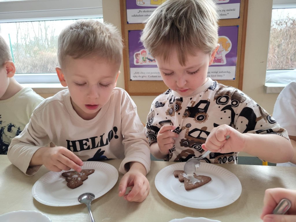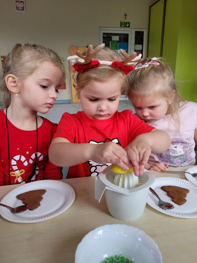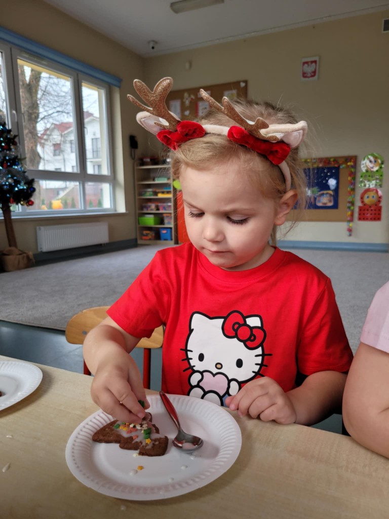 Chociaż do świąt zostało jeszcze trochę czasu, to już w przedszkolu czujemy atmosferę, że się zbliżają. Najpierw 6 grudnia przyszedł Mikołaj i rozdał prezenty, później pieczenie i ozdabianie pierniczków, ubieranie choinki oraz nadchodzi czas na przedstawienie – czas na Jasełka. Ćwiczymy nasze role oraz śpiewamy kolędy, wykonujemy prace plastyczne o tematyce świątecznej. Poznajemy tradycje i obyczaje związane z nadchodzącymi świętami. Tak więc w grudniu mamy dużo roboty, której towarzyszy świąteczny nastrój.