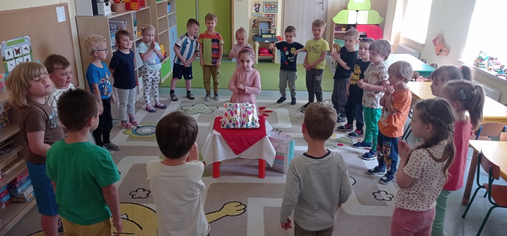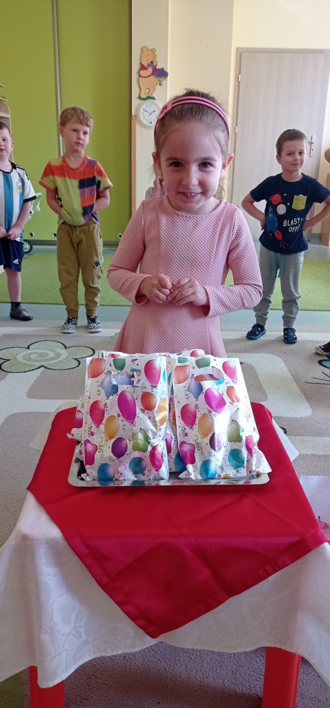 Urodziny to czas wielkiej radości ponieważ, każdy przedszkolak może poczuć się w tym dniu wyjątkowo. Uroczystość rozpoczynamy tradycyjnie od odśpiewania znanej nam piosenki: ,,Sto lat, sto lat…’’ po czym dzieci i panie z życzliwością składają jubilatowi życzenia. Podczas urodzin nie brakuje nam też słodkości, które osładzają nam wspólny czas. W maju swoje urodziny obchodziła Natalia.
