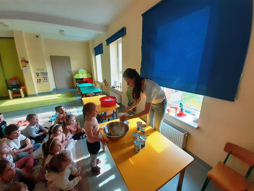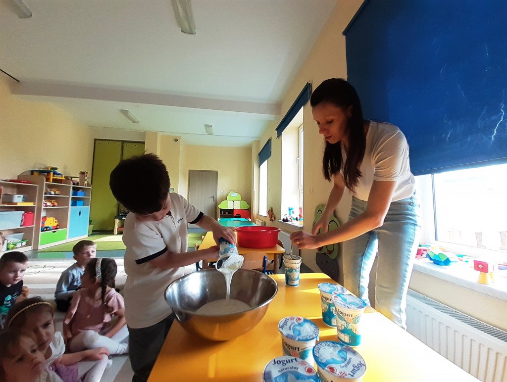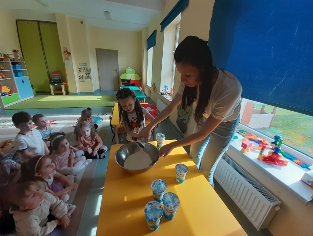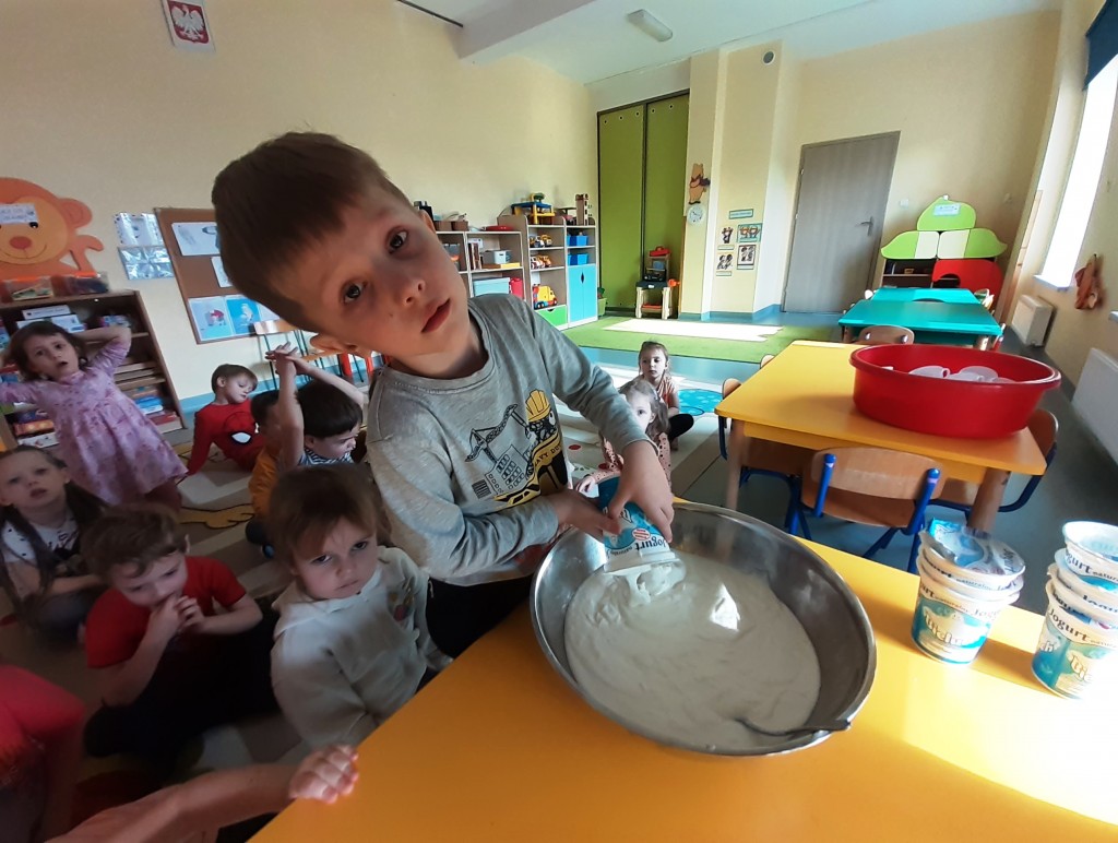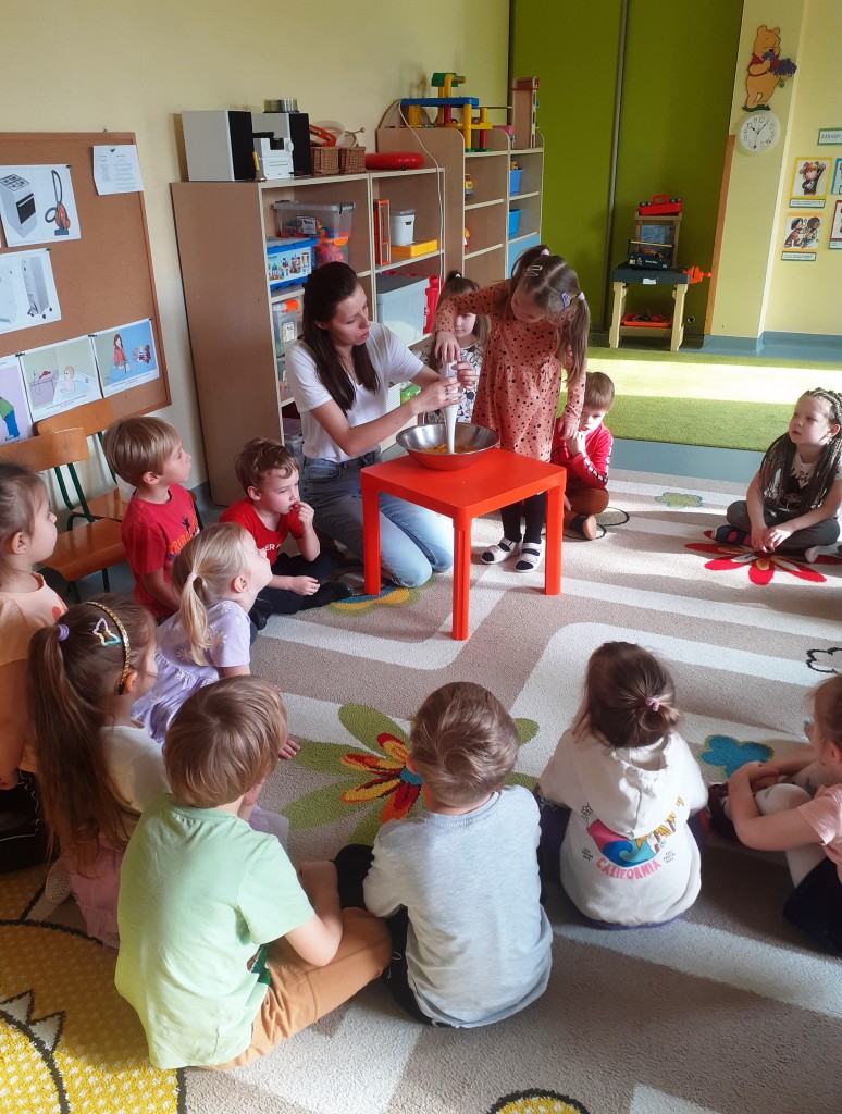 Realizując tematykę tygodnia związaną z urządzeniami elektrycznymi mieliśmy możliwość poszerzyć wiedzę na ich temat. Poznawaliśmy nazwy, wygląd i działanie urządzeń elektrycznych, które ułatwiają nam życie codzienne. Działanie niektórych z nich poznawaliśmy w praktyce- odkurzacz, blender. Blender wykorzystaliśmy do zrobienia jogurtu naturalnego o smaku brzoskwiniowym. W tym tygodniu również mogliśmy zaprojektować lampkę nocną wykorzystując do tego skrawki kolorowych tkanin.