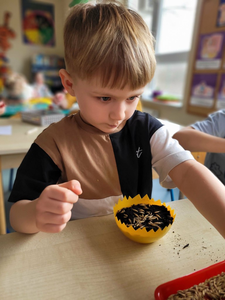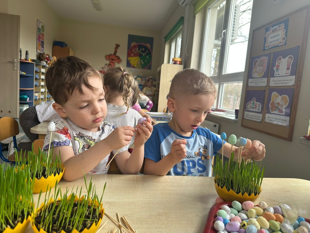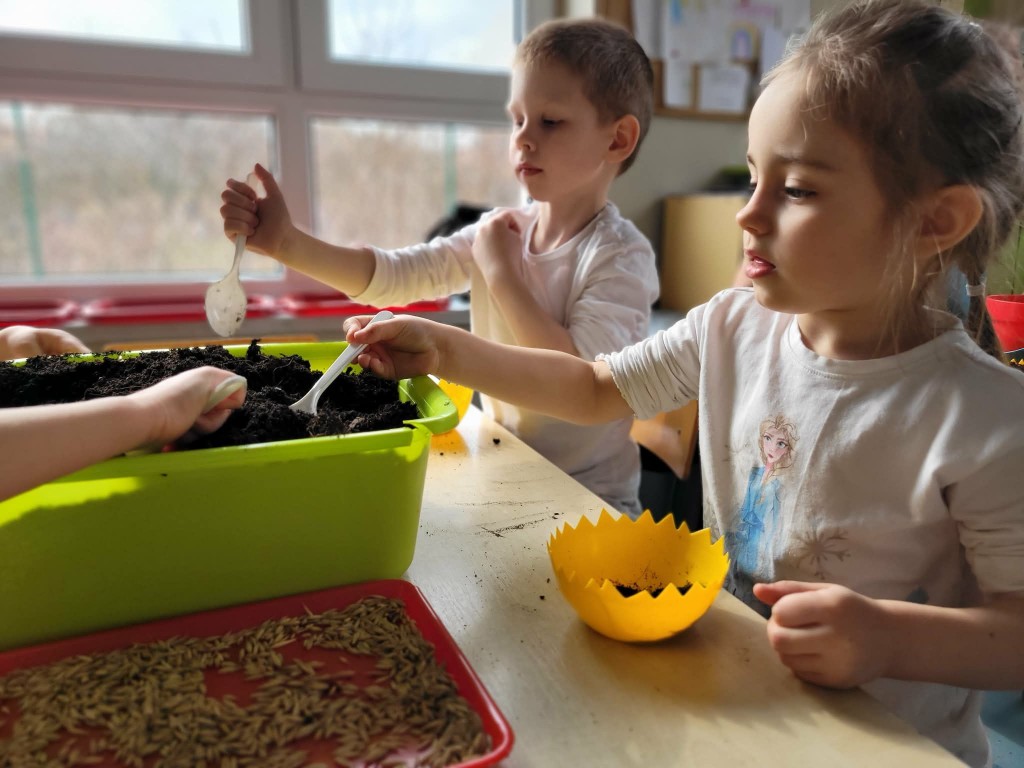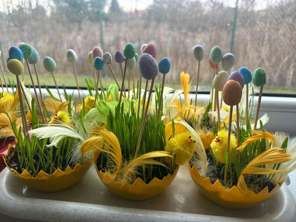 W ostatnich dniach w naszej grupie panowała prawdziwie wiosenna i świąteczna atmosfera. W ramach przygotowań do Świąt Wielkanocnych posialiśmy owies, ucząc się przy tym cierpliwości i systematycznej troski o rośliny. Każdego dnia z ciekawością obserwowaliśmy, jak z małych ziarenek wyrastają zielone źdźbła.
