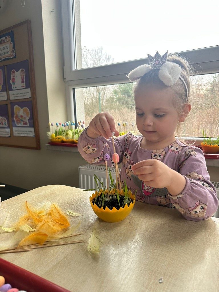 Gdy owies pięknie wyrósł, wykorzystaliśmy go do stworzenia wielkanocnych stroików. Ozdabialiśmy swoje kompozycje, rozwijając wyobraźnię i zdolności manualne. Powstały wyjątkowe, kolorowe dekoracje, które będą zdobić nasze rodzinne świąteczne stoły.