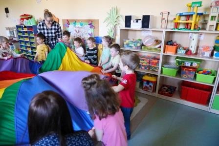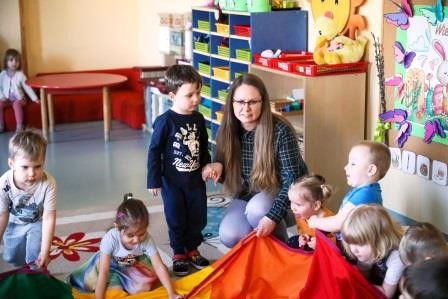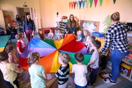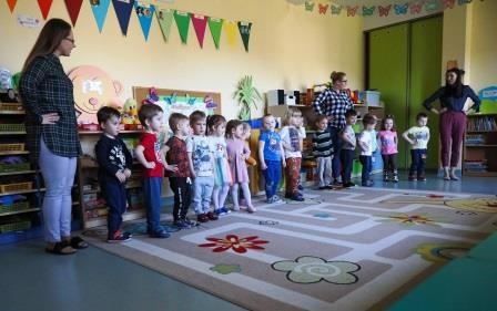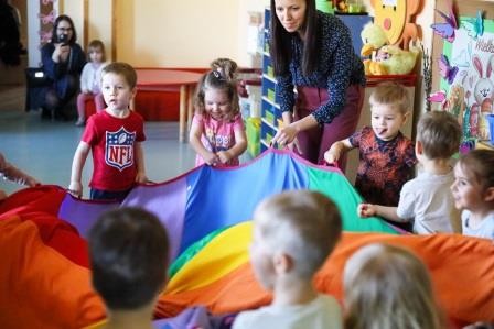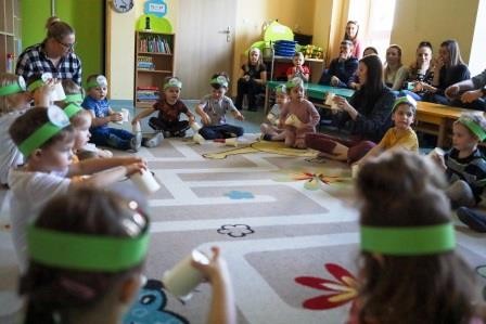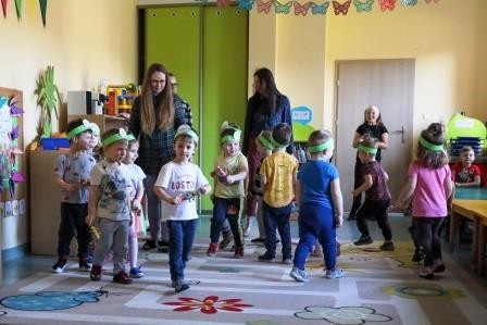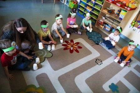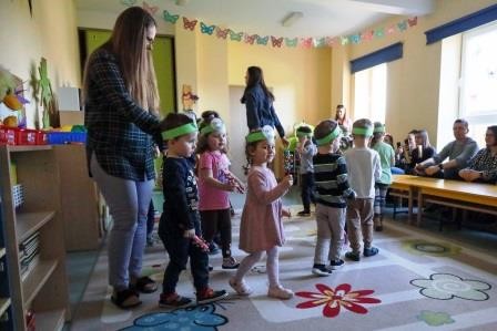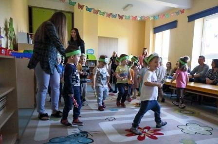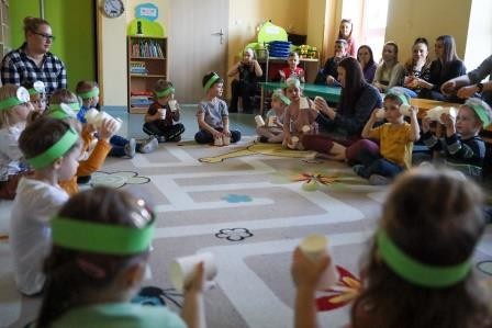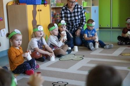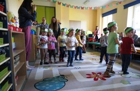 29 marca w naszej grupie odbyły się zajęcia otwarte z zakresu umuzykalnienia połączone z warsztatem plastycznym pt. ,,Wielkanoc”. Miło nam, że to przedświąteczne spotkanie odbyło się w licznym gronie rodziców. Tego dnia dzieci miały możliwość rozwijać swoje umiejętności muzyczne połączone z kultywowaniem tradycji związanych ze świętami Wielkiej Nocy. ,,Wielkanoc obchodzimy wraz z nadejściem wiosny. Wiosenne słońce budzi przyrodę z zimowego snu.’’ Tak też dzieci uczestniczyły w zabawie ruchowej z elementami ćwiczeń słuchowych do utworu wokalnego pt. „Słoneczko” z wykorzystaniem chusty animacyjnej. Kolejno zamieniły się w wielkanocne baranki ponieważ ,, Wielkanoc przywodzi nam na myśl baranka, którego dźwięczne brzmienie dzwonka można usłyszeć na wiosennej łące. Zabawa rytmiczna z wykorzystaniem dzwonków przyniosła wiele radości. ,,Wielkanoc to wspaniały, kolorowy i radosny czas. W czasie wiosennych świąt można usłyszeć różne dźwięki i melodie.’’ 3- latki wzięły udział w zabawie muzycznej z wykorzystaniem papierowych kubeczków. Przy dźwiękach melodii dzieci wykonywały za nauczycielem rytmiczne ruchy.