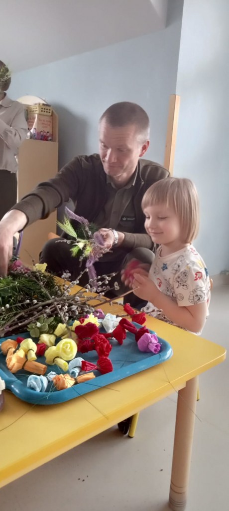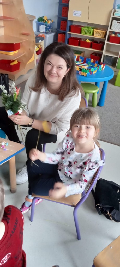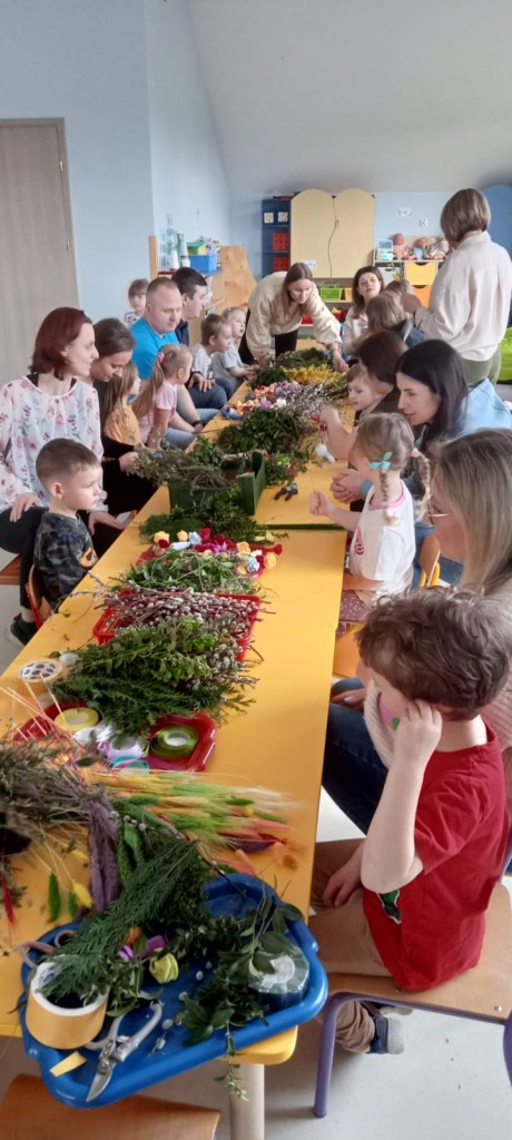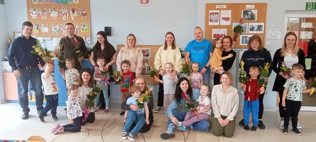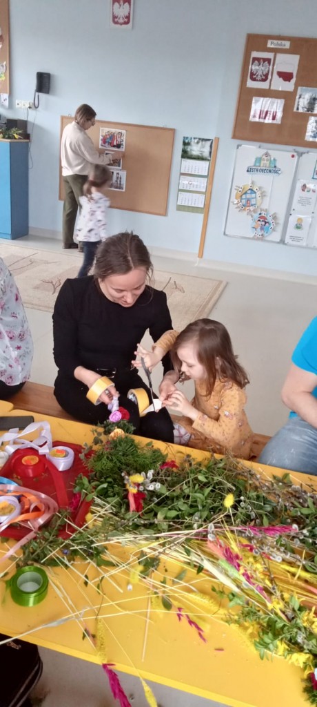 Warsztaty poprzedzone były krótkim wstępem - dzieci dowiedziały się jakie znaczenie miała tradycja robienia palm na Niedzielę Palmową - jako pamiątkę uroczystego wjazdu Pana Jezusa do Jerozolimy, ale również według tradycji ludowych chroniła ludzi i zwierzęta przed chorobami i nieszczęściami. Następnie, wspólnie z naszymi rodzicami, wzięliśmy się za własnoręczne wykonanie palmy wielkanocnej, którą będziemy mogli zanieść do kościoła w Niedzielę Palmową.
