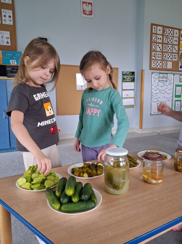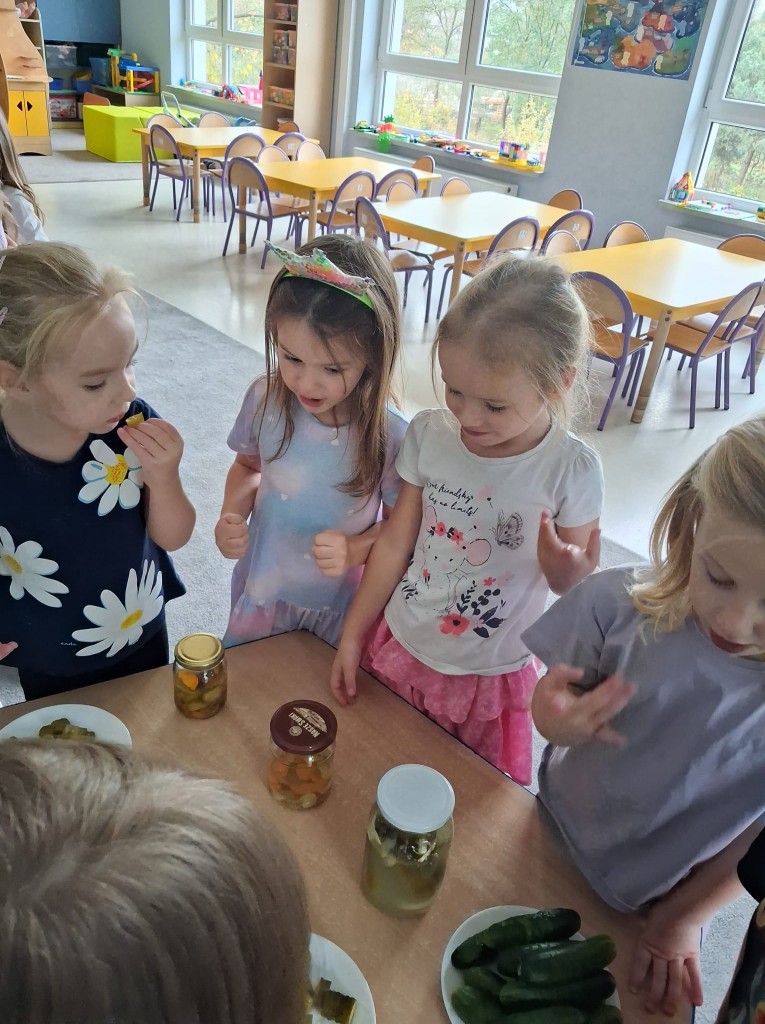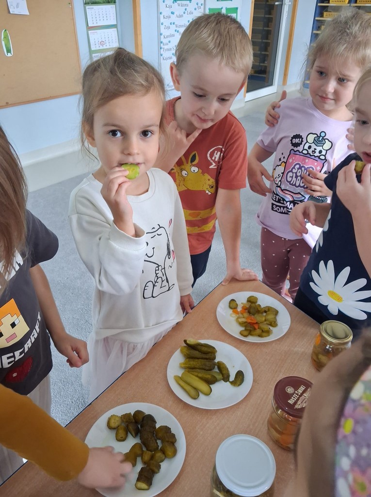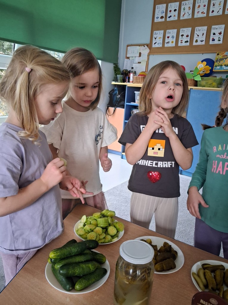 W obecnym roku przedszkolnym nasza grupa bierze udział w akcji pod patronatem „Bliżej przedszkola” promującym zdrowy styl życia, który nosi nazwę „Witaminki”. Każdego miesiąca będziemy poznawać jedno warzywo i jego zdrowotne właściwości. We środę, 22 października, naszym warzywnym bohaterem był ogórek Olek, który miał dla nas kilka zadań. W ramach zajęć poznaliśmy różne odmiany ogórków, oglądaliśmy jak wygląda po obraniu i co ma w środku. Kosztowaliśmy także ogórki surowe, kiszone, konserwowe oraz sałatkę z ogórków. Okazało się, że najbardziej smakowały nam ogórki kiszone. Na zakończenie wspólnie ukisiliśmy słój ogórków i już nie możemy się doczekać, aż będziemy mogli ich spróbować.