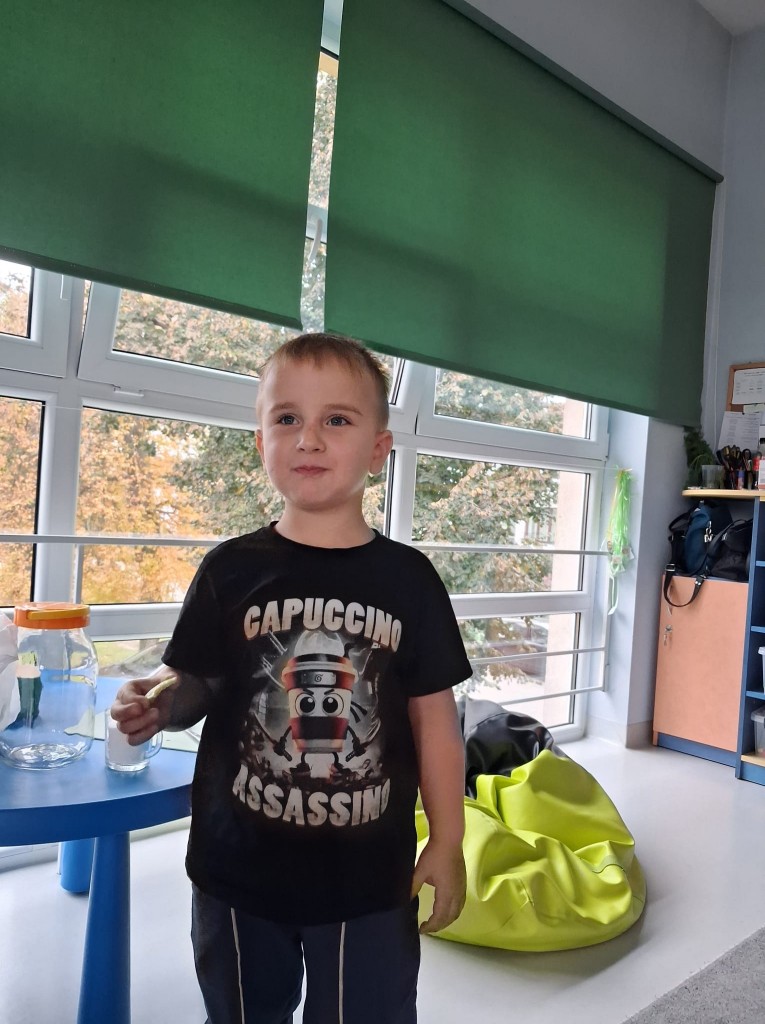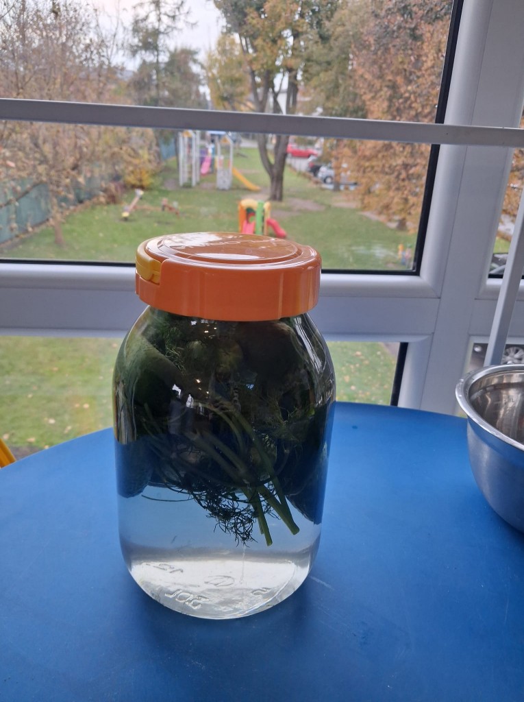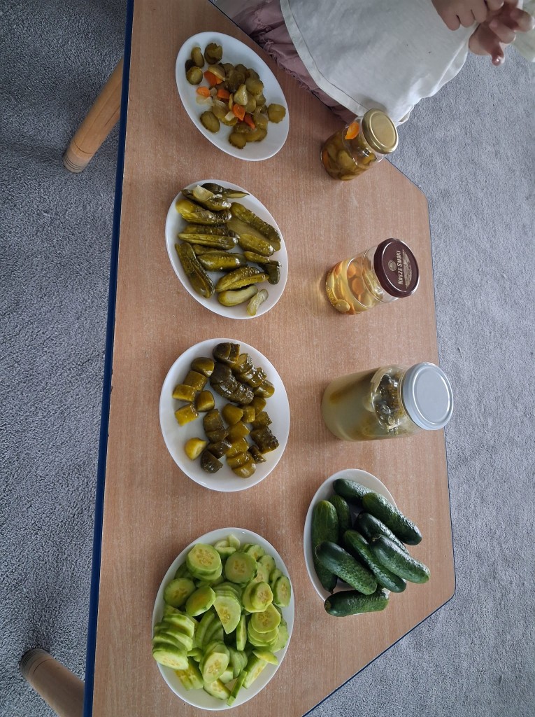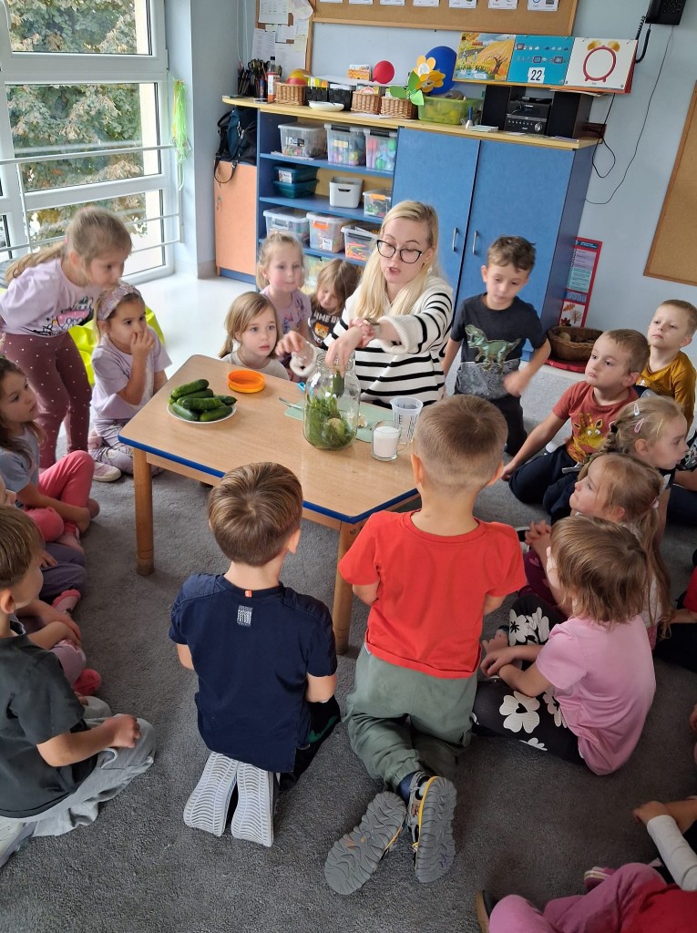 W obecnym roku przedszkolnym nasza grupa bierze udział w akcji pod patronatem „Bliżej przedszkola” promującym zdrowy styl życia, który nosi nazwę „Witaminki”. Każdego miesiąca będziemy poznawać jedno warzywo i jego zdrowotne właściwości. We środę, 22 października, naszym warzywnym bohaterem był ogórek Olek, który miał dla nas kilka zadań. W ramach zajęć poznaliśmy różne odmiany ogórków, oglądaliśmy jak wygląda po obraniu i co ma w środku. Kosztowaliśmy także ogórki surowe, kiszone, konserwowe oraz sałatkę z ogórków. Okazało się, że najbardziej smakowały nam ogórki kiszone. Na zakończenie wspólnie ukisiliśmy słój ogórków i już nie możemy się doczekać, aż będziemy mogli ich spróbować.