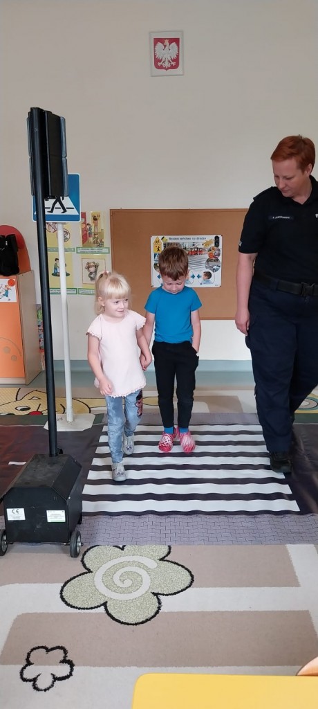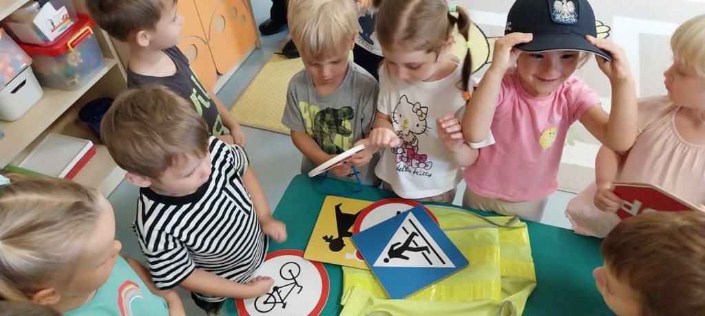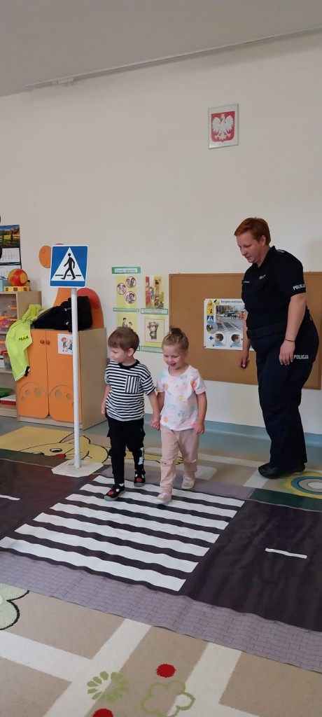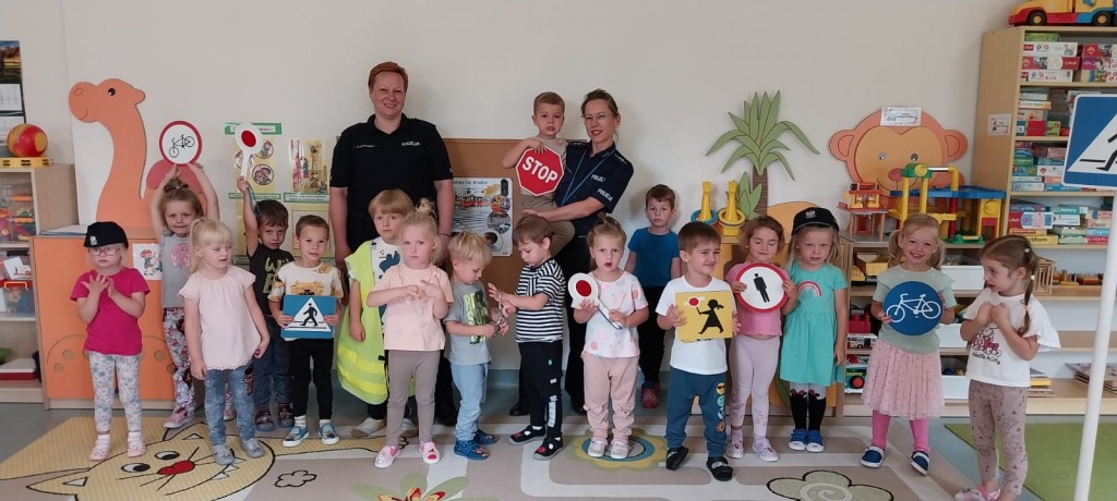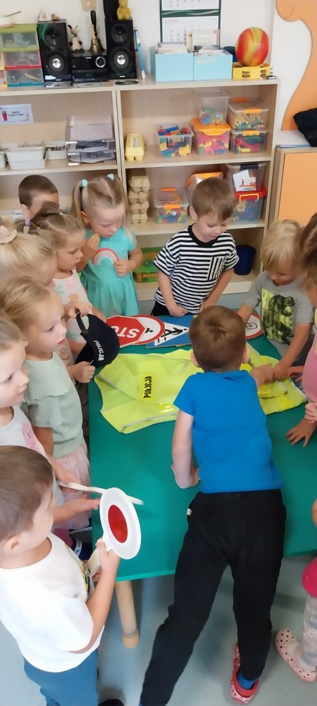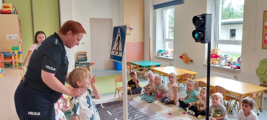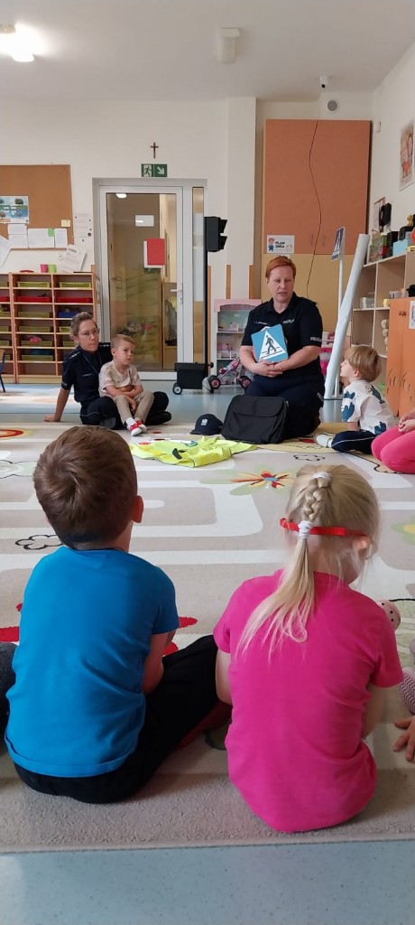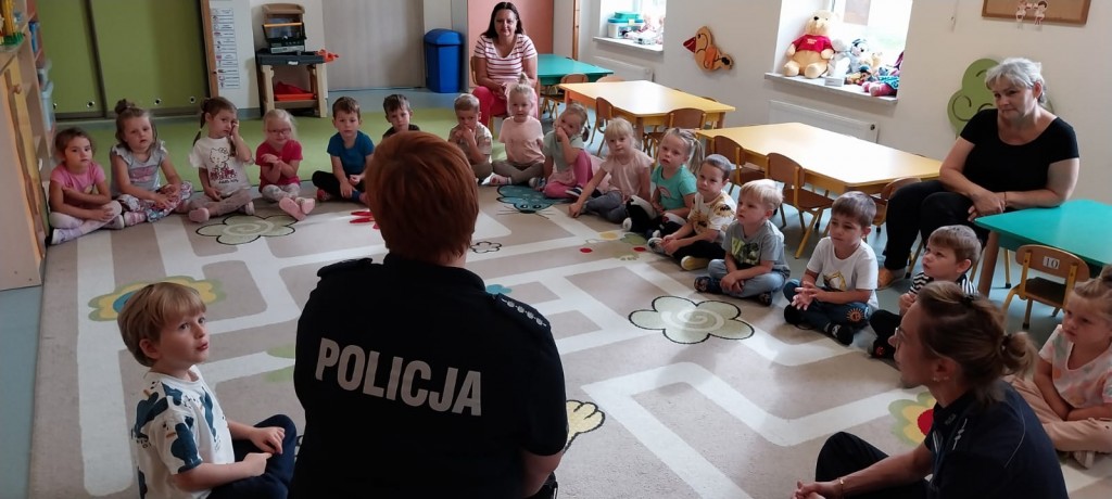 Dnia 16 września naszą grupę odwiedziły policjantki z Komendy Miejskiej Policji w Białej Podlaskiej. Spotkanie poświęcone było bezpiecznej drodze do przedszkola. Funkcjonariuszki w ciekawy i przystępny sposób opowiedziały dzieciom o zasadach przechodzenia przez jezdnię, roli sygnalizacji świetlnej oraz o tym, dlaczego warto nosić elementy odblaskowe. Przedszkolaki dowiedziały się również, jak ważne jest zachowanie ostrożności w drodze i uczyły się, jak reagować w sytuacjach zagrożenia. Dzieci z dużym zaangażowaniem brały udział w rozmowie, chętnie odpowiadały na pytania i dzieliły się swoimi doświadczeniami. Spotkanie było nie tylko pouczające, ale i bardzo atrakcyjne dla najmłodszych.
