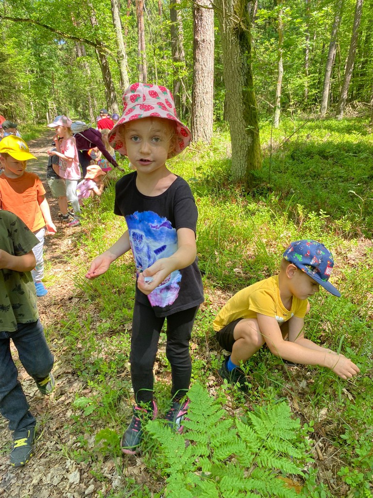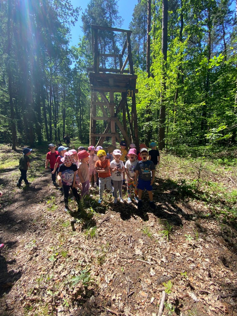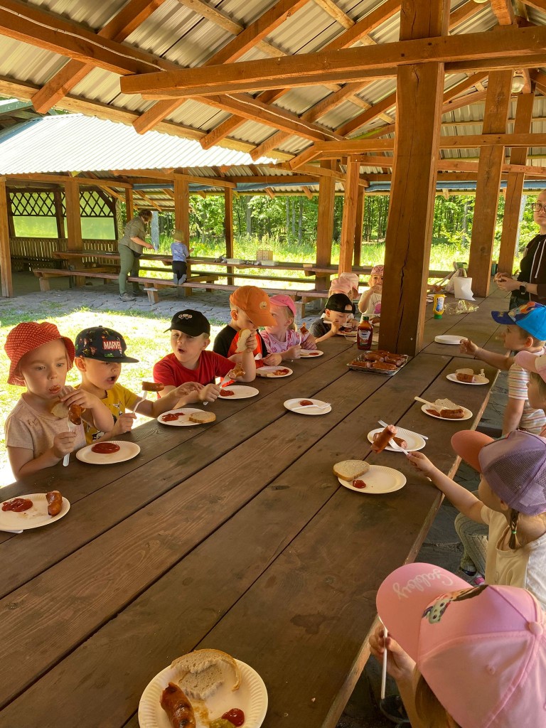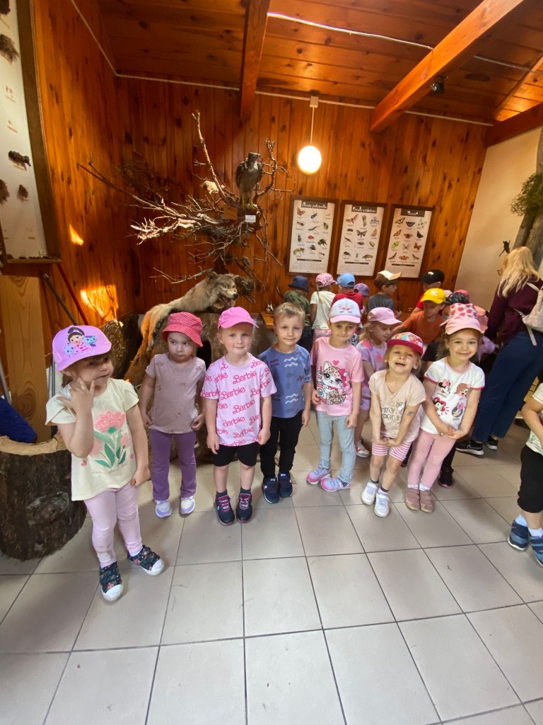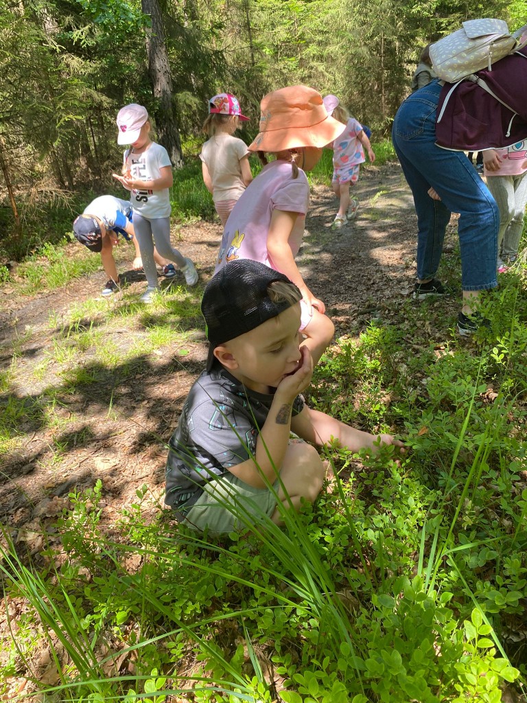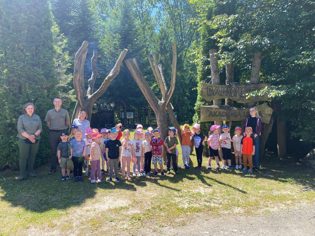 Na swoją pierwszą autokarową wycieczkę do Akademii Leśnej „Barwinek” w Nadleśnictwie Chotyłów wyruszyliśmy w dniu 26 czerwca po śniadaniu. Po przyjeździe na miejsce pani Małgosia oprowadziła nas po muzeum, a następnie zabrała na leśną ścieżkę edukacyjną. Podziwialiśmy piękną przyrodę, wsłuchiwaliśmy się w odgłosy lasu, liczyliśmy mijane mrowiska, a i tak największą atrakcją były jagody i poziomki prosto z krzaczka. Po długim spacerze nadszedł czas na odpoczynek i posiłek składający się z kiełbasek, drożdżówek z serem (własnoręcznie robionych przez panią Anię- mamę Tymona S.) oraz truskawek. Kto poczuł się najedzony ruszył do zabawy. Do przedszkola wracaliśmy zmęczeni, nieco brudni, ale pełni wrażeń.