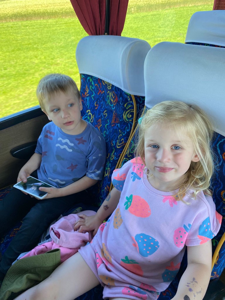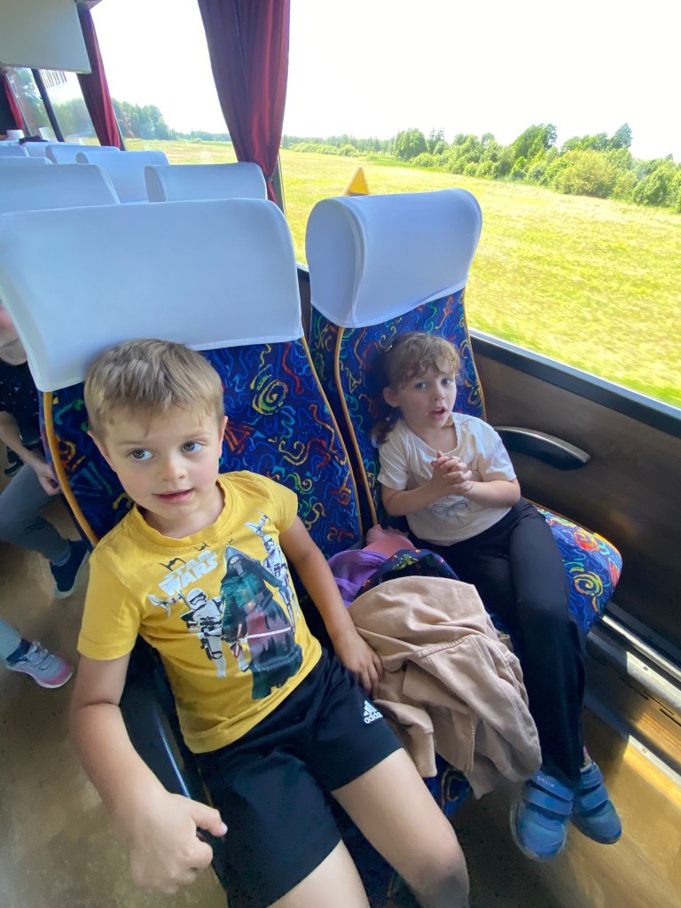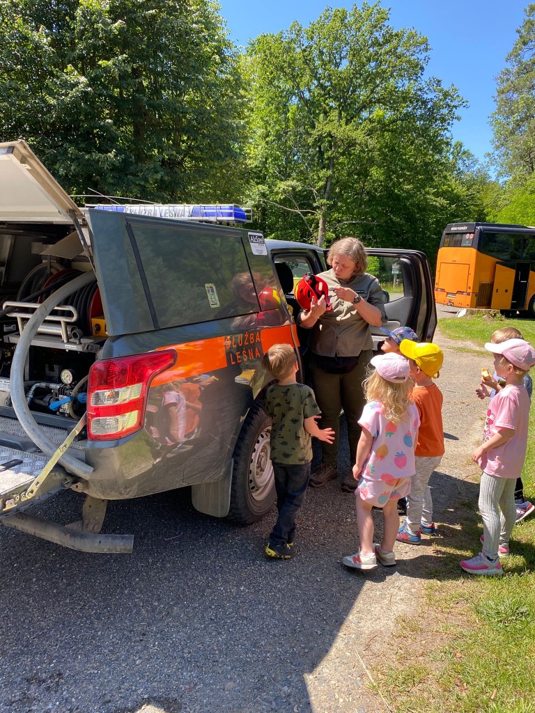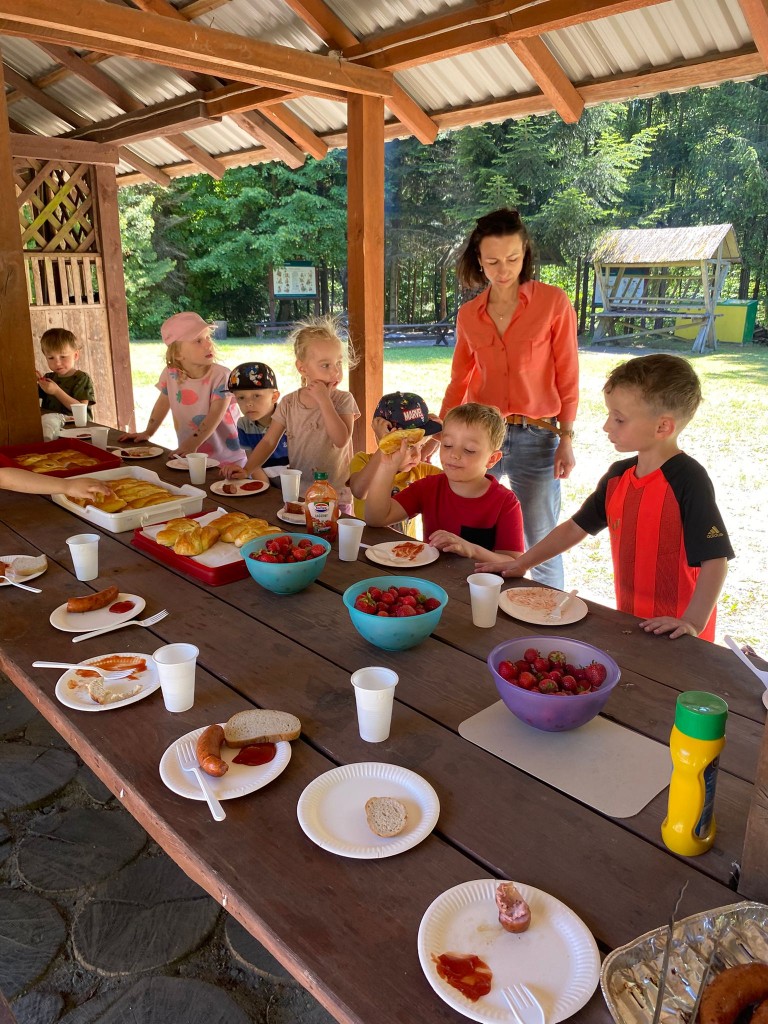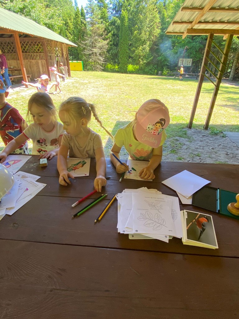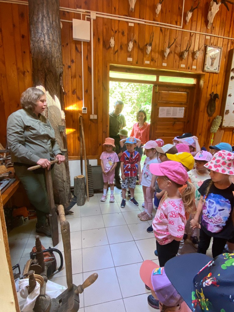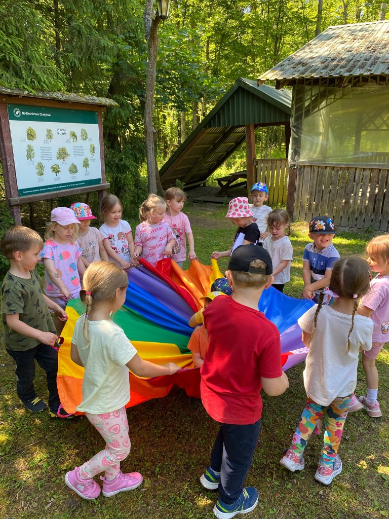 Na swoją pierwszą autokarową wycieczkę do Akademii Leśnej „Barwinek” w Nadleśnictwie Chotyłów wyruszyliśmy w dniu 26 czerwca po śniadaniu. Po przyjeździe na miejsce pani Małgosia oprowadziła nas po muzeum, a następnie zabrała na leśną ścieżkę edukacyjną. Podziwialiśmy piękną przyrodę, wsłuchiwaliśmy się w odgłosy lasu, liczyliśmy mijane mrowiska, a i tak największą atrakcją były jagody i poziomki prosto z krzaczka. Po długim spacerze nadszedł czas na odpoczynek i posiłek składający się z kiełbasek, drożdżówek z serem (własnoręcznie robionych przez panią Anię- mamę Tymona S.) oraz truskawek. Kto poczuł się najedzony ruszył do zabawy. Do przedszkola wracaliśmy zmęczeni, nieco brudni, ale pełni wrażeń.